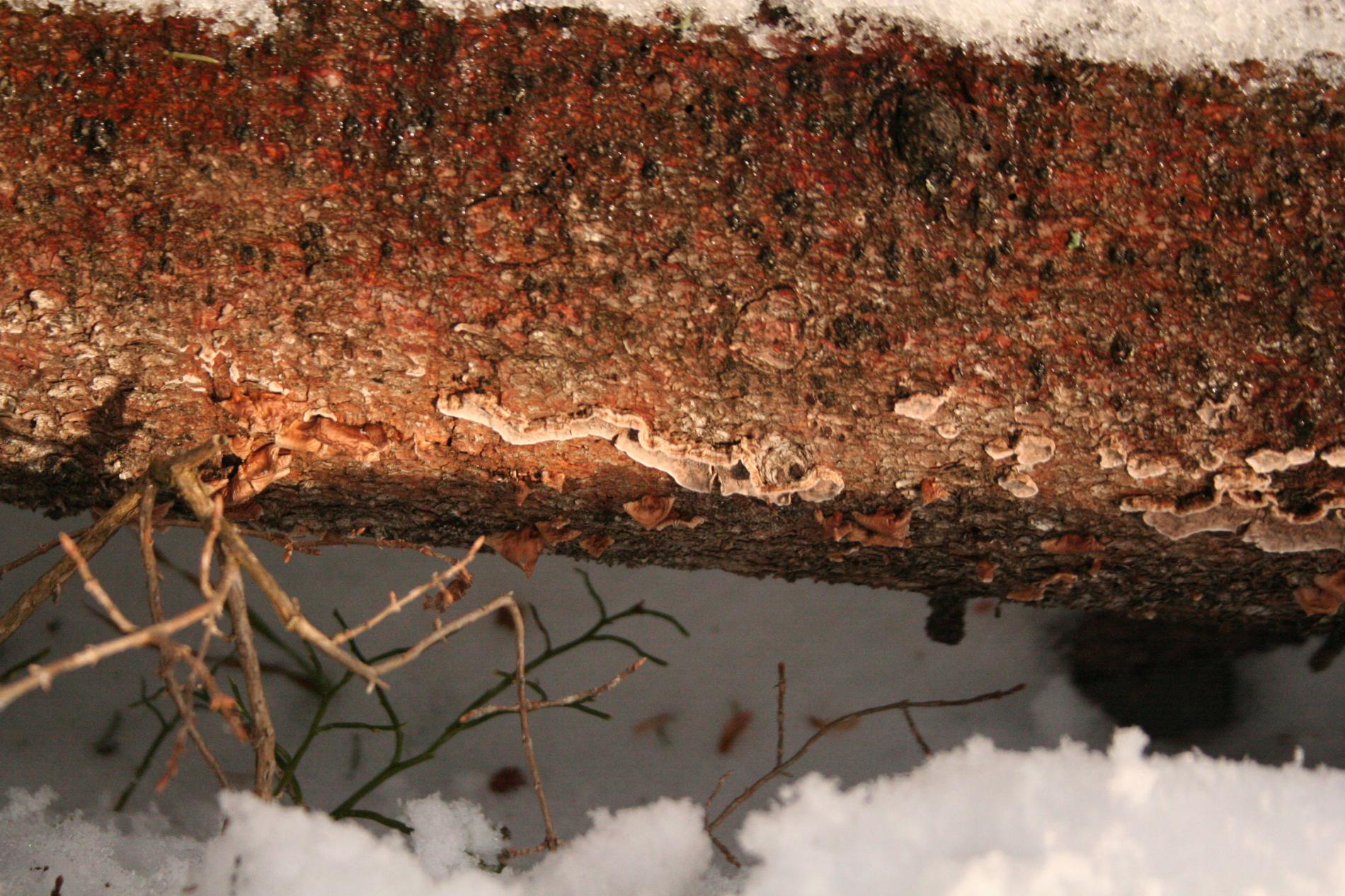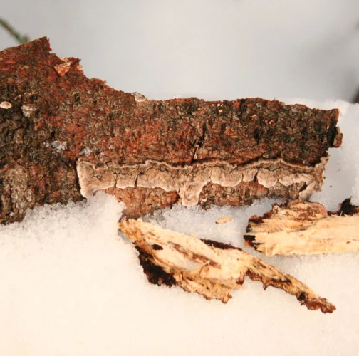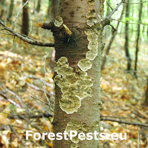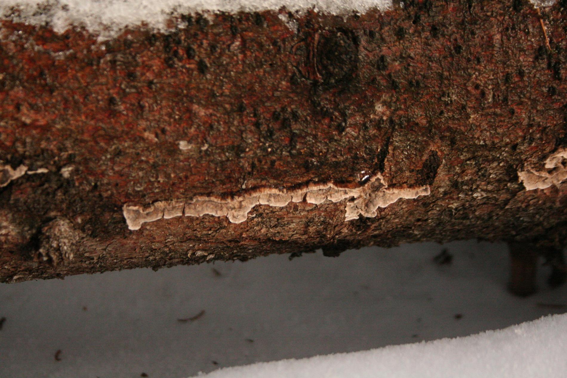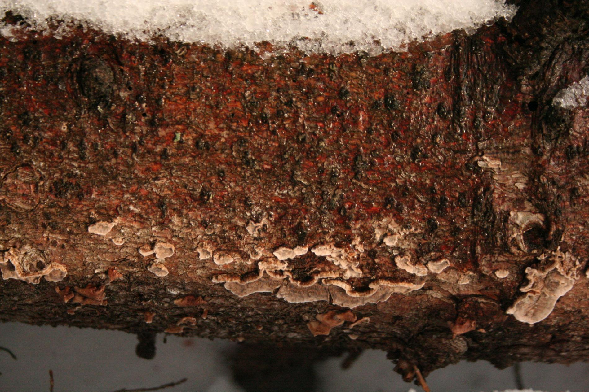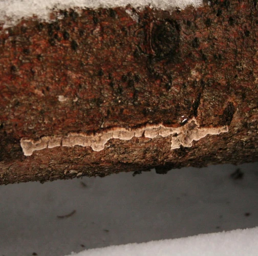 Prítomnosť rozliatych žltohnedých až škoricovohnedých plodníc na kmeni.