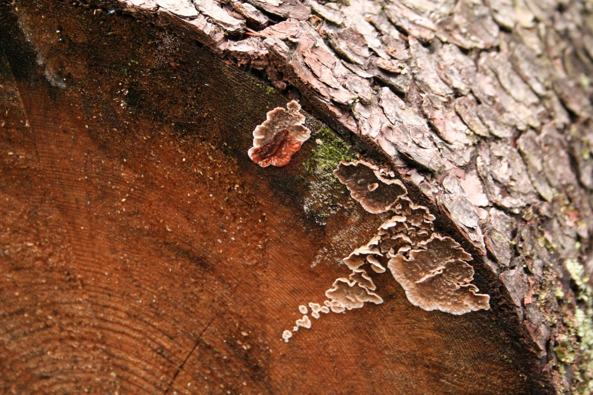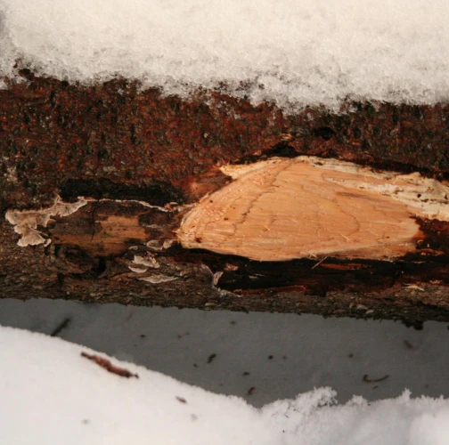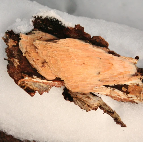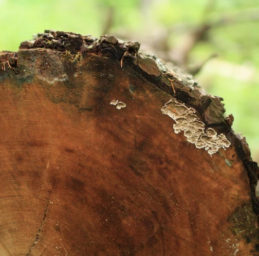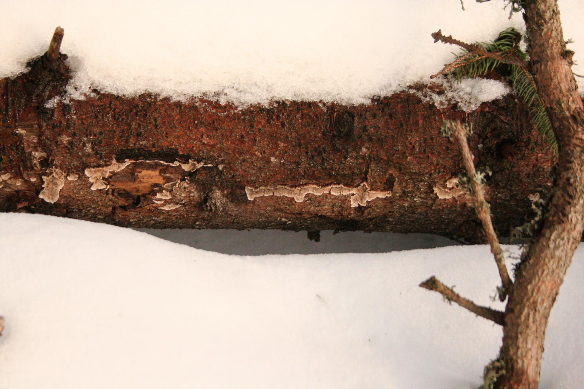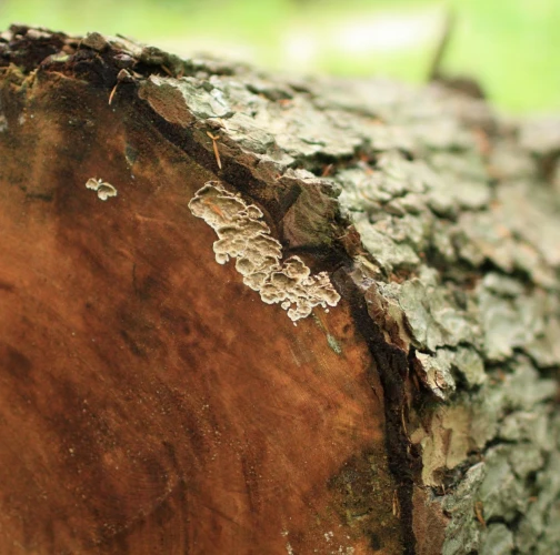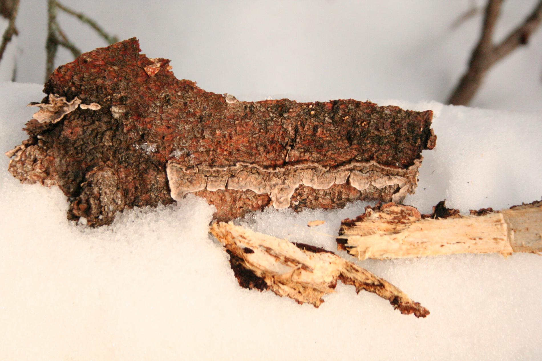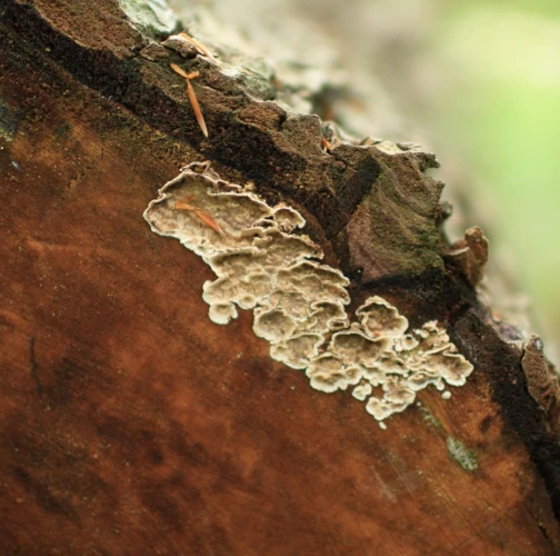 Prítomnosť rozliatych žltohnedých až škoricovohnedých plodníc na kmeni.