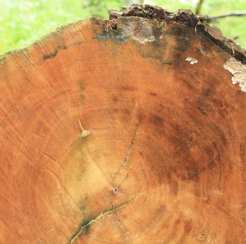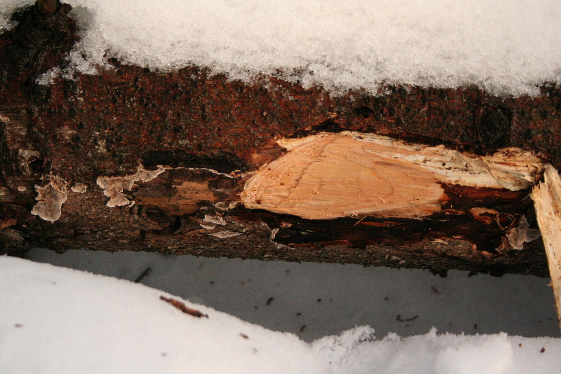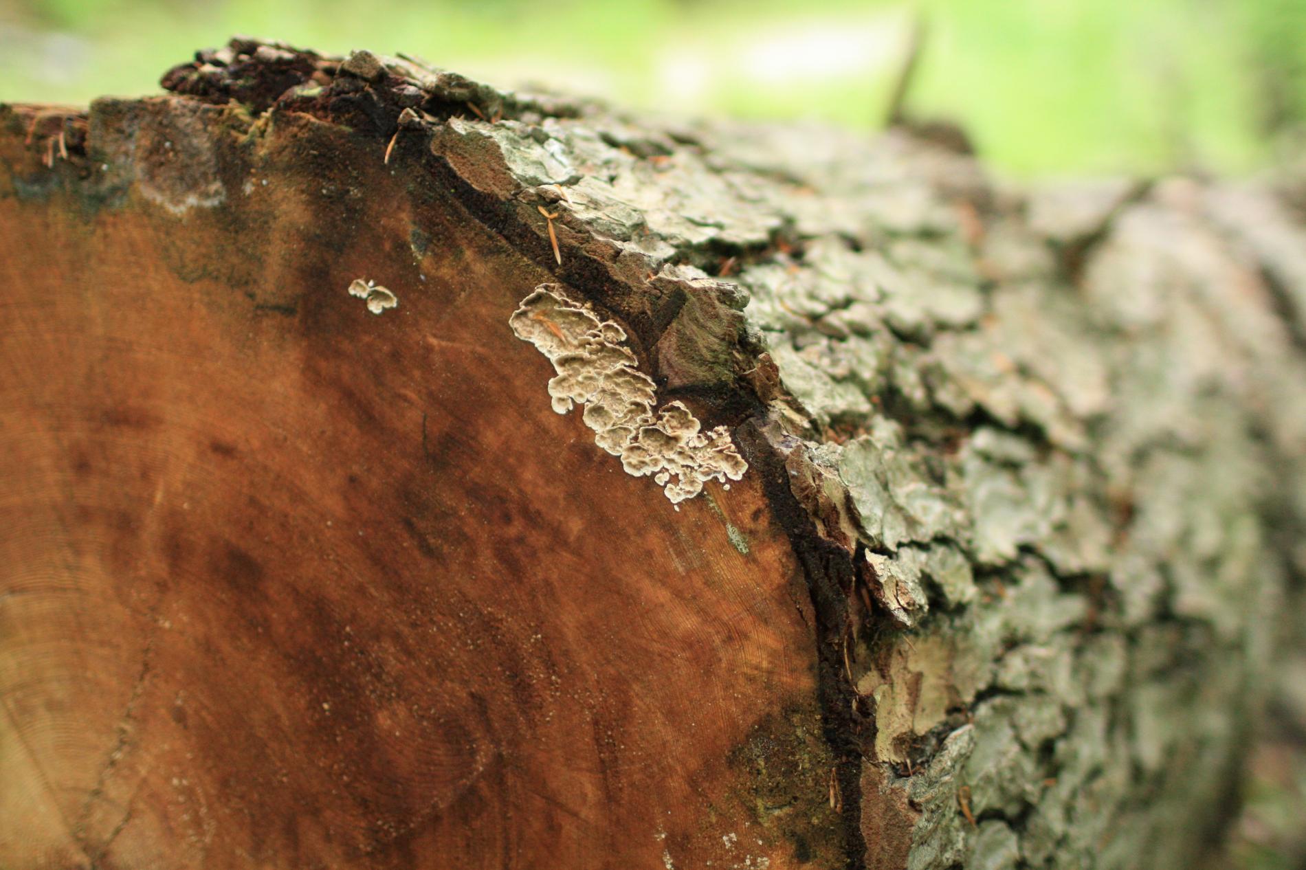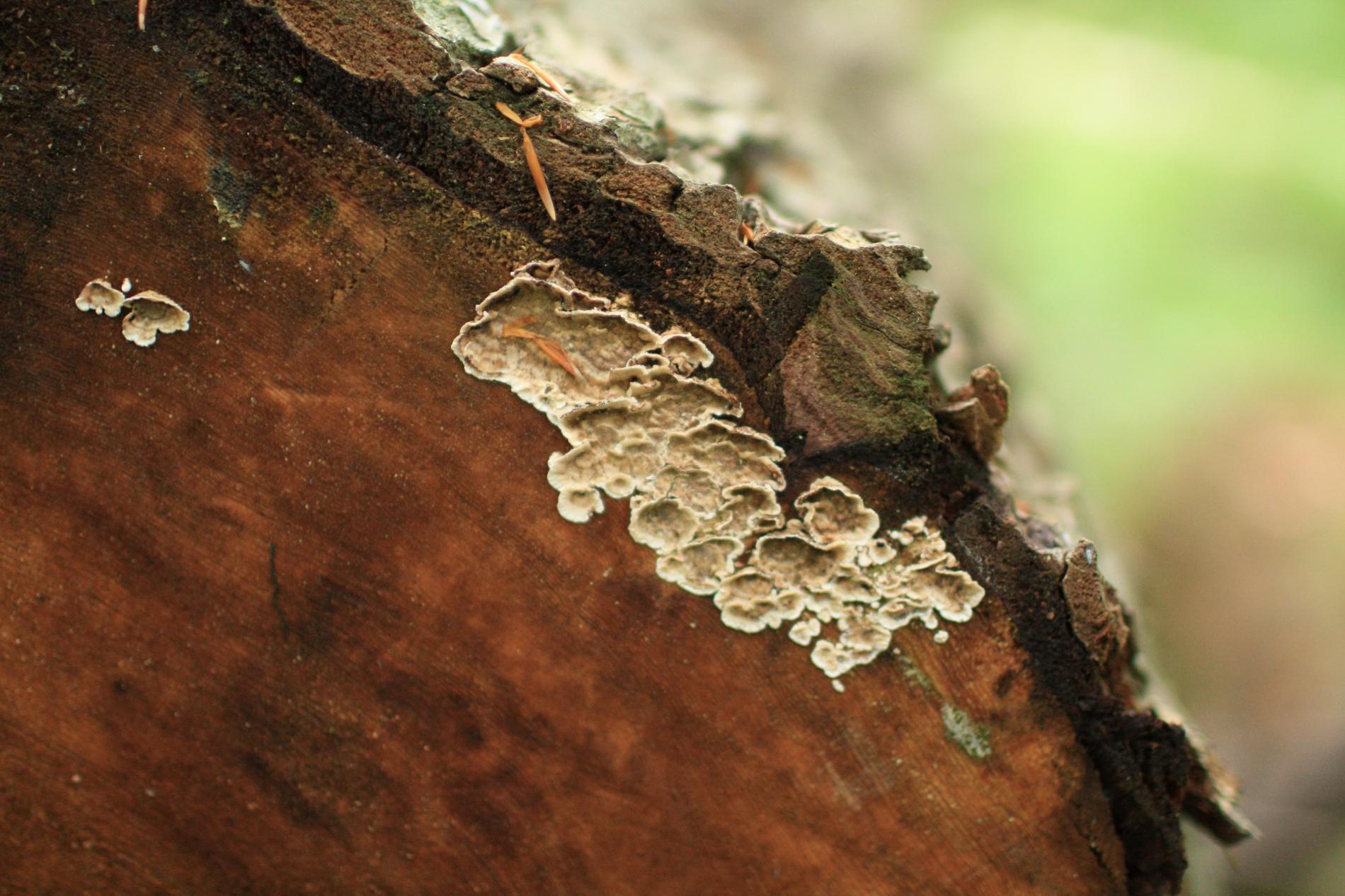 Prítomnosť rozliatych žltohnedých až škoricovohnedých plodníc na kmeni.