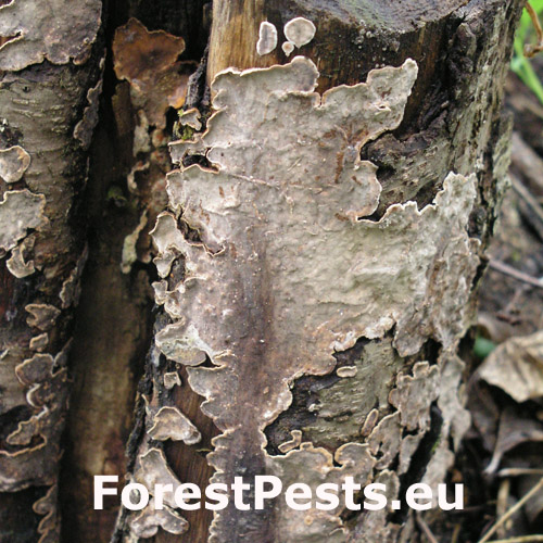 Prítomnosť krémových povlakov na kmeňoch listnatých drevín.