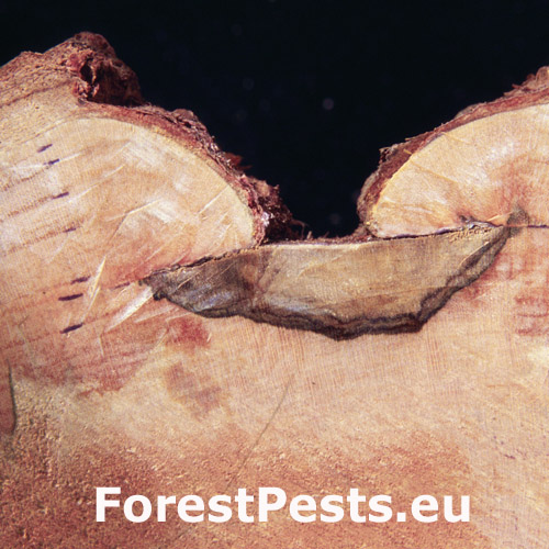 K hlavným znakom infekcie stromov touto rakovinovou hubou je fľaškovité zhrubnutie bázy kmeňa a odumretie veľkých plátov kôry. Ochorenie bolo objasnené len v roku 1981. Infikovaná kôra je nekrotizovaná, v tvare jazyka sa šíri od zeme až do 2 m výšky. Napadnutá kôra je vpadnutá, v nej sa vytvárajú trhliny a nakoniec kôra v šupinách odpadáva. Huba často nedokáže prekonať obranný mechanizmus stromu a nenapadne kambium. Aj po prípadnom napadnutí kambia strom odoláva intenzívnym kalusovaním. Plodnice sú drobné, 1 mm diskovité škoricovo sfarbené apotéciá.