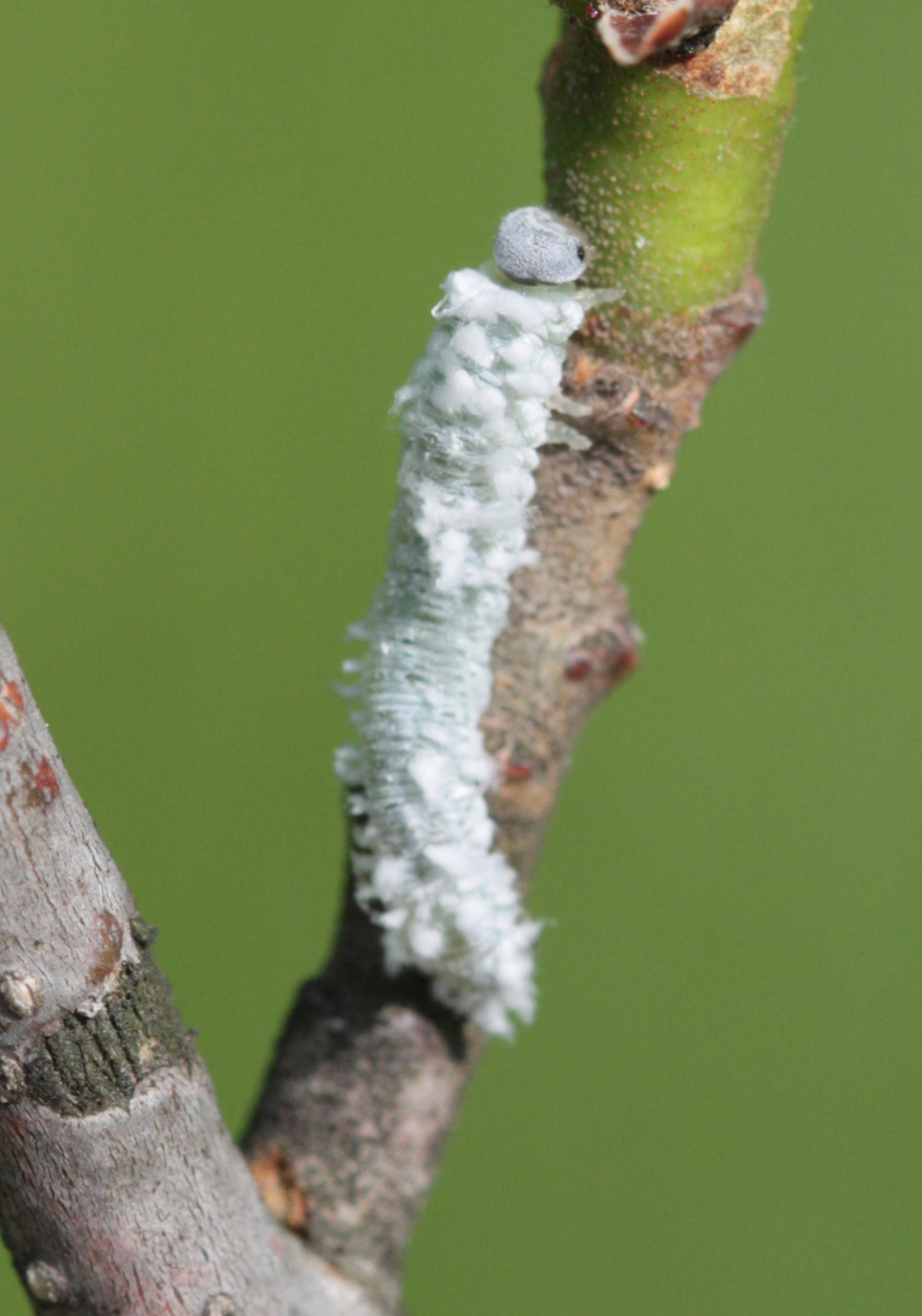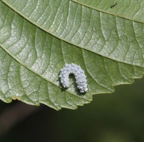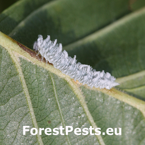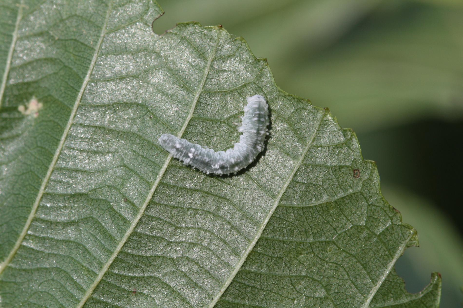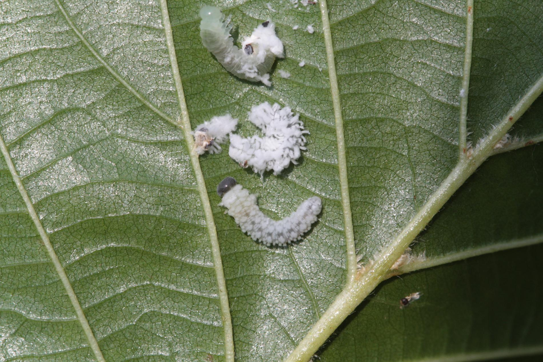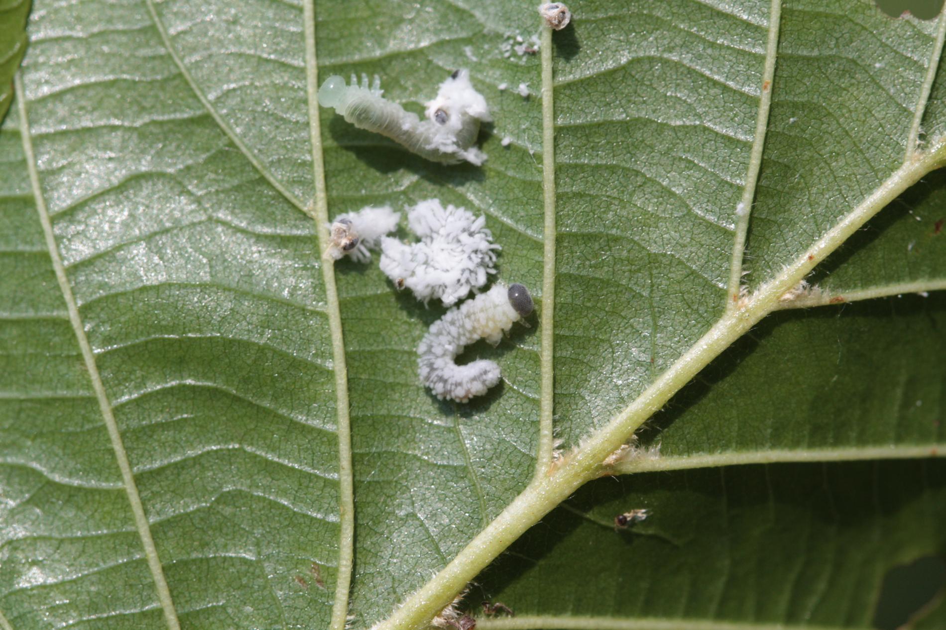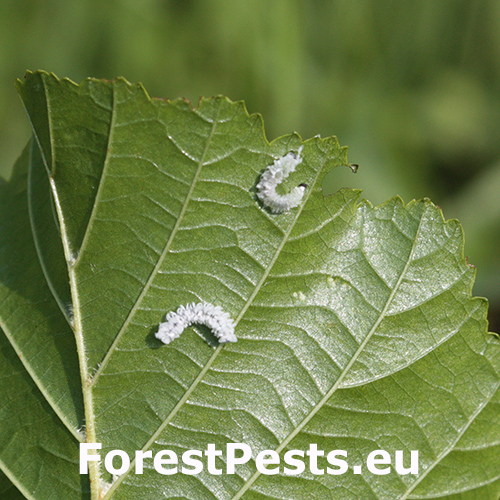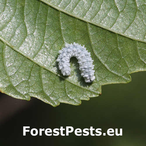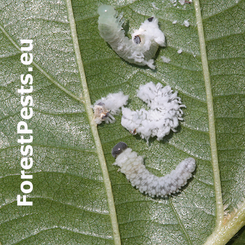 Biele larvy na listoch. Strata listov – defoliácia.