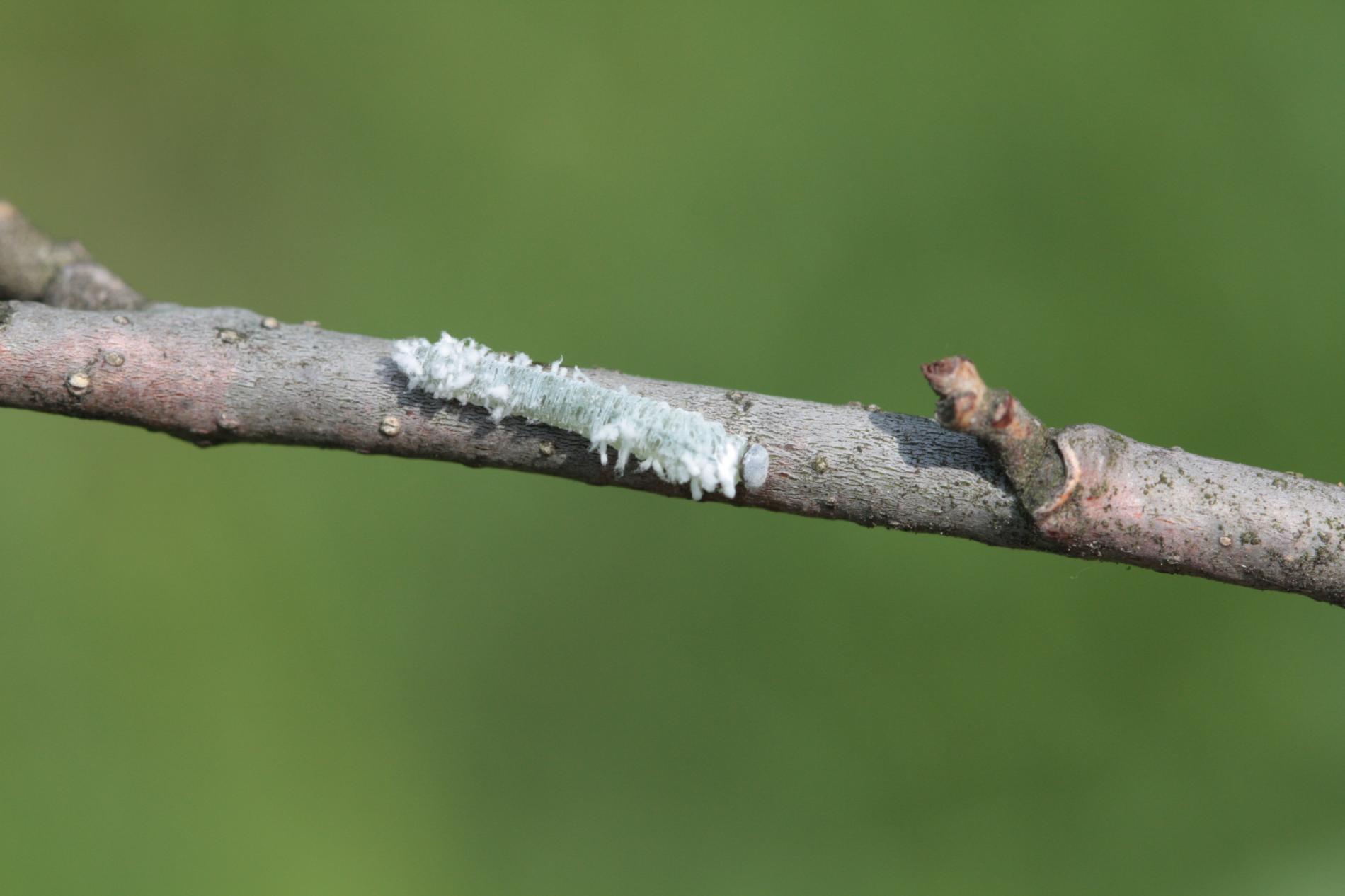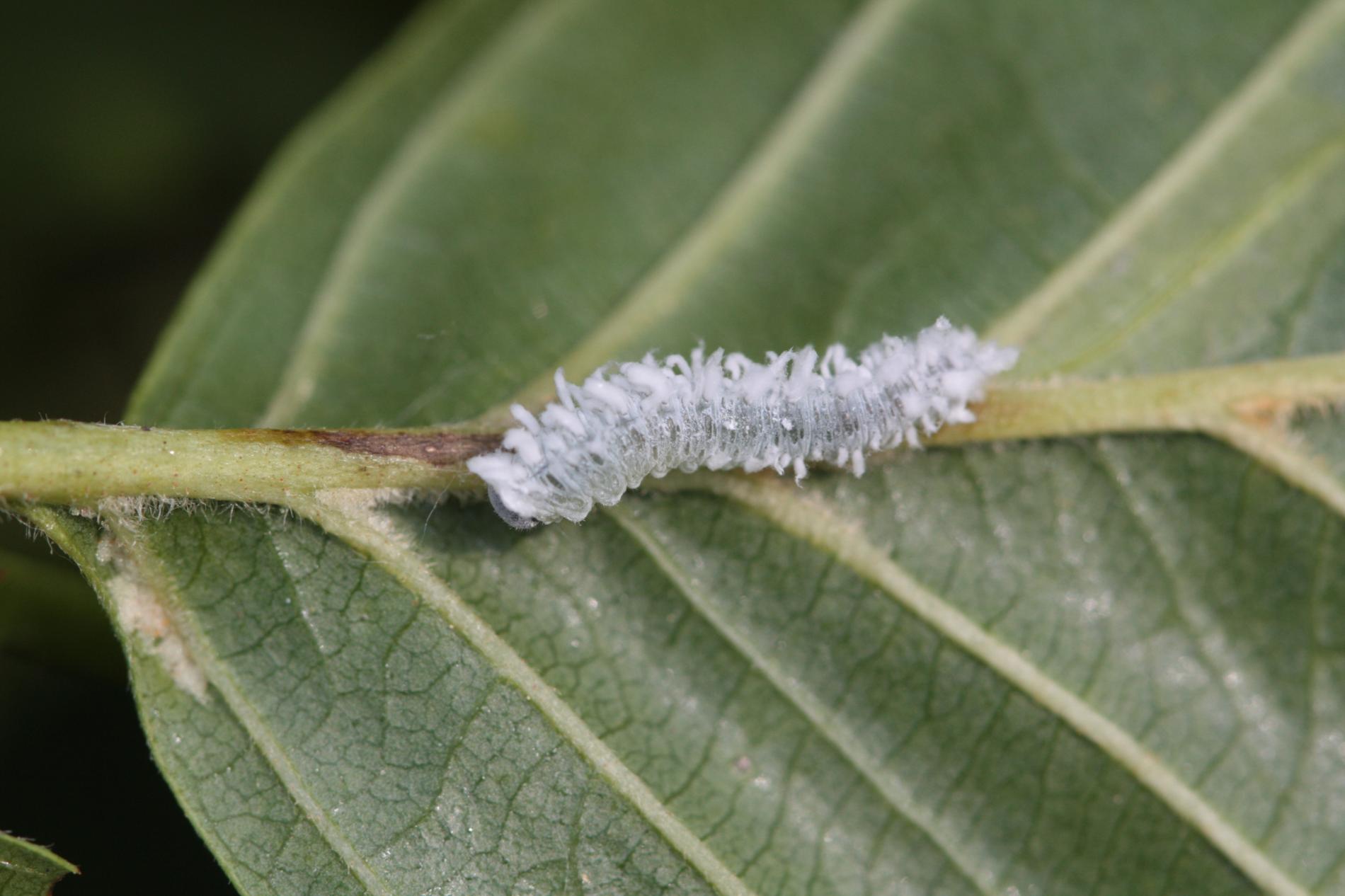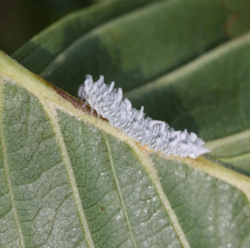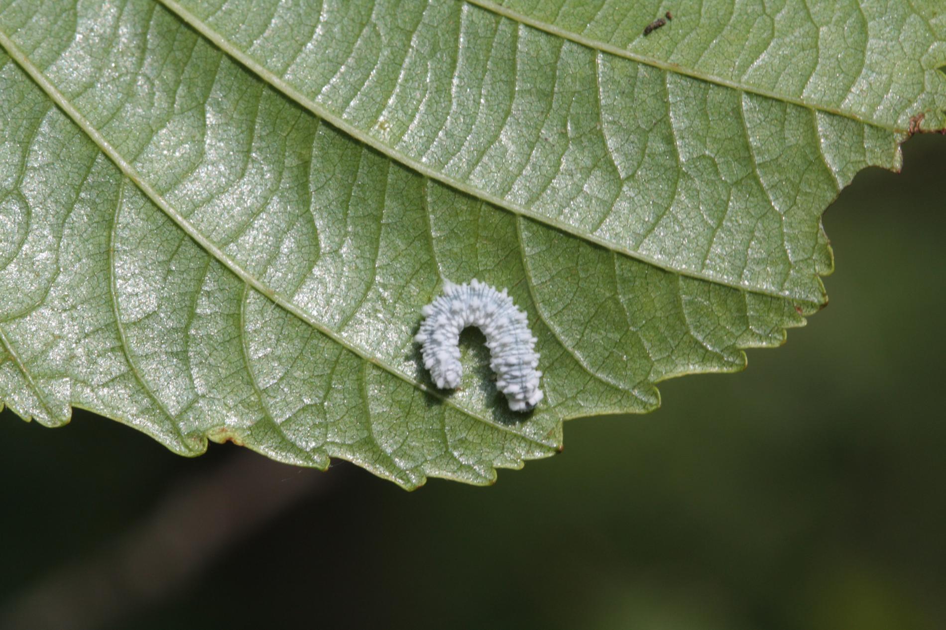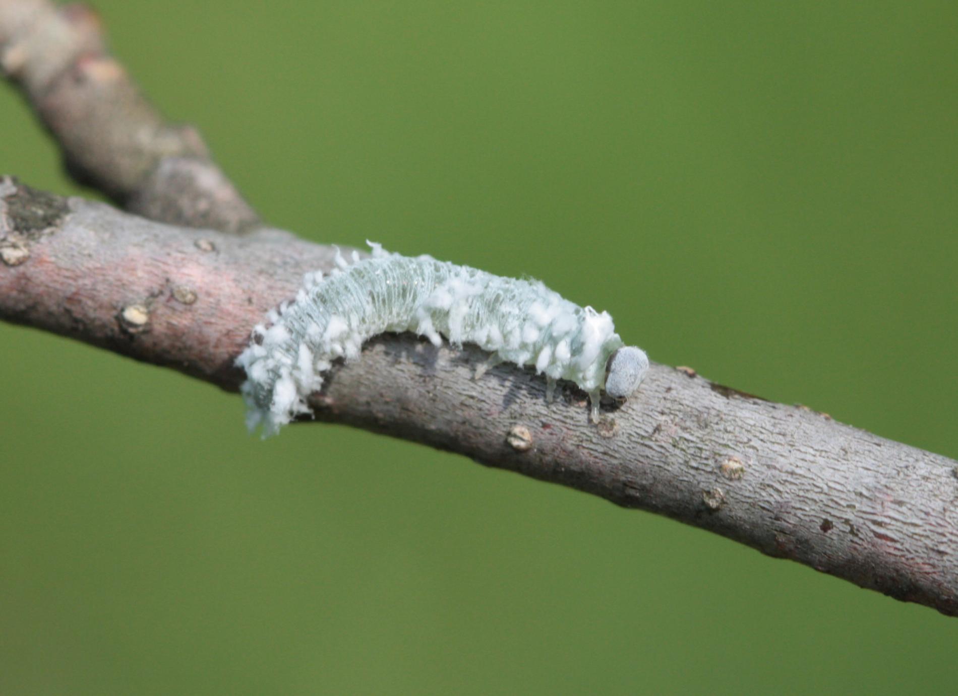 Biele larvy na listoch. Strata listov – defoliácia.