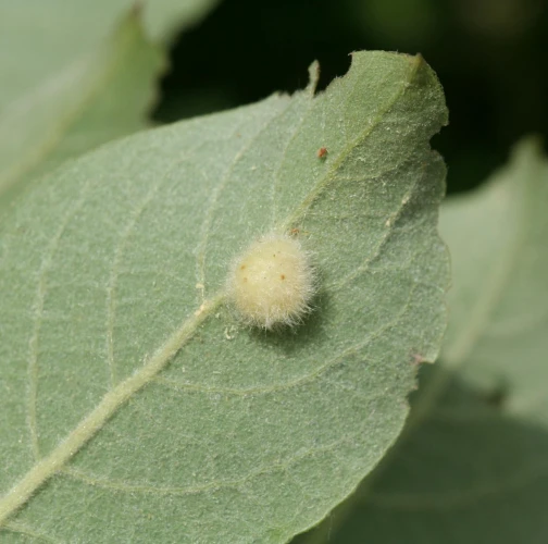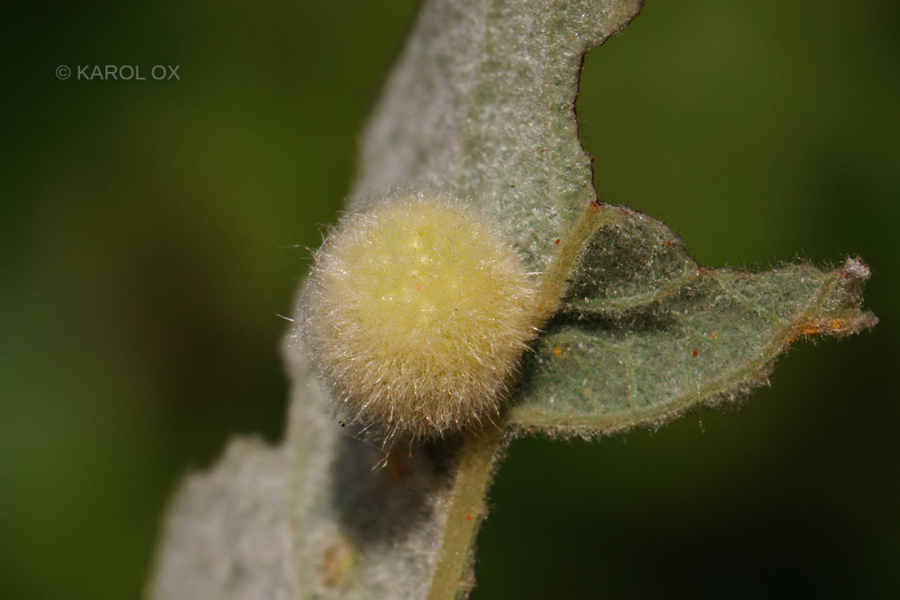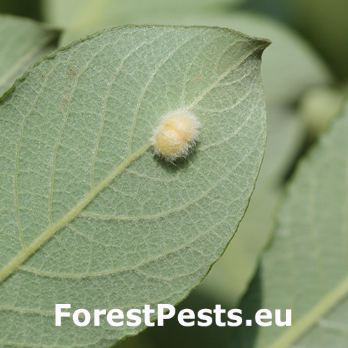 Táto piliarka  vytvára hálky veľké cca do 5 mm na spodnej strane listov. Hálky sú zväčša svetlozelené, niekedy zelené alebo červené, inokedy žlté. Obyčajne viac alebo menej ochlpené. Vo vnútri žije jedna larva. Bežná na mnohých druhoch vŕb.