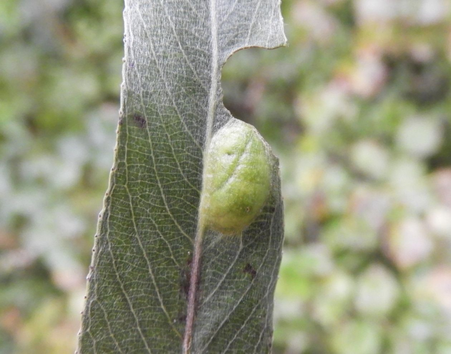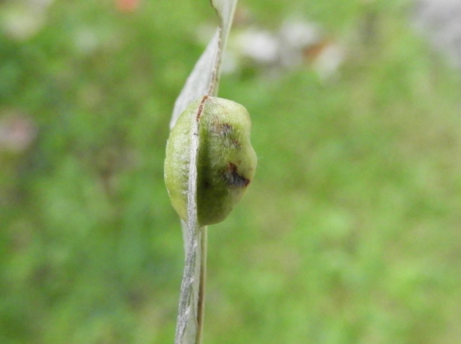 Pomerne masívna, fazuli podobná hálka, ktorá vypĺňa celý priestor medzi stredovou žilkou a okrajom listu.