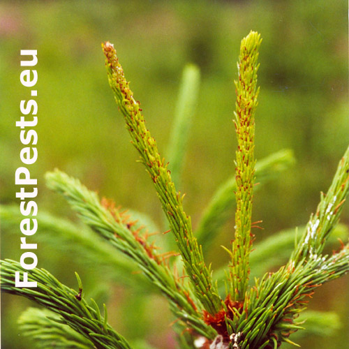 Čierno - žltá osička s priesvitnými blanitými krídlami. Dĺžka tela samičky je asi 5 - 6 mm, rozpätie krídel 9 - 14 mm. Samček je o niečo menší. Rojí sa už koncom apríla. Samičky kladú vajíčka jednotlivo do mladých, rozvíjajúcich sa ihlíc. Jedna samička vykladie až 100 vajíčok, z ktorých sa za 5 dní liahnu pahúsenice. Na výhonku je ich obyčajne niekoľko. Sú zelené, v dospelosti dlhé asi 15 mm. Príčinou poškodenia je ich žer vo vrchných častiach koruny. Na výhonoch zostávajú poškodené ihlice hrdzavej farby, ktoré neskôr opadnú a výhony zostávajú holé. Pahúsenice žerú iba čerstvé, tohoročné ihlice, staršie nepoškodzujú. Hojnejšia v mladších porastoch, nie starších ako 20 - 30 rokov.