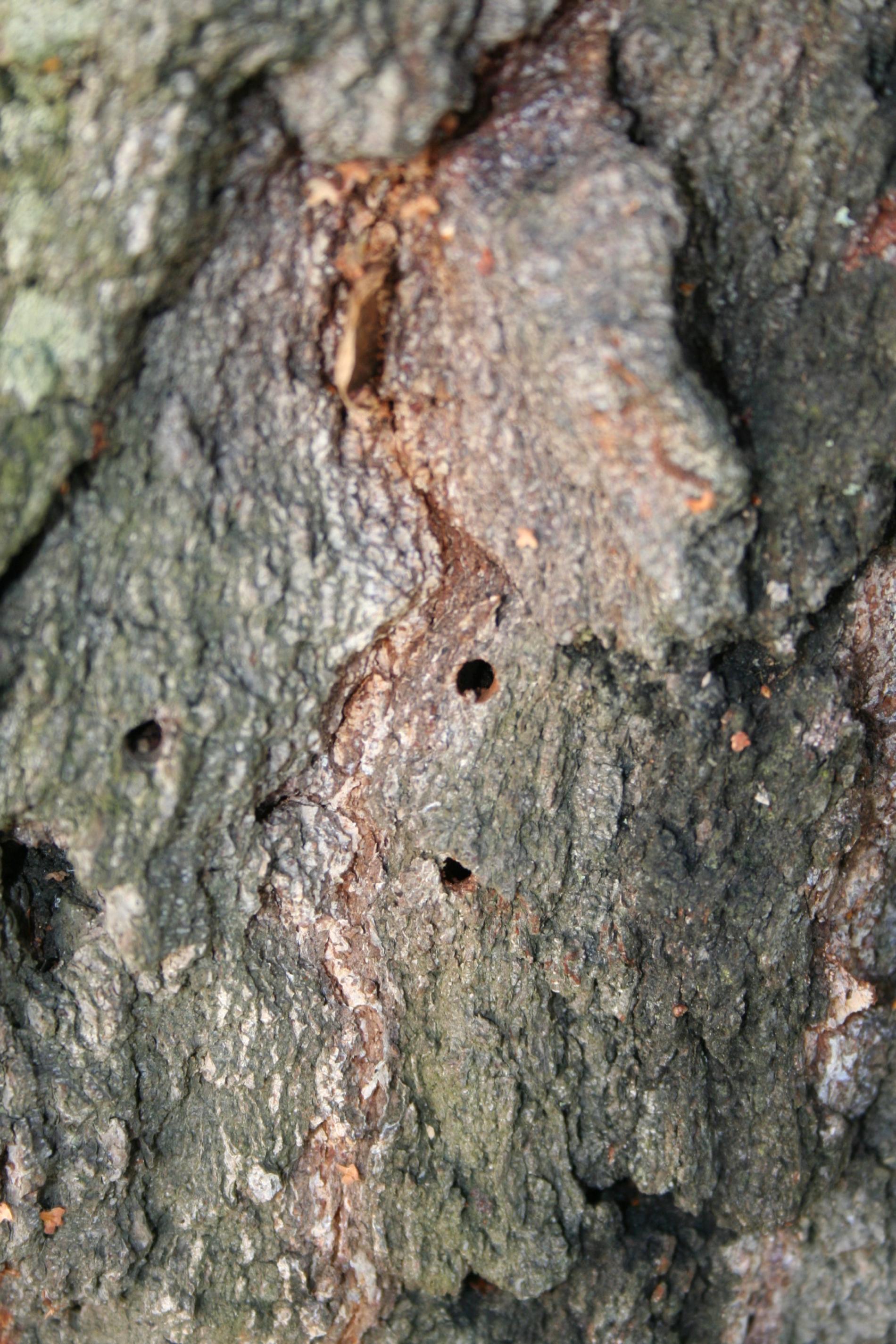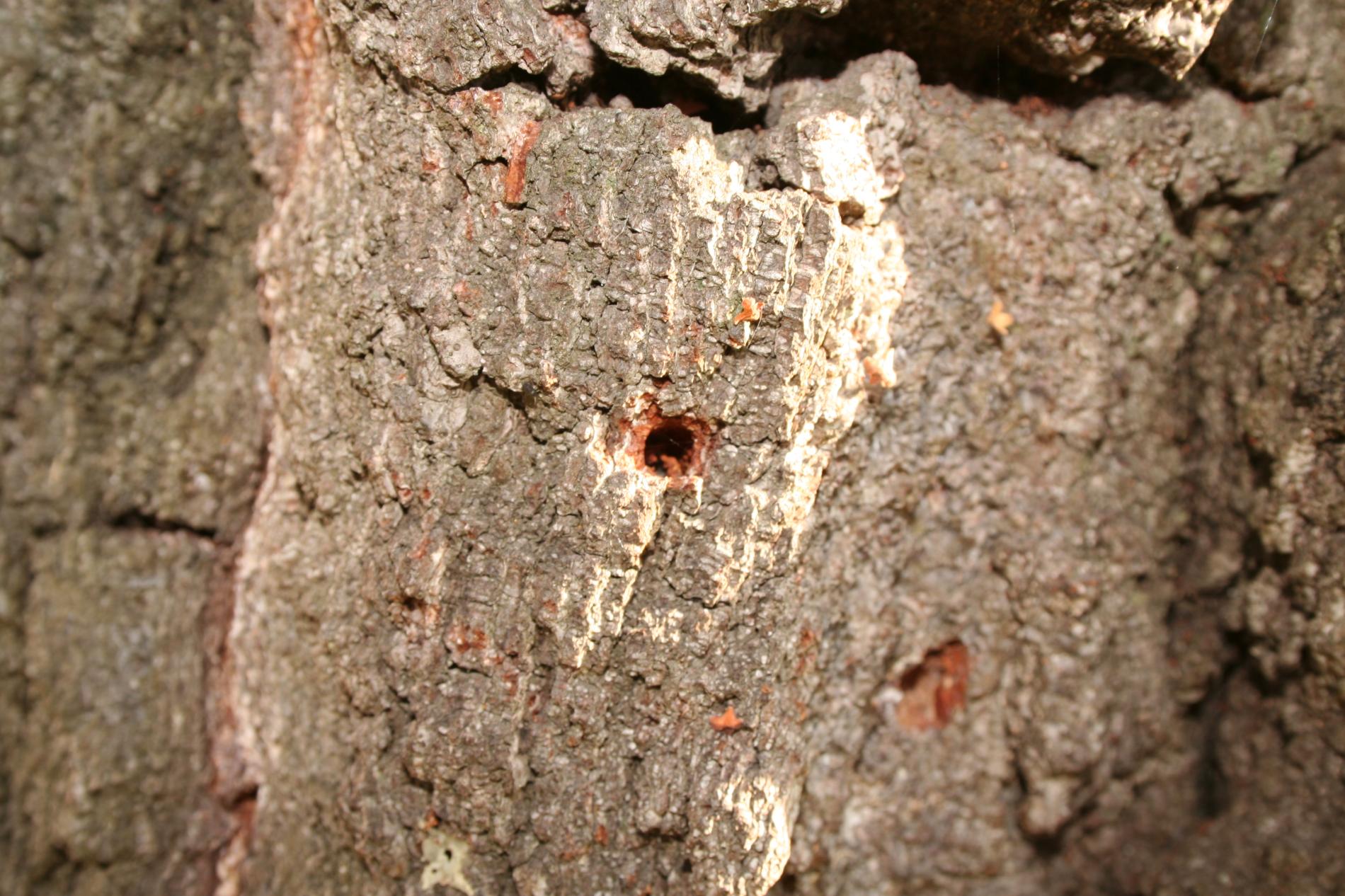 Pravidelne okrúhle diery v kmeni, požerky v dreve.