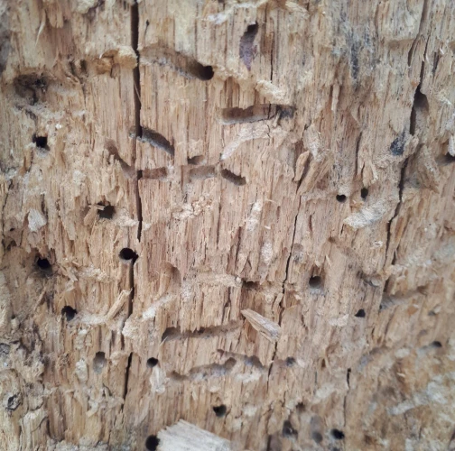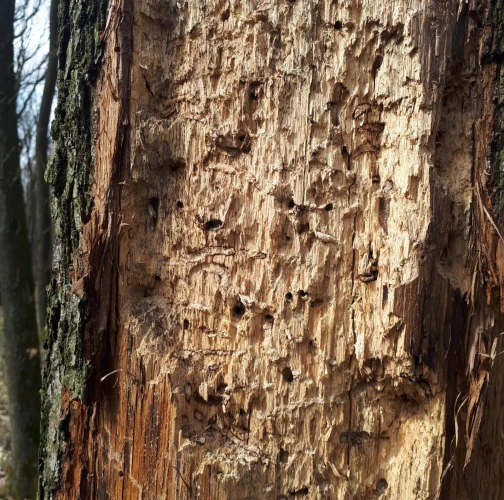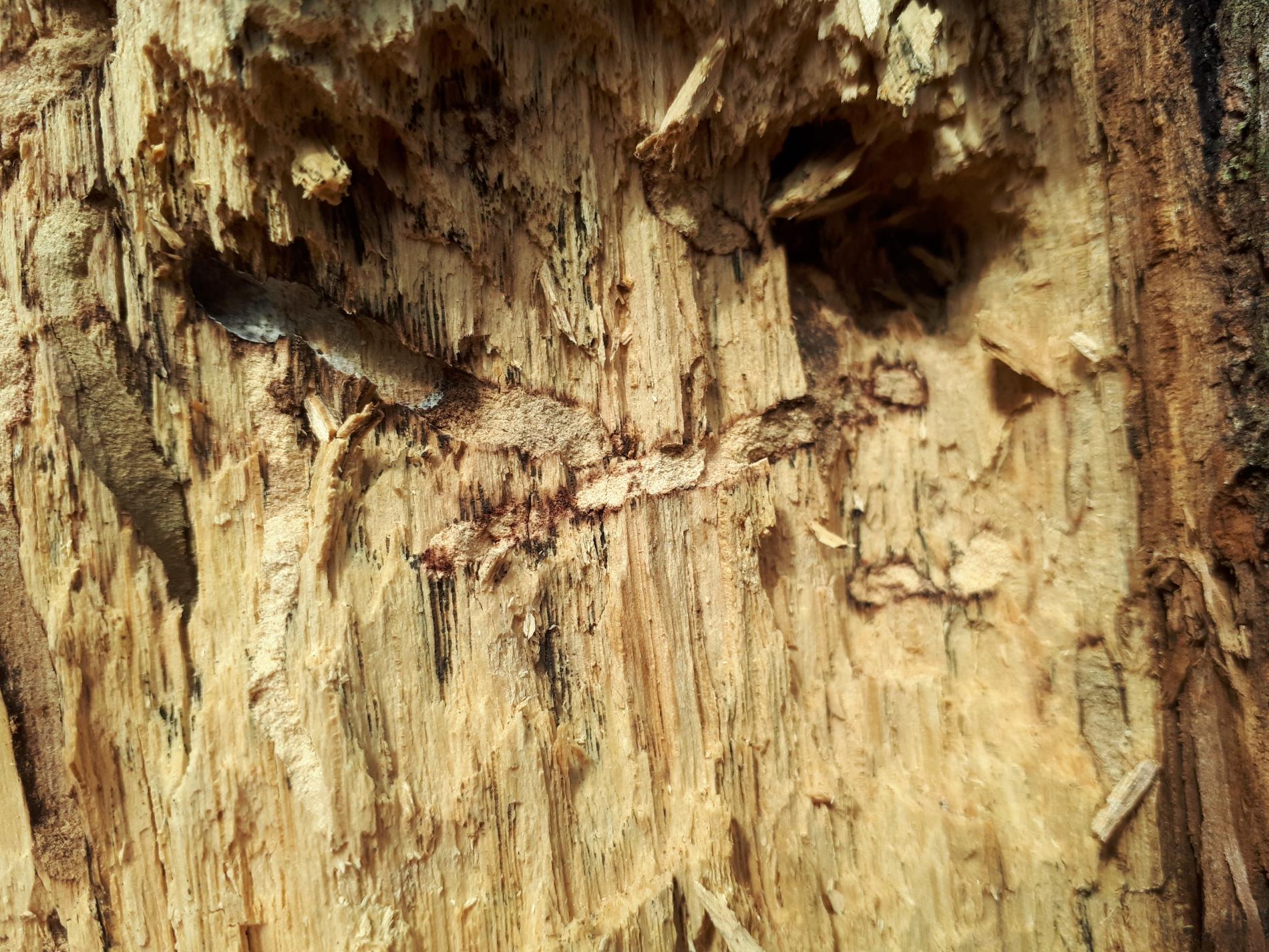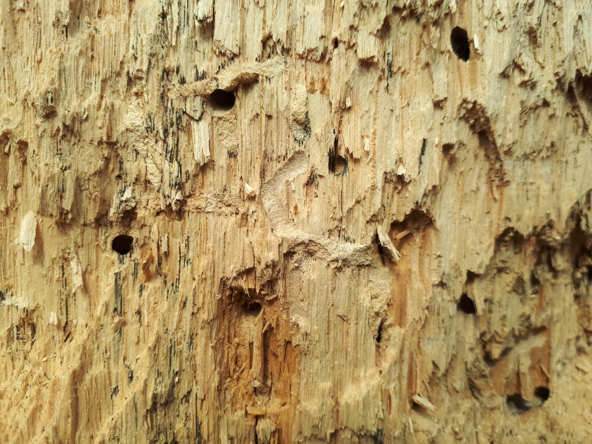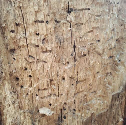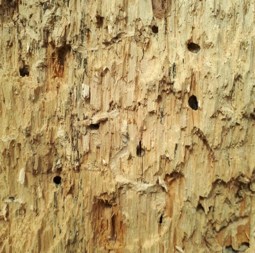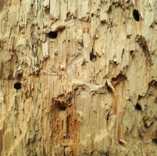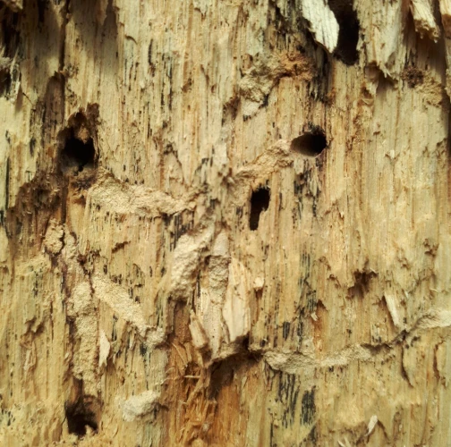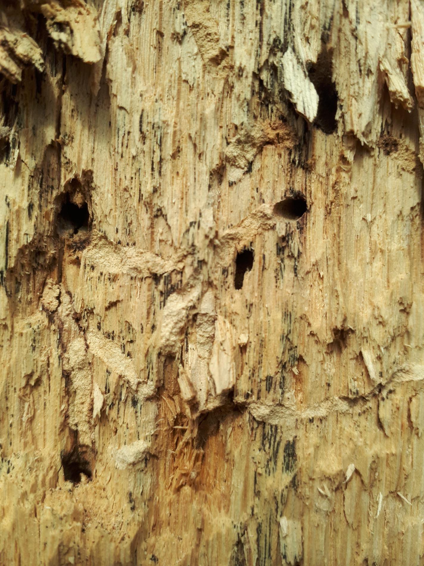 Požerky v beli, ktoré sú husto naplnené pilinami. Okrúhle výletové otvory.