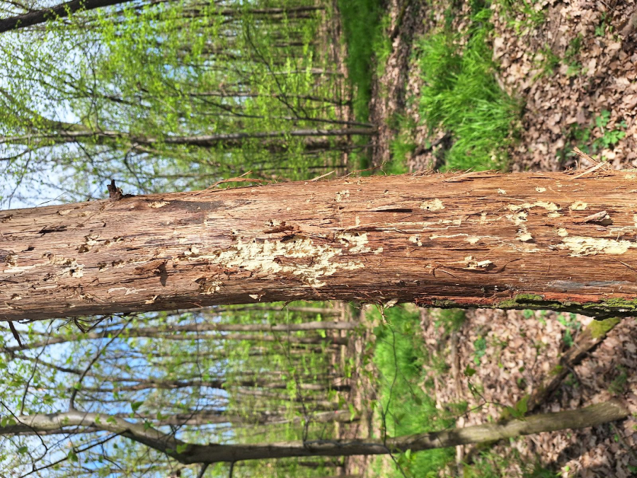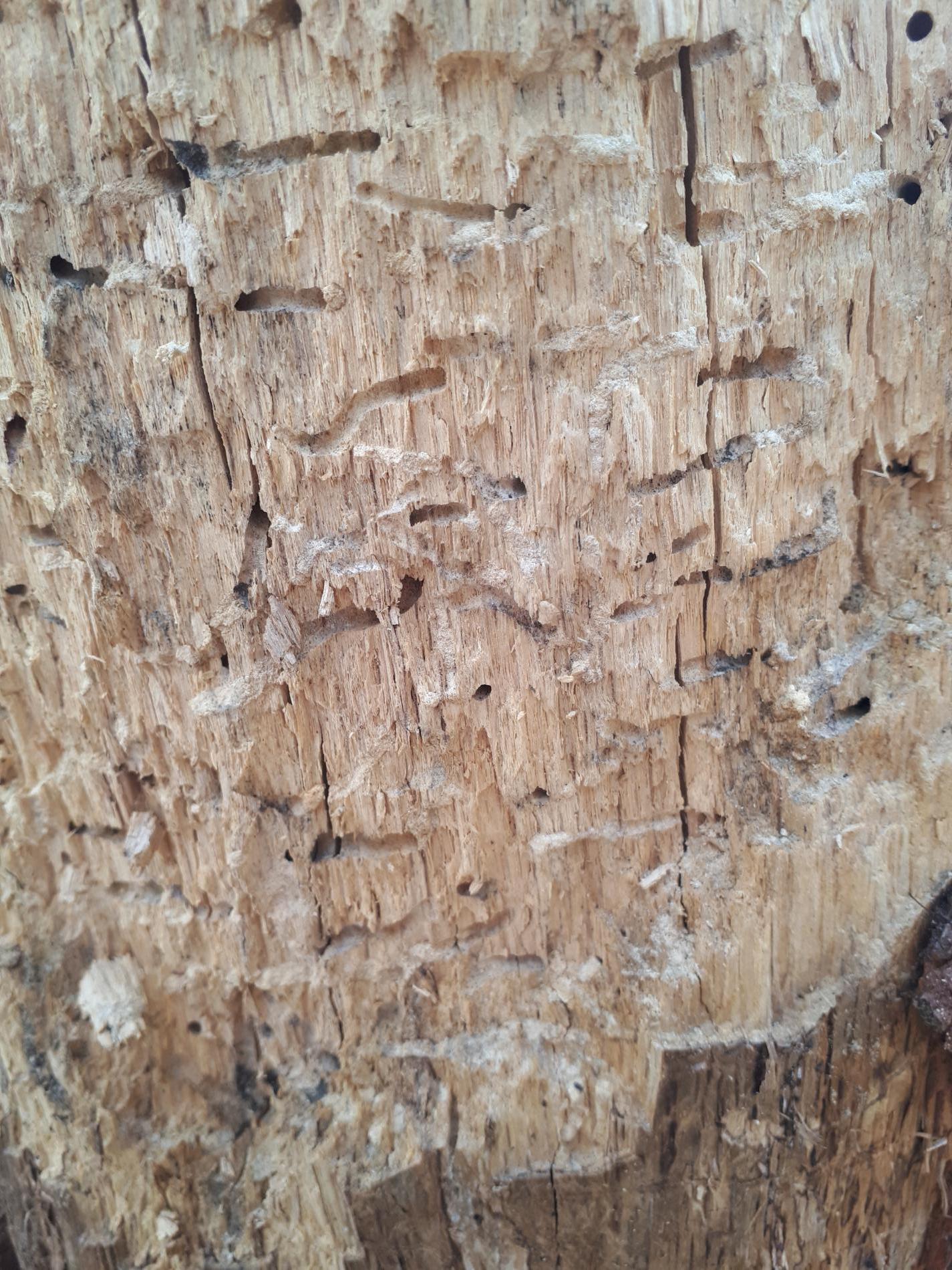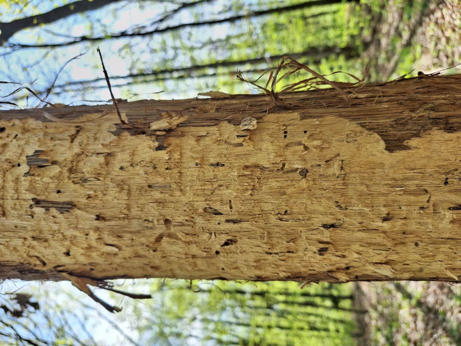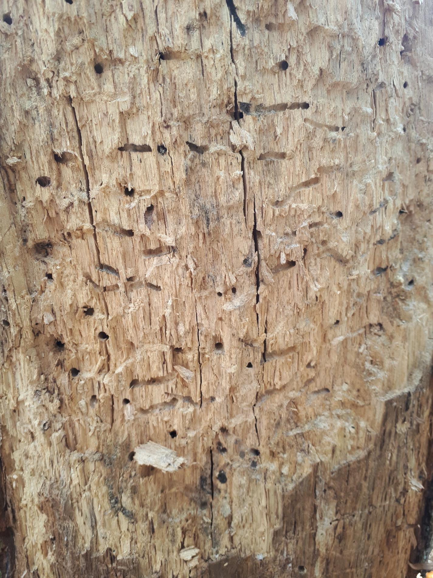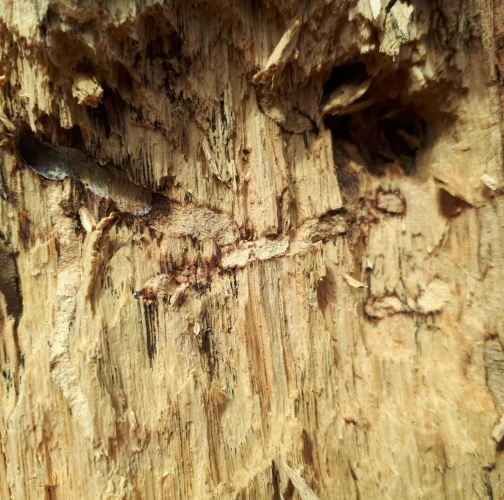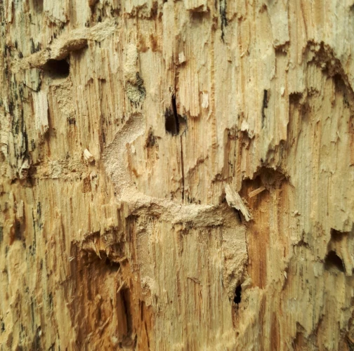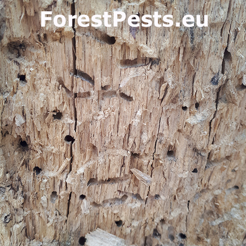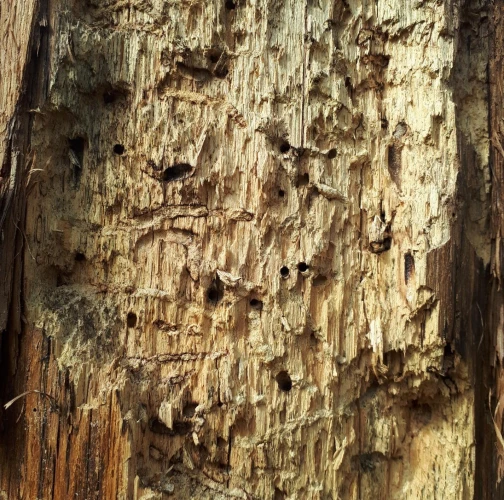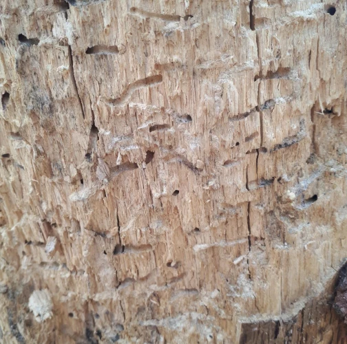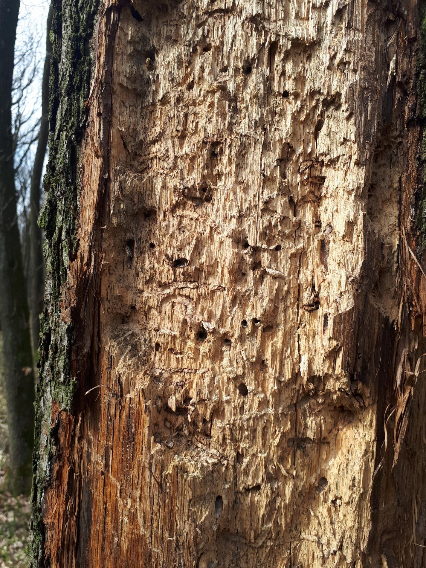 Požerky v beli, ktoré sú husto naplnené pilinami. Okrúhle výletové otvory.
