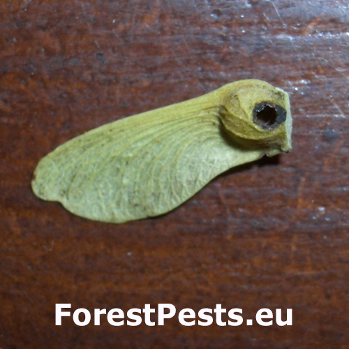 Napadnuté semená javora majú malé výstupné otvory, čo naznačuje vnútorný žer húseníc. Semená strácajú klíčivosť.