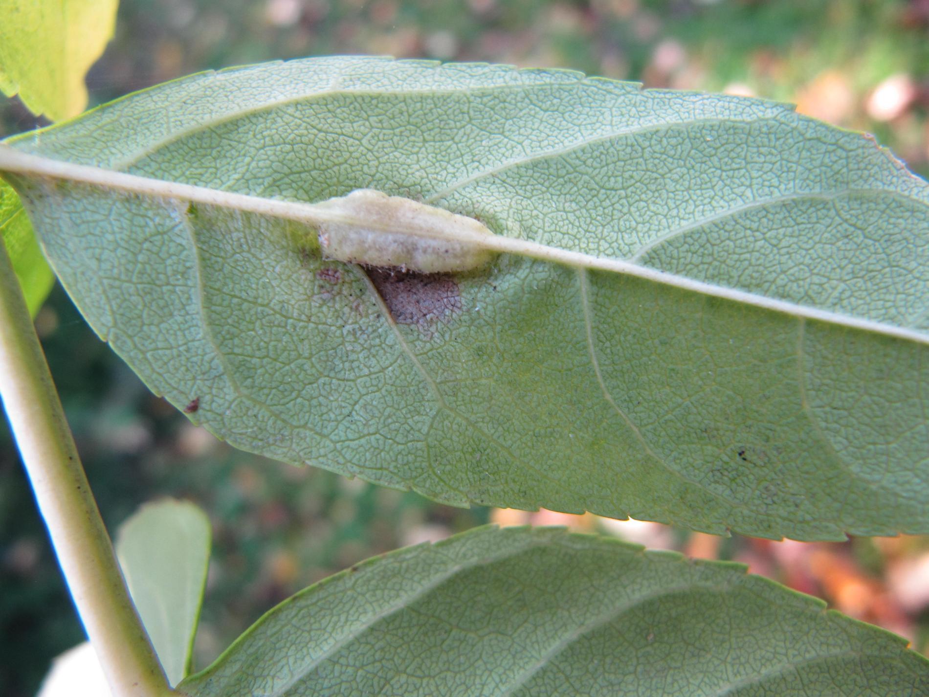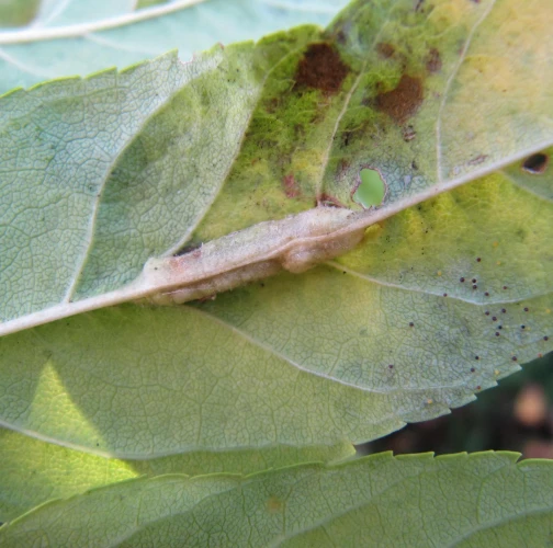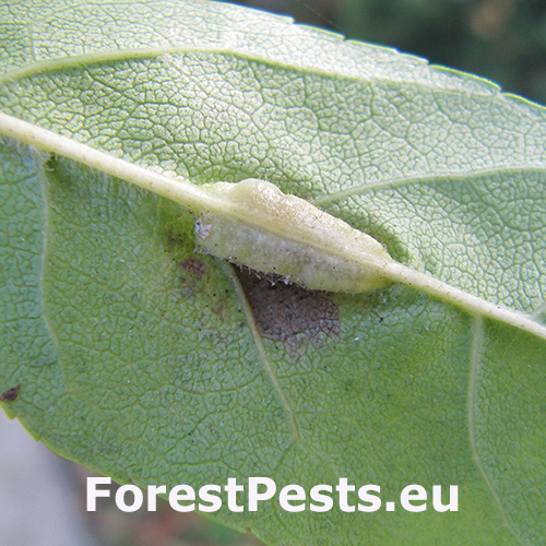 Na spodnej strane listov sa tvoria úzke zelené hálky veľké 5–30 mm. Vo vnútri obsahujú oranžové larvy. Na hornej strane listov sú viditeľné štrbinové otvory. Silne napadnuté listy môžu byť zdeformované.