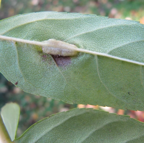 Hálky sa nachádzajú na spodnej strane listov pozdĺž hlavej žilky a tvoria úzke zelené útvary s oranžovými larvami vo vnútri. Na hornej strane listov možno pozorovať štrbinové otvory. Pri vyššej početnosti napadnutia môže dochádzať k deformáciám listov, čo znižuje ich estetickú hodnotu a oslabuje asimiláciu. Zdravé stromy však obvykle zvládajú napadnutie bez dlhodobého poškodenia.