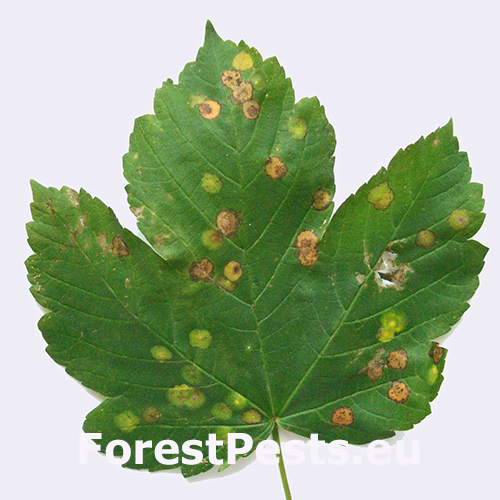 Na spodnej strane listov sa nachádzajú malé prehĺbeniny s bielymi larvami v kvapke tekutiny. Okolité pletivá bývajú žltkasté alebo inak svetlo sfarbené. Opustené hálky vysychajú a vypadávajú, pričom zanechávajú diery. Na hornej strane listov sa napadnutie prejavuje ako žltkasté okrúhle škvrny.