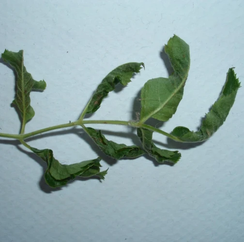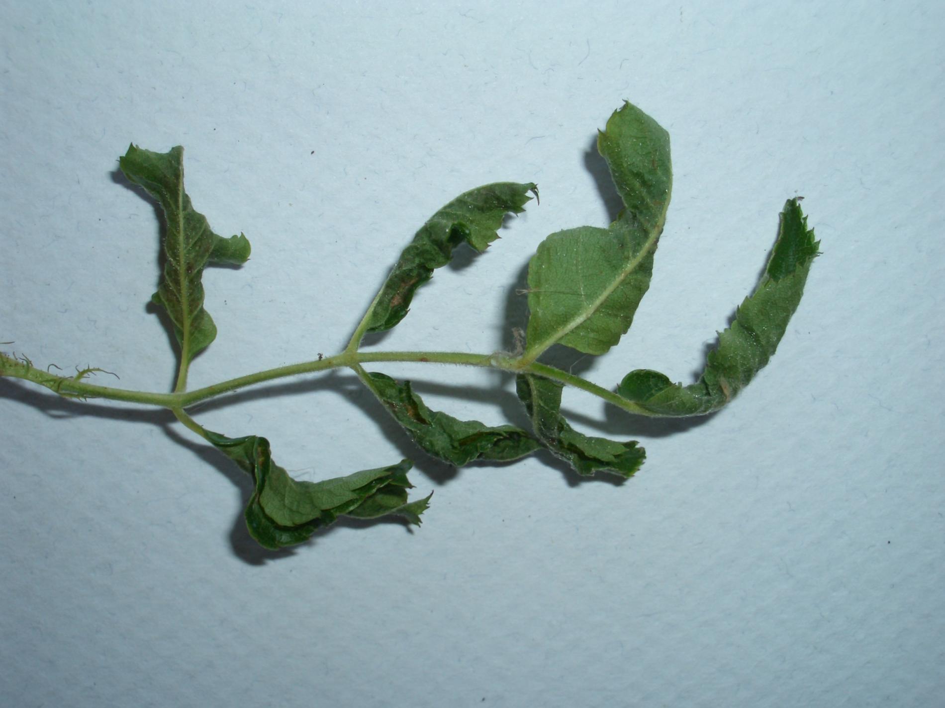 Listy sa prehýbajú smerom nahor pozdĺž hlavnej žilky, sú zhrubnuté a s červeným nádychom. V hálkach sú oranžové larvy. Silne napadnuté listy sa môžu deformovať alebo predčasne opadávať.