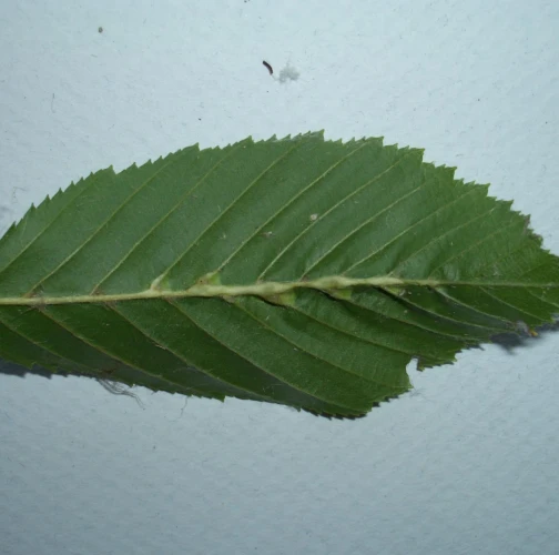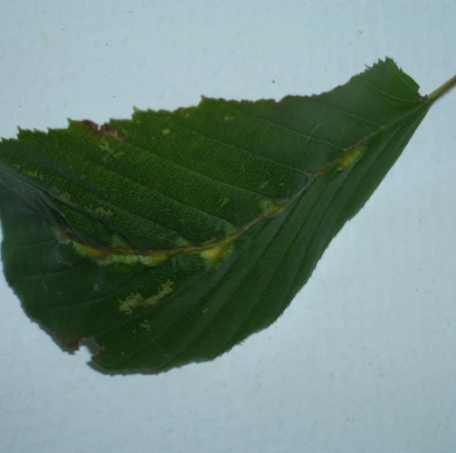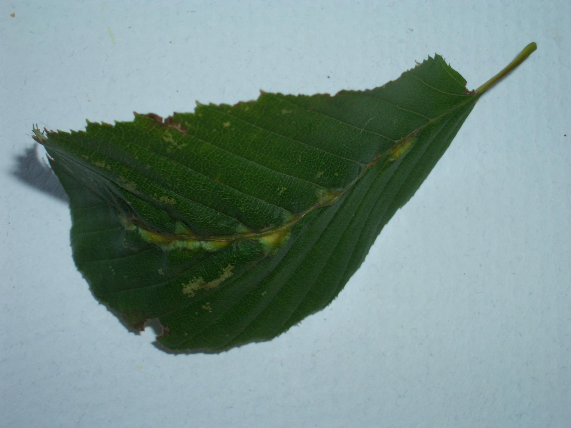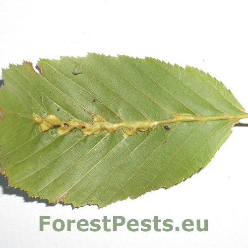 Pretiahnuté hálky, dĺžky 3–5 cm, sa nachádzajú na spodnej strane listov pozdĺž stredovej alebo bočných žiliek. Každá hálka obsahuje bielu larvu. Hálky môžu byť aj na krídlach plodov hrabu.