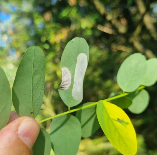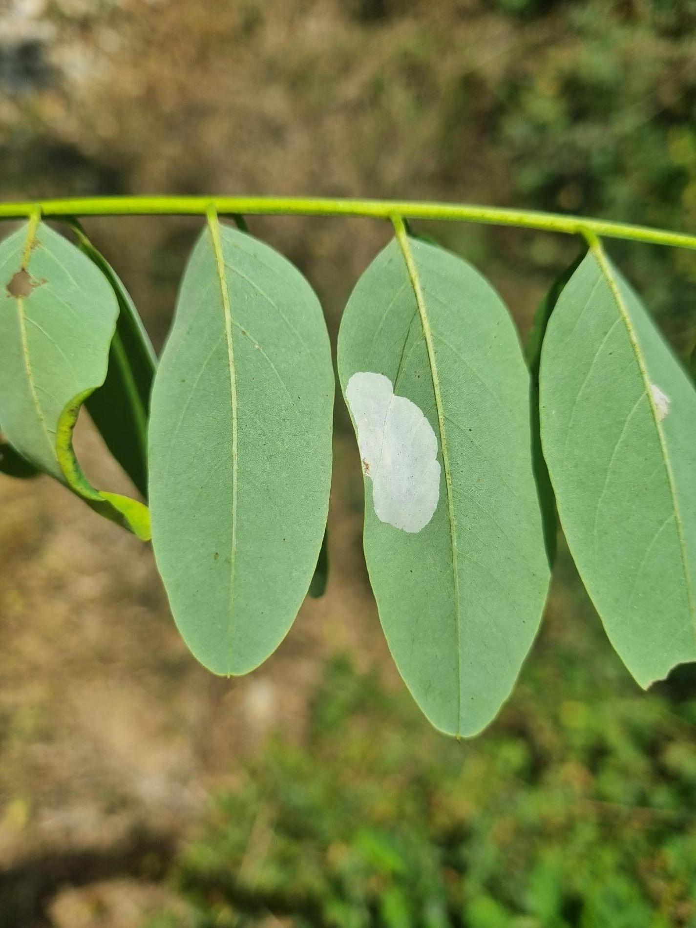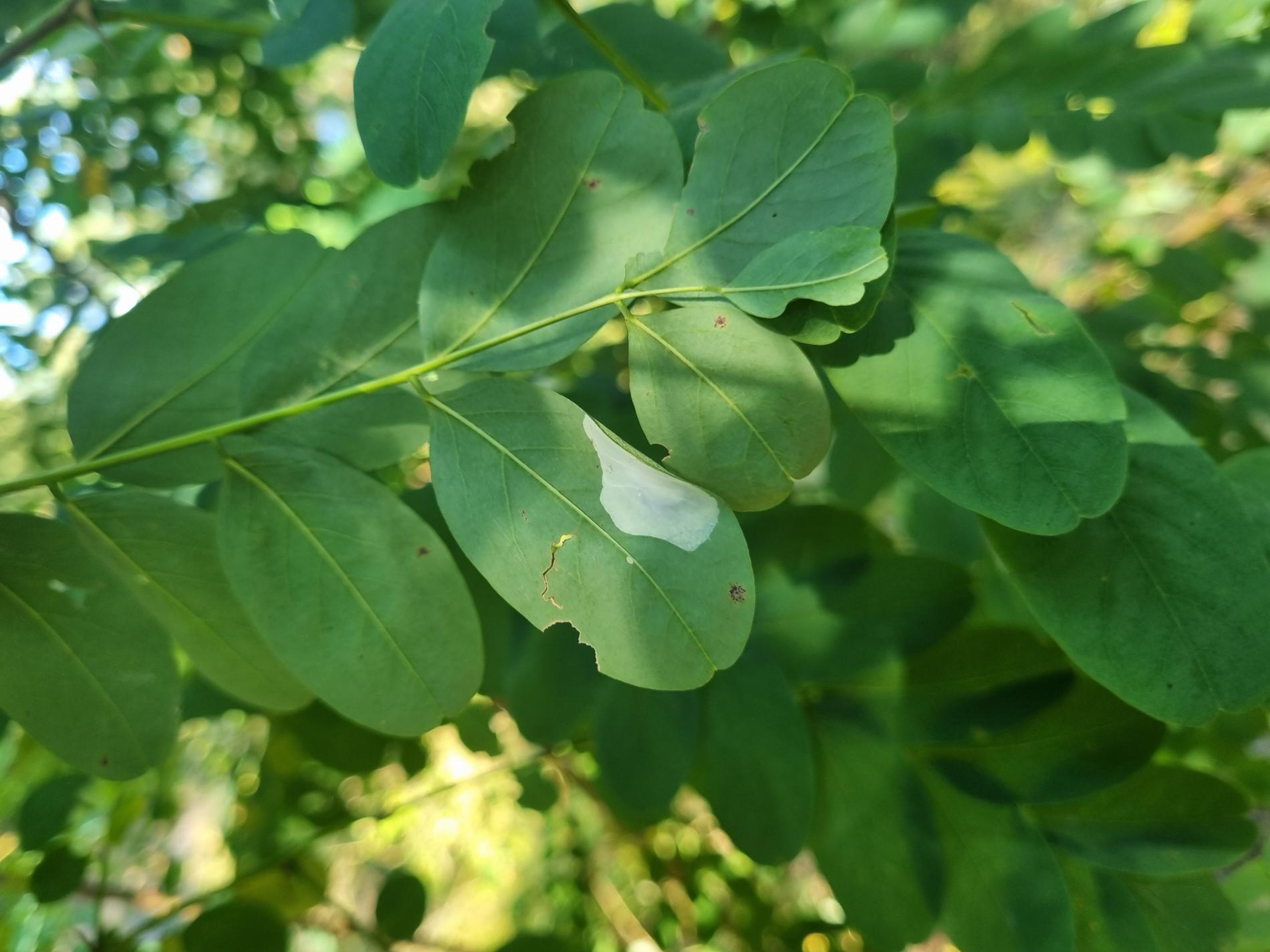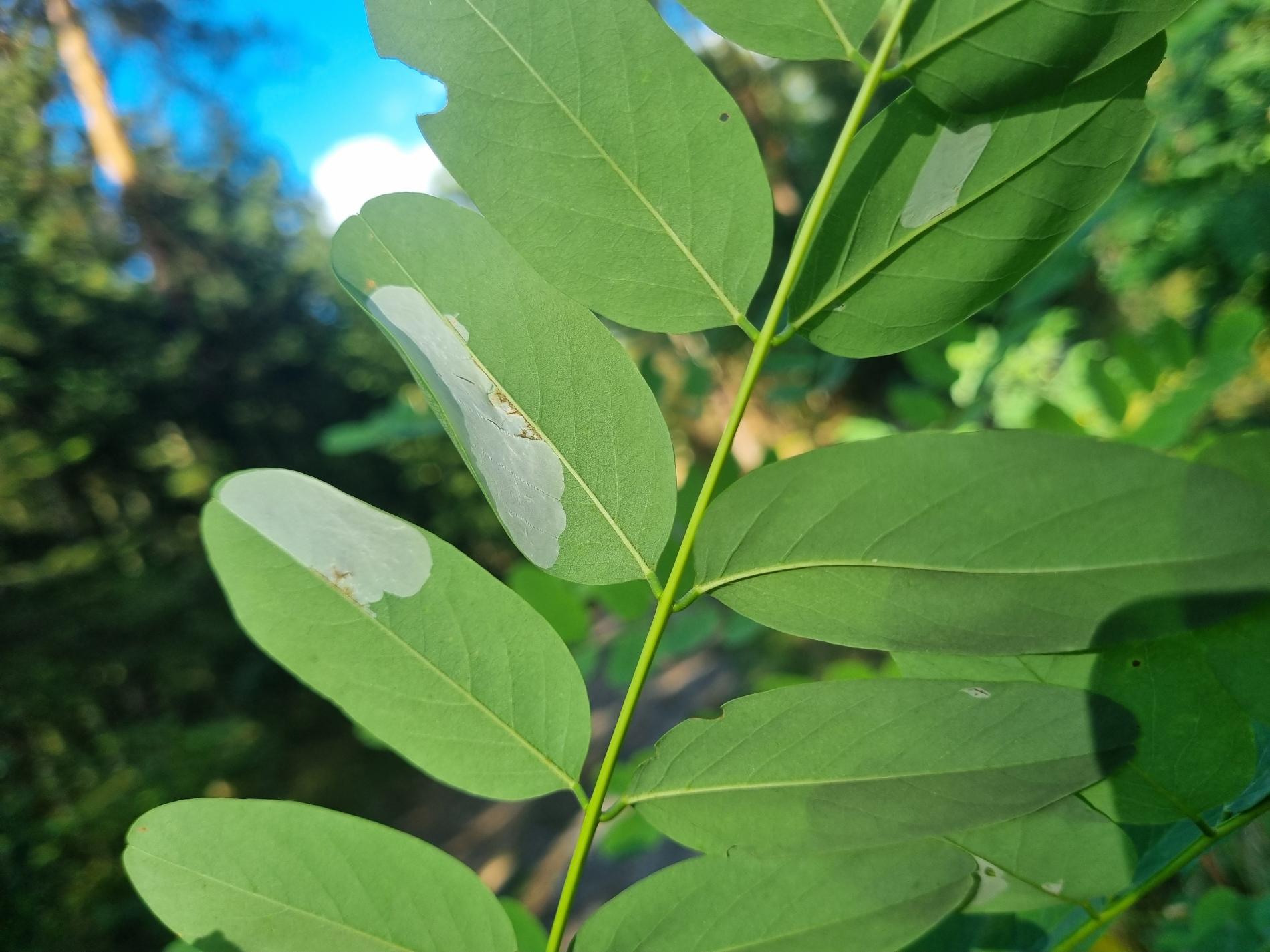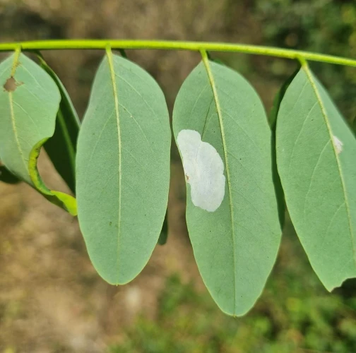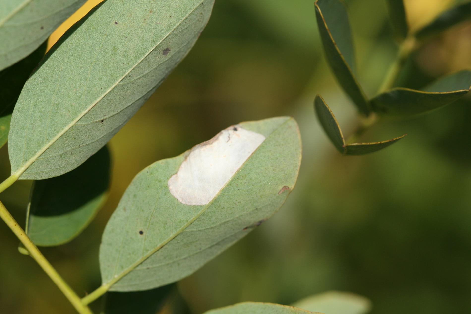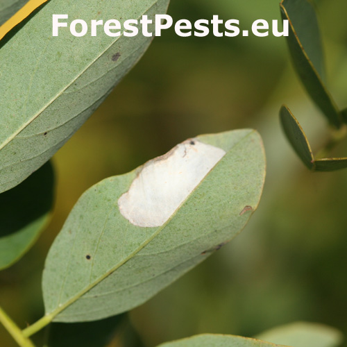 Na začiatku napadnutia sa poškodenie týmto monofágom prejavuje ako malé, neskôr väčšie bledé škvrny na spodnej strane listov agátov bielych (Robinia pseudoacacia), koncom mája a začiatkom júna. Míny neprekračujú stredovú žilku. Neskôr sa tieto škvrny zväčšujú, a koncom septembra je obyčajne celá spodná strana listu silne poškodená. V dôsledku defoliácie bol už v auguste pozorovaný predčasný opad listov.