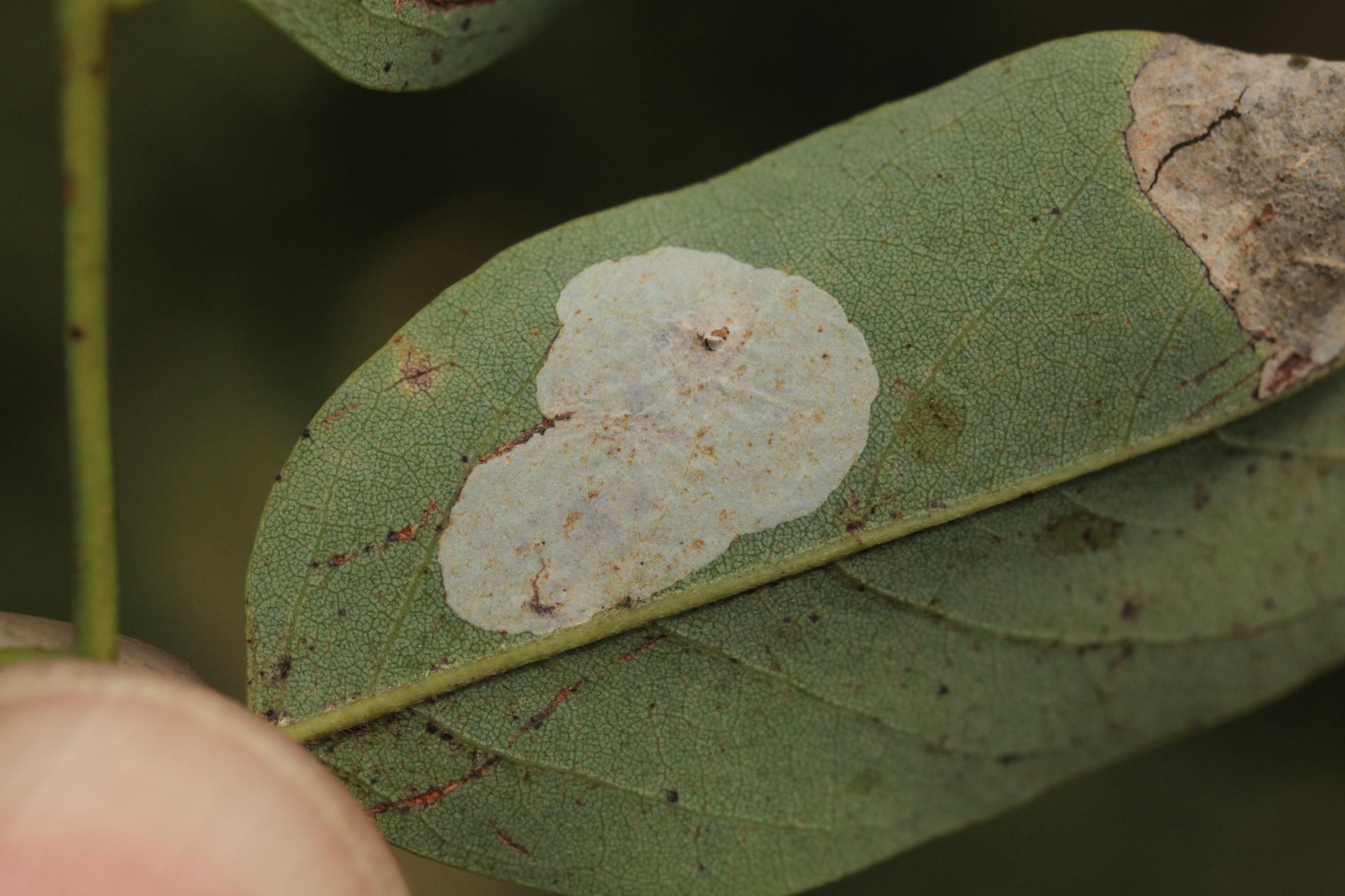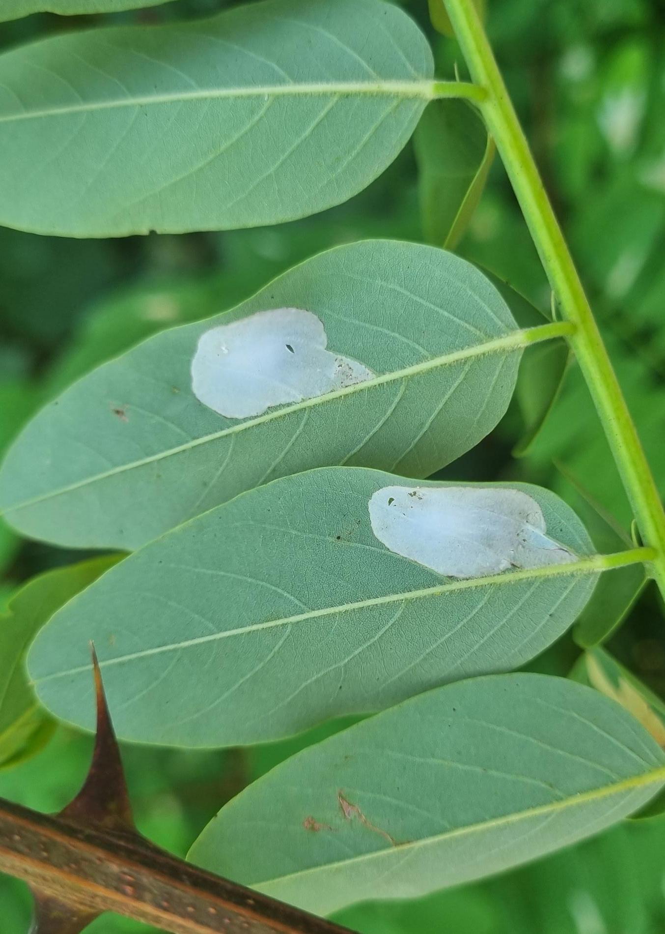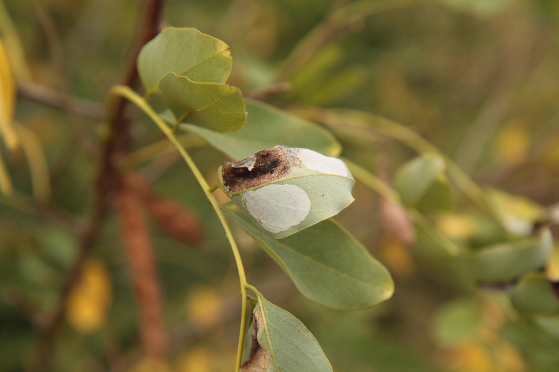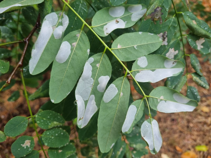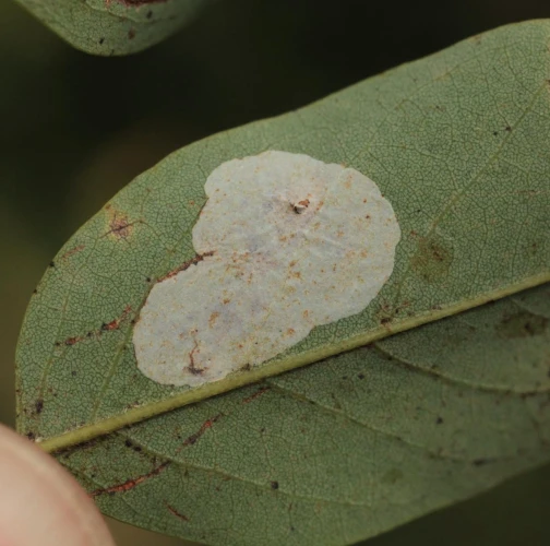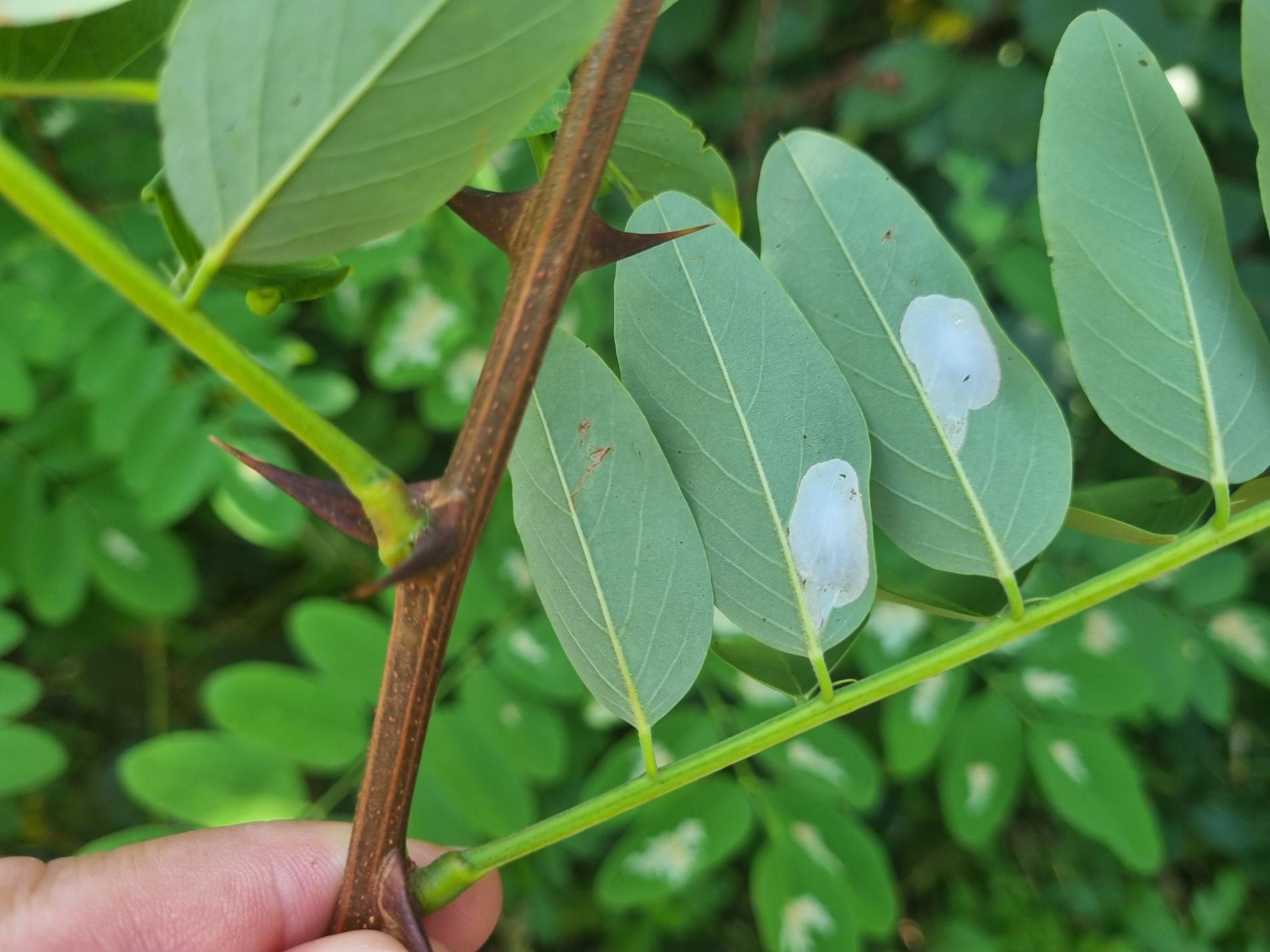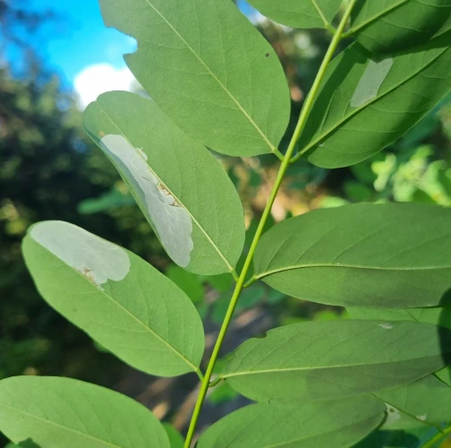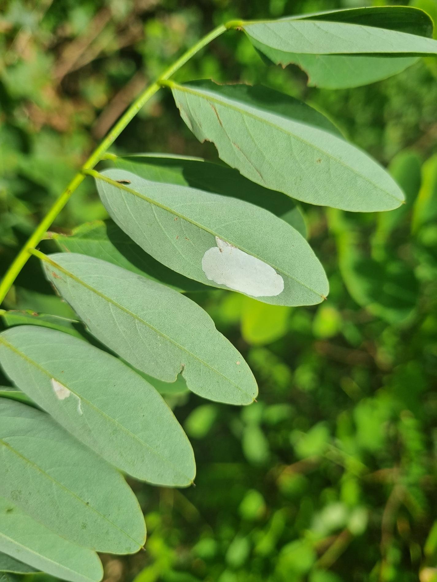Na začiatku napadnutia sa poškodenie týmto monofágom prejavuje ako malé, neskôr väčšie bledé škvrny na spodnej strane listov agátov bielych (Robinia pseudoacacia), koncom mája a začiatkom júna. Míny neprekračujú stredovú žilku. Neskôr sa tieto škvrny zväčšujú, a koncom septembra je obyčajne celá spodná strana listu silne poškodená. V dôsledku defoliácie bol už v auguste pozorovaný predčasný opad listov.
