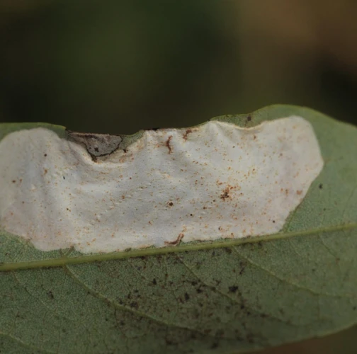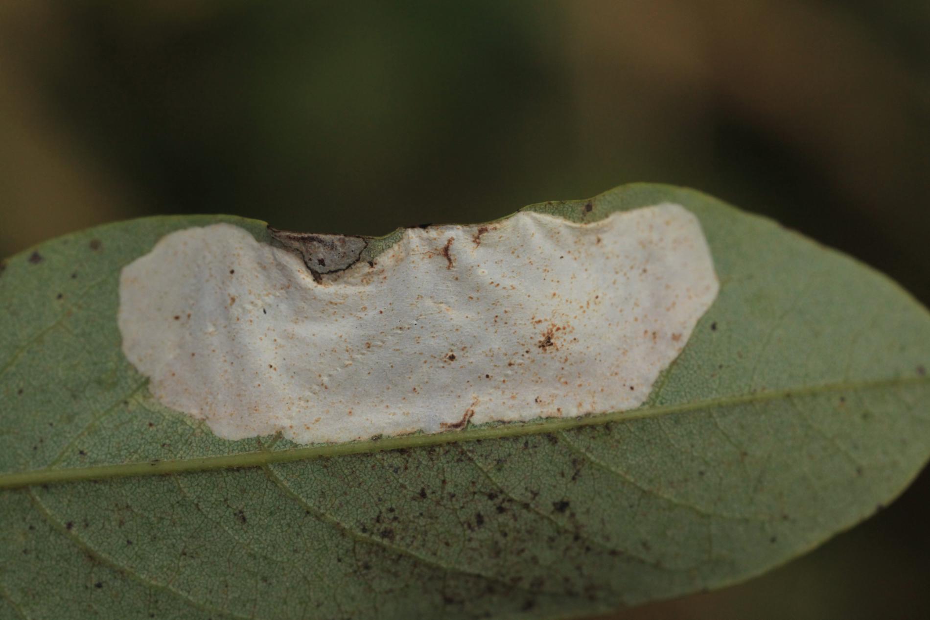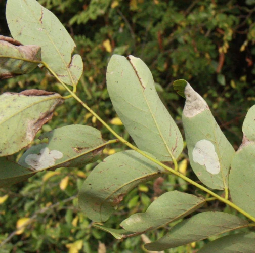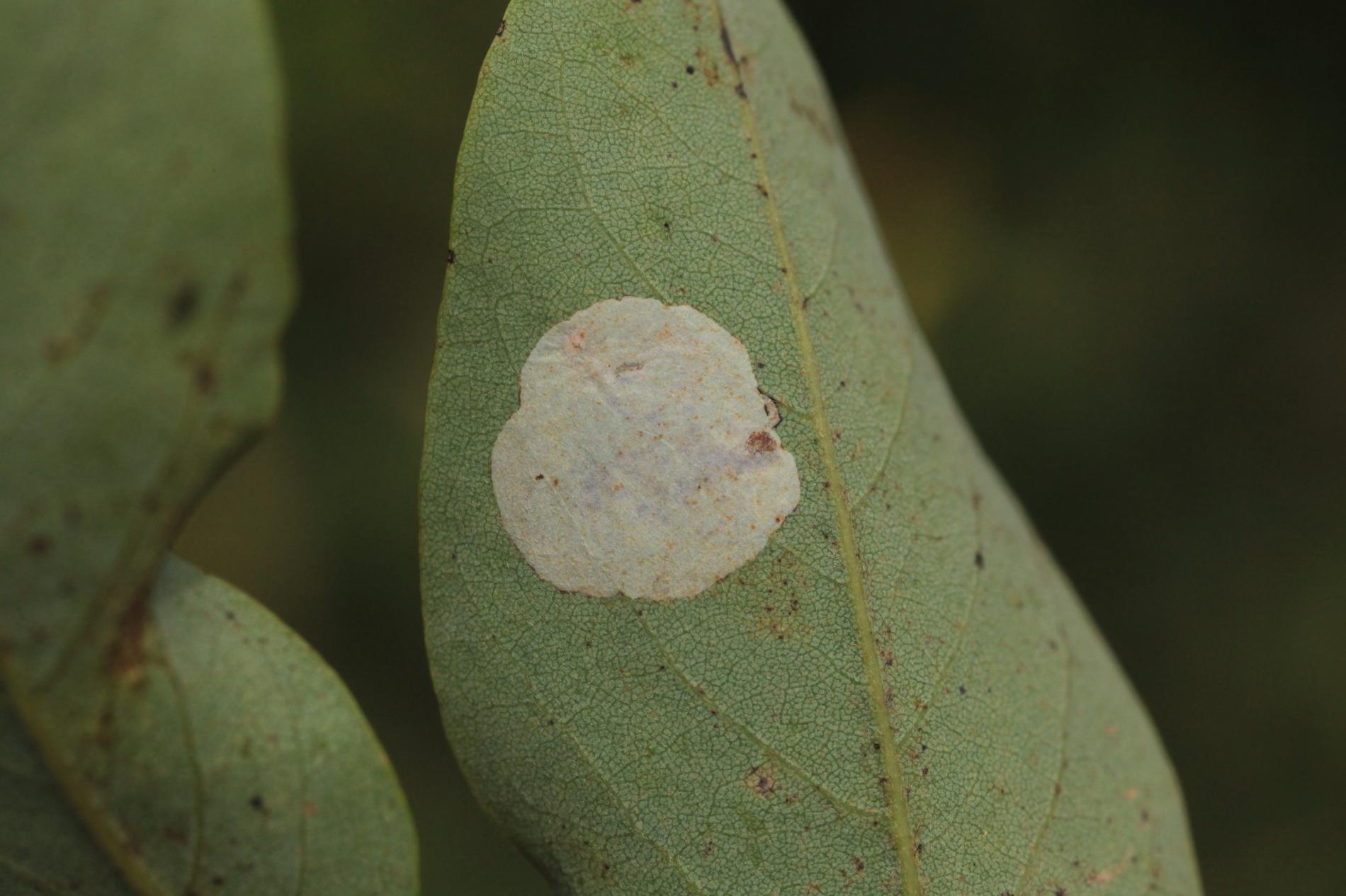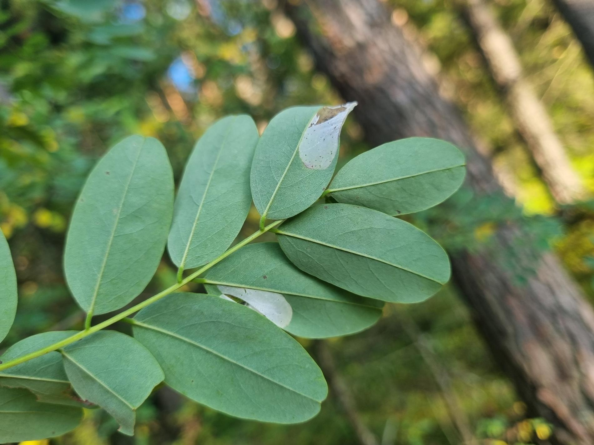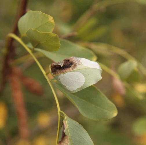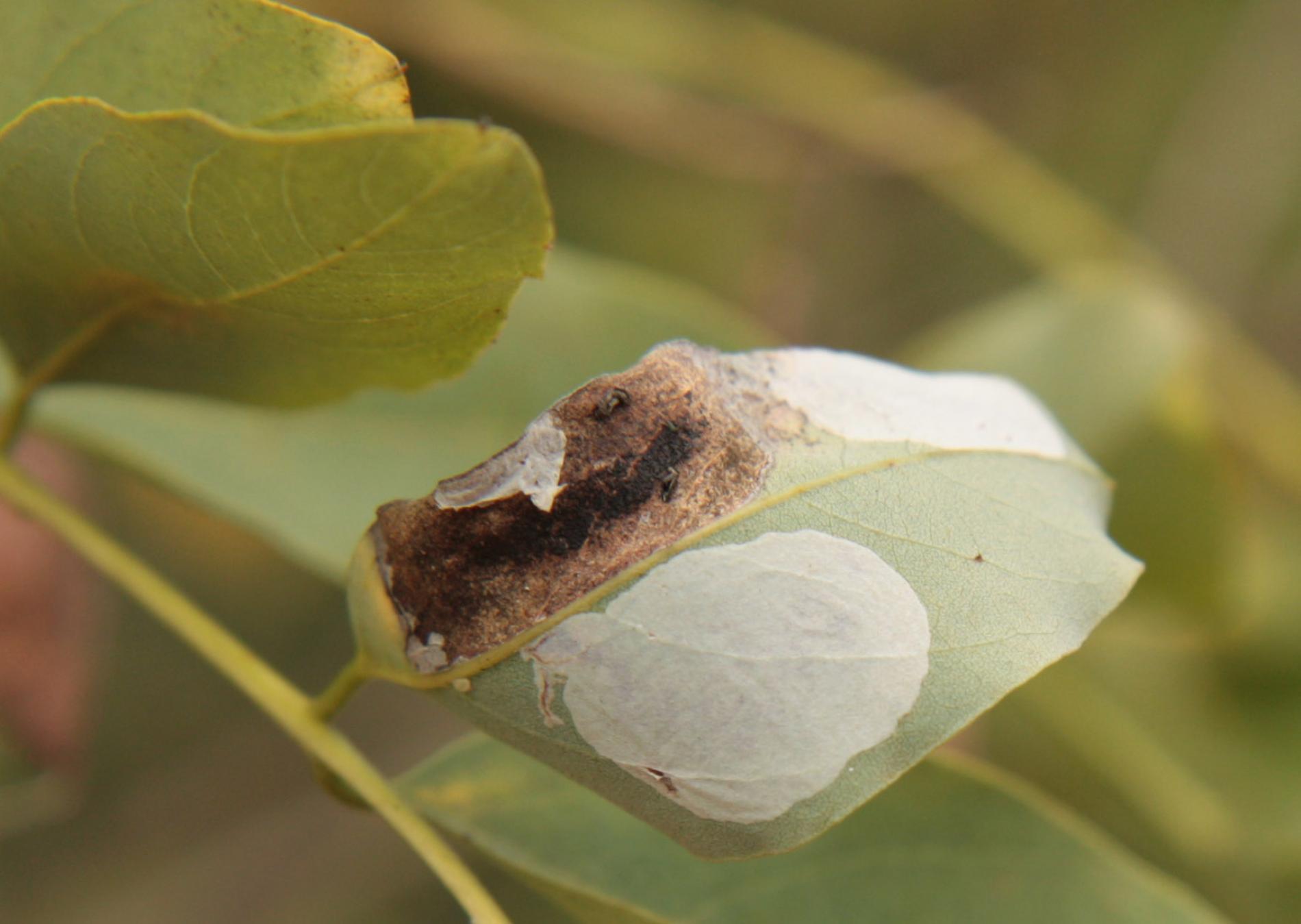 Na začiatku napadnutia sa poškodenie týmto monofágom prejavuje ako malé, neskôr väčšie bledé škvrny na spodnej strane listov agátov bielych (Robinia pseudoacacia), koncom mája a začiatkom júna. Míny neprekračujú stredovú žilku. Neskôr sa tieto škvrny zväčšujú, a koncom septembra je obyčajne celá spodná strana listu silne poškodená. V dôsledku defoliácie bol už v auguste pozorovaný predčasný opad listov.