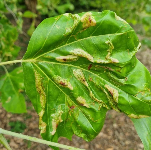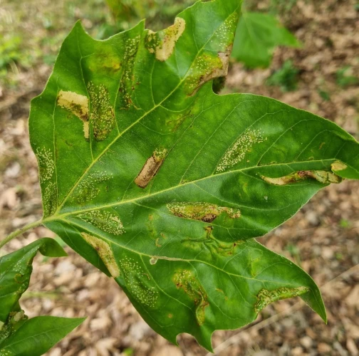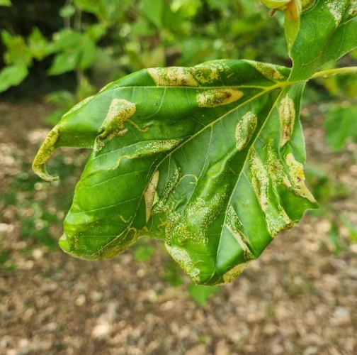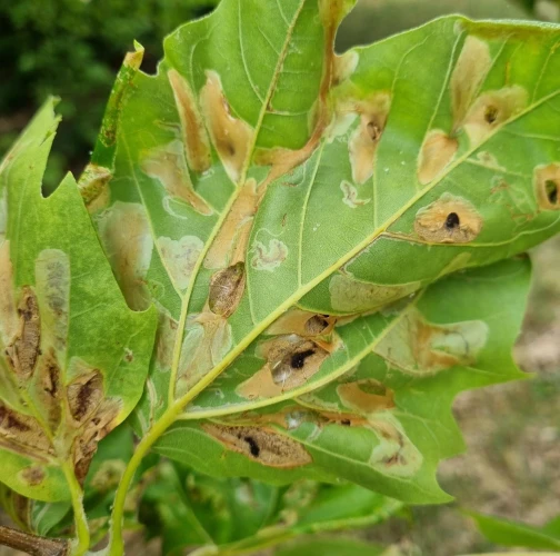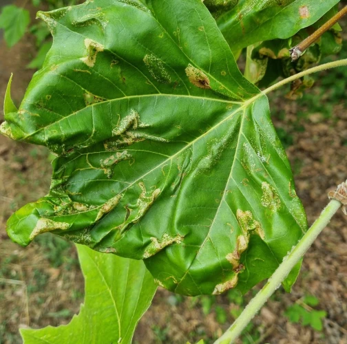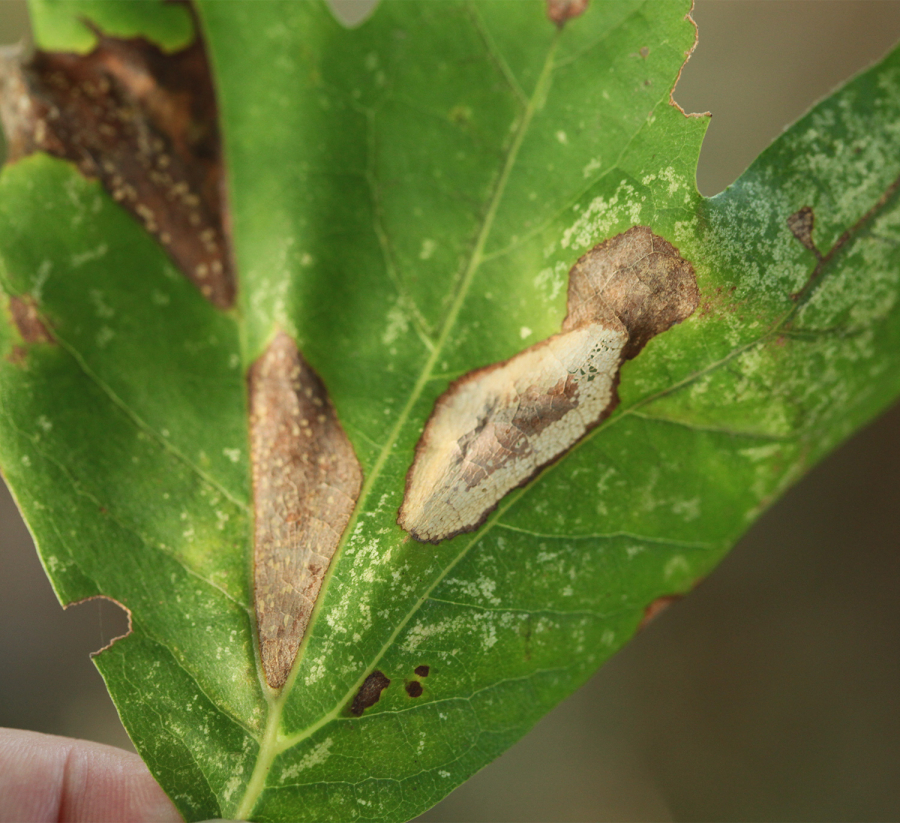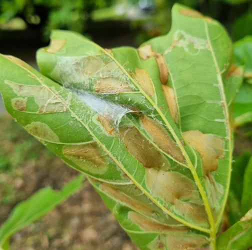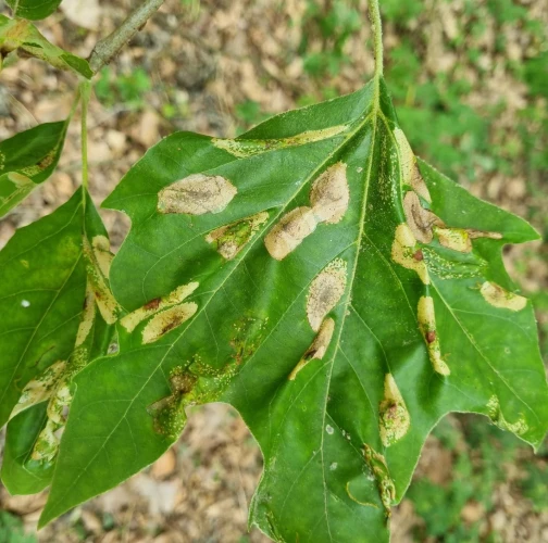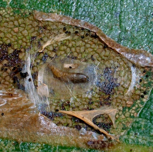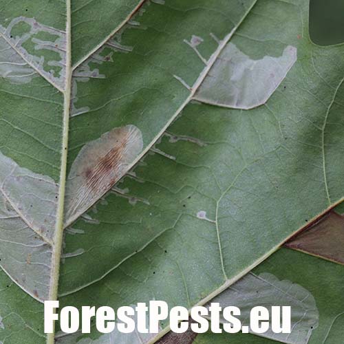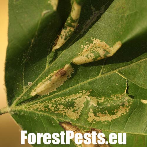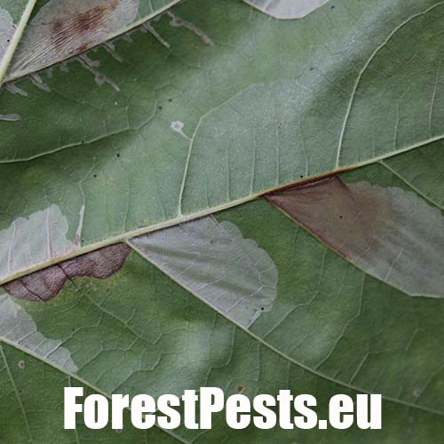 Tento druh malého motýľa z čeľade Gracillariidae sa šíri z Južnej Európy. Drobná hnedo okrová húsenica sposobuje plošné míny na spodnej strane listov. Zriedkavejšie na vrchnej strane listov. Na jednom liste sa môže vyskytovať viacej mín. Motýle lietajú v júni-júly, druhá generácia potom v auguste. Prezimováva ako kukla v opadanom lístí.