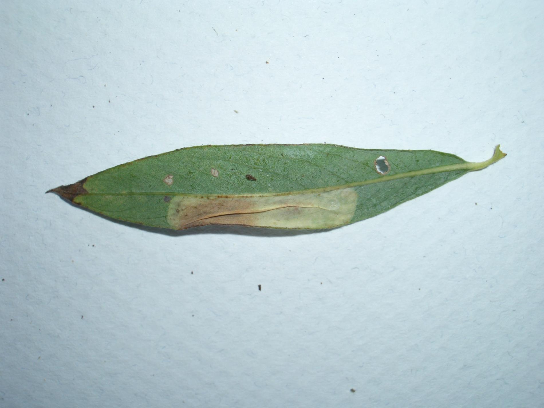 Na listoch sú veľké míny na spodnej strane s výrazným záhybom. Míny obsahujú trus v jednom rohu a môžu spôsobiť čiastočné skrútenie listu.