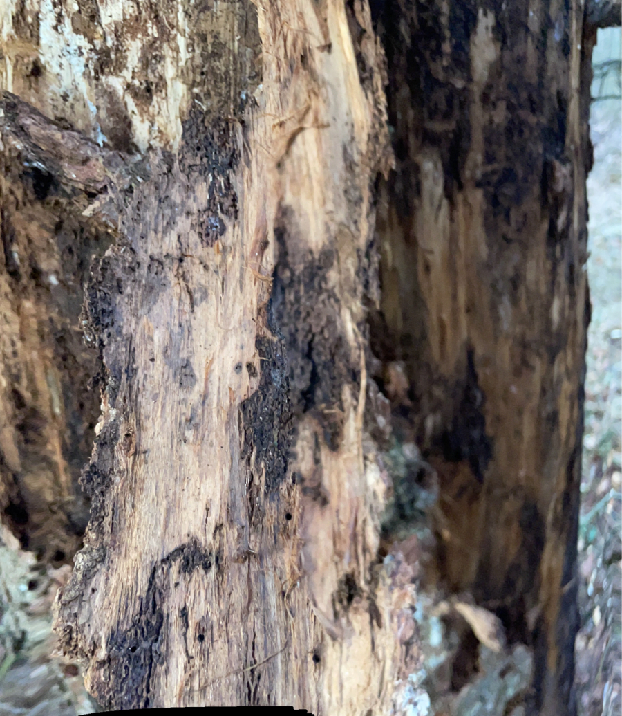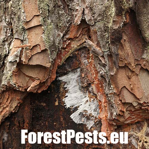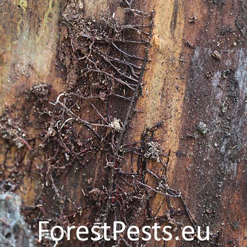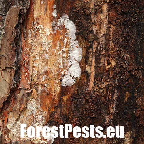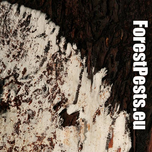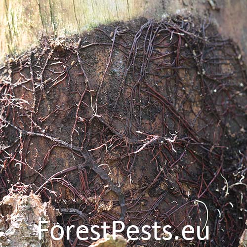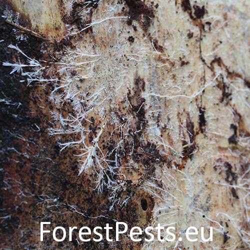 Biele povlaky a povrazcovité útvary pod kôrou, zdurenie (fľaškovitý tvar)kmeňa, na jeseň prítomnosť plodníc na koreňových nábehoch, kmeni a pňoch.
