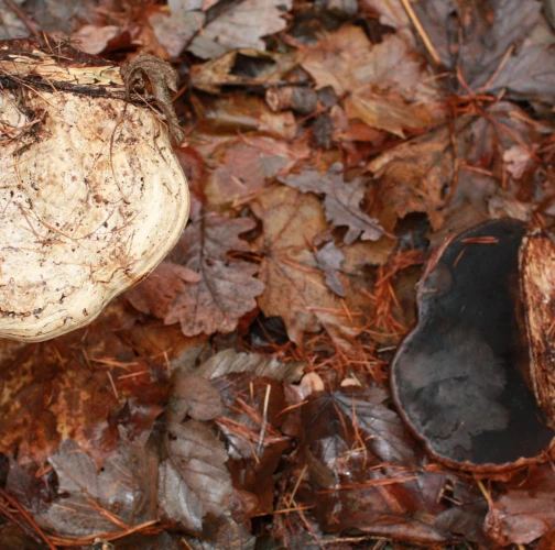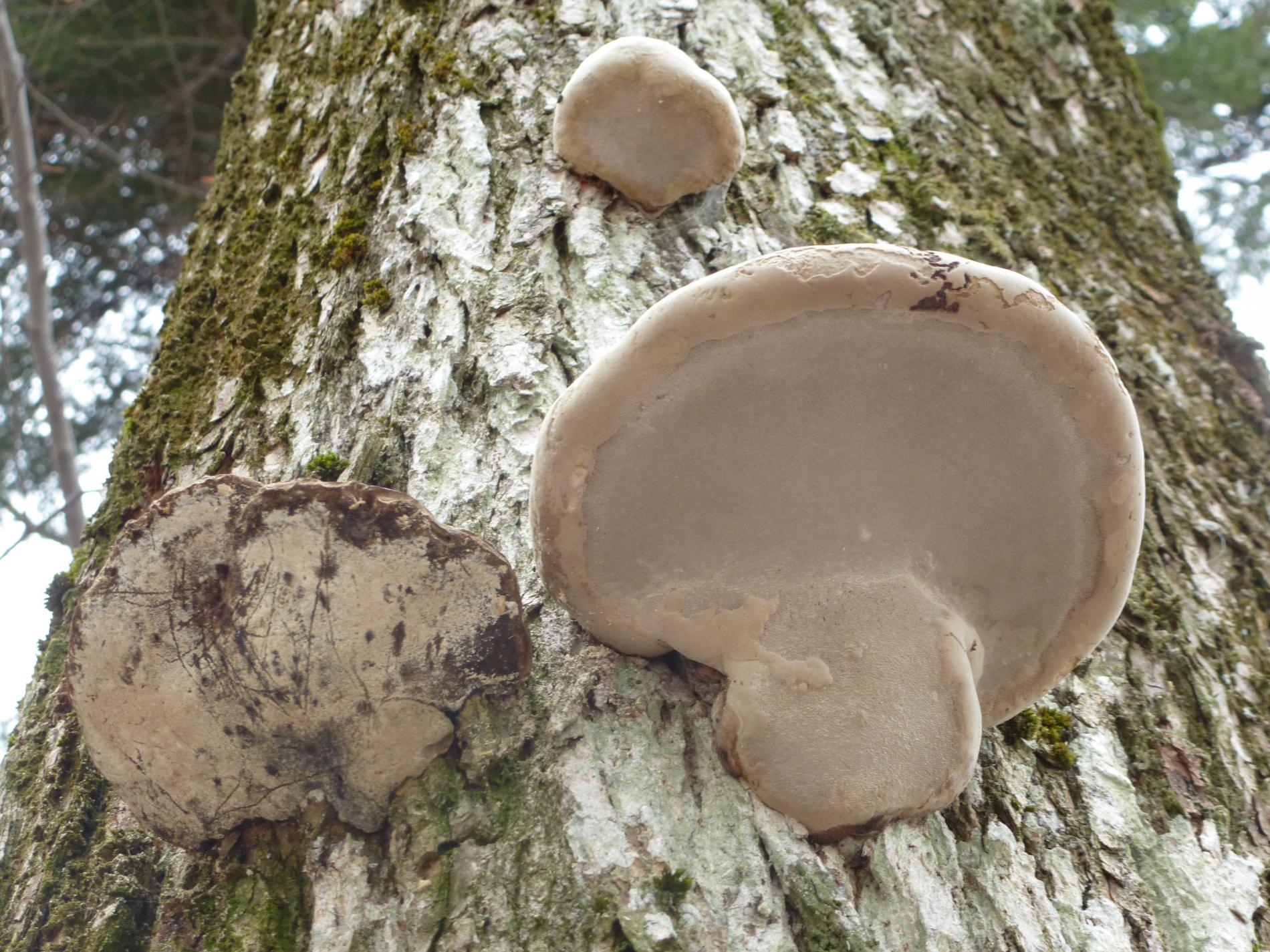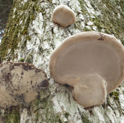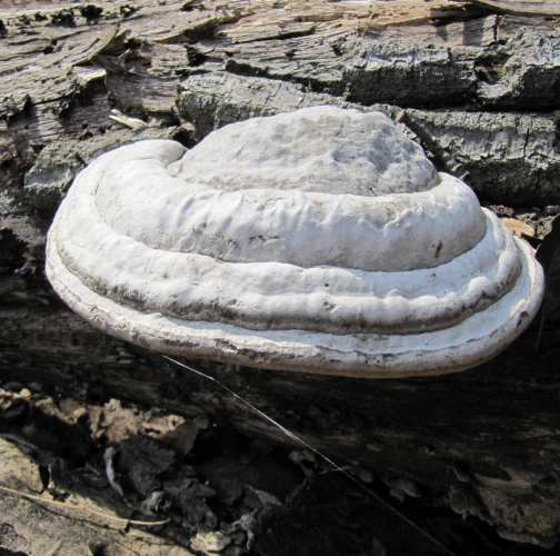 Prítomnosť veľkých, bielo krémových plodníc na kmeňoch s výraznými vrstvami.