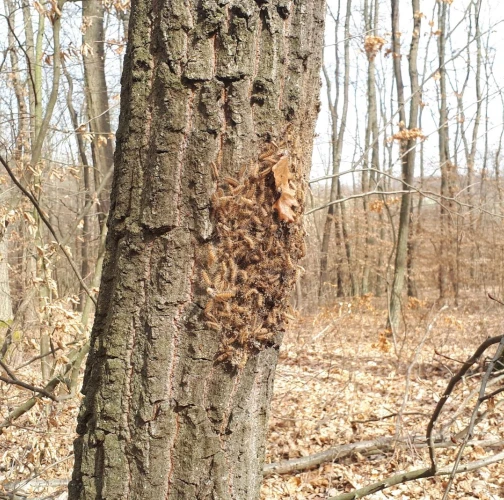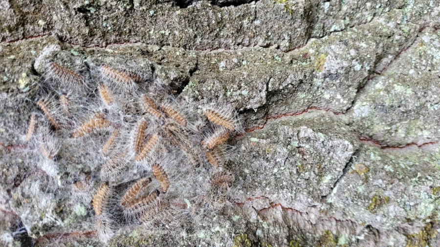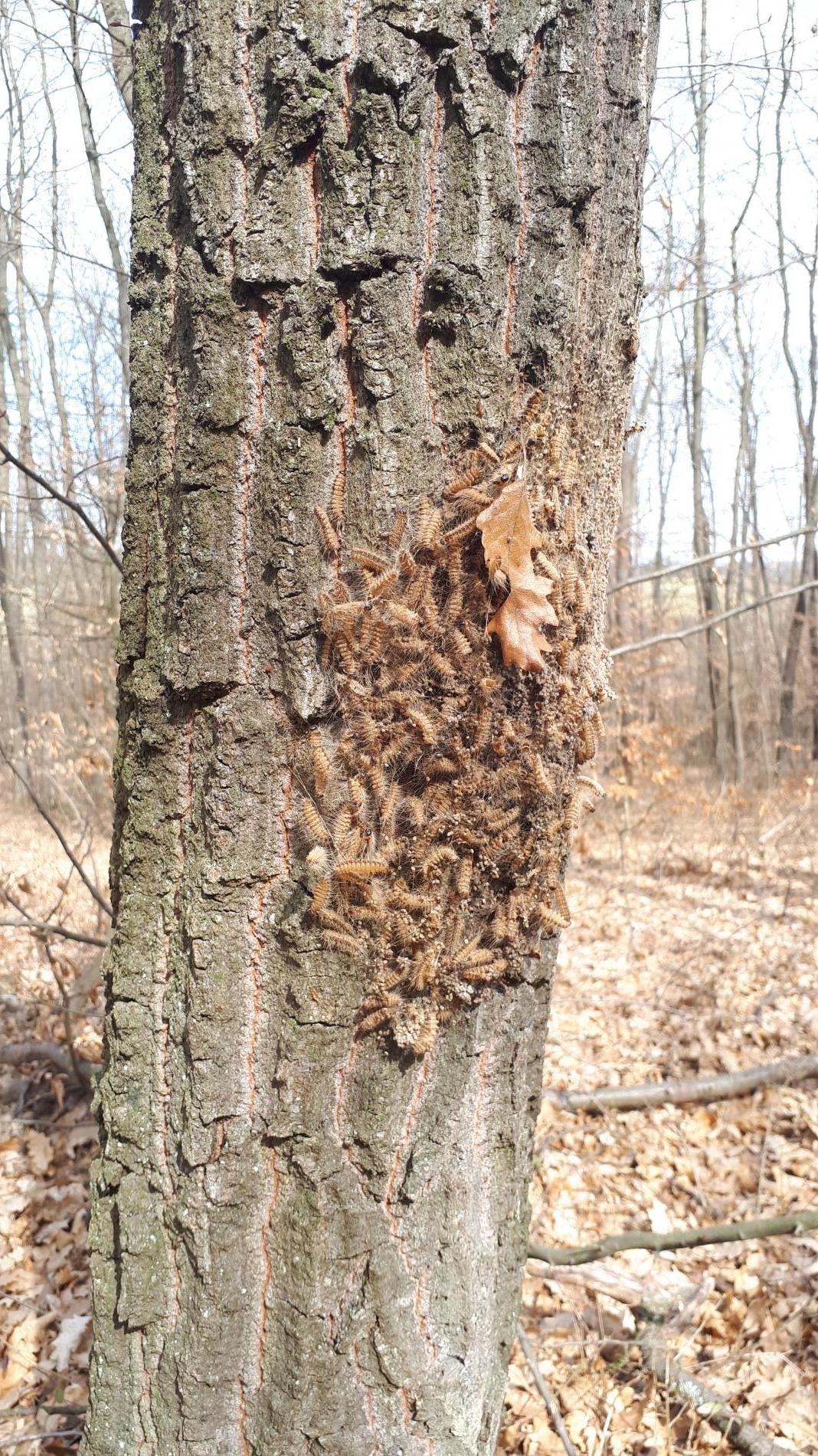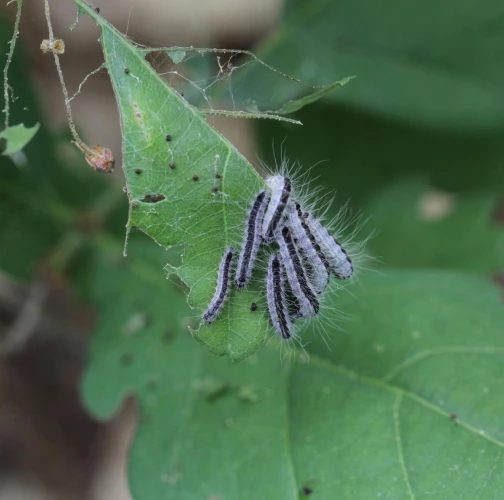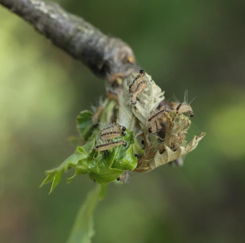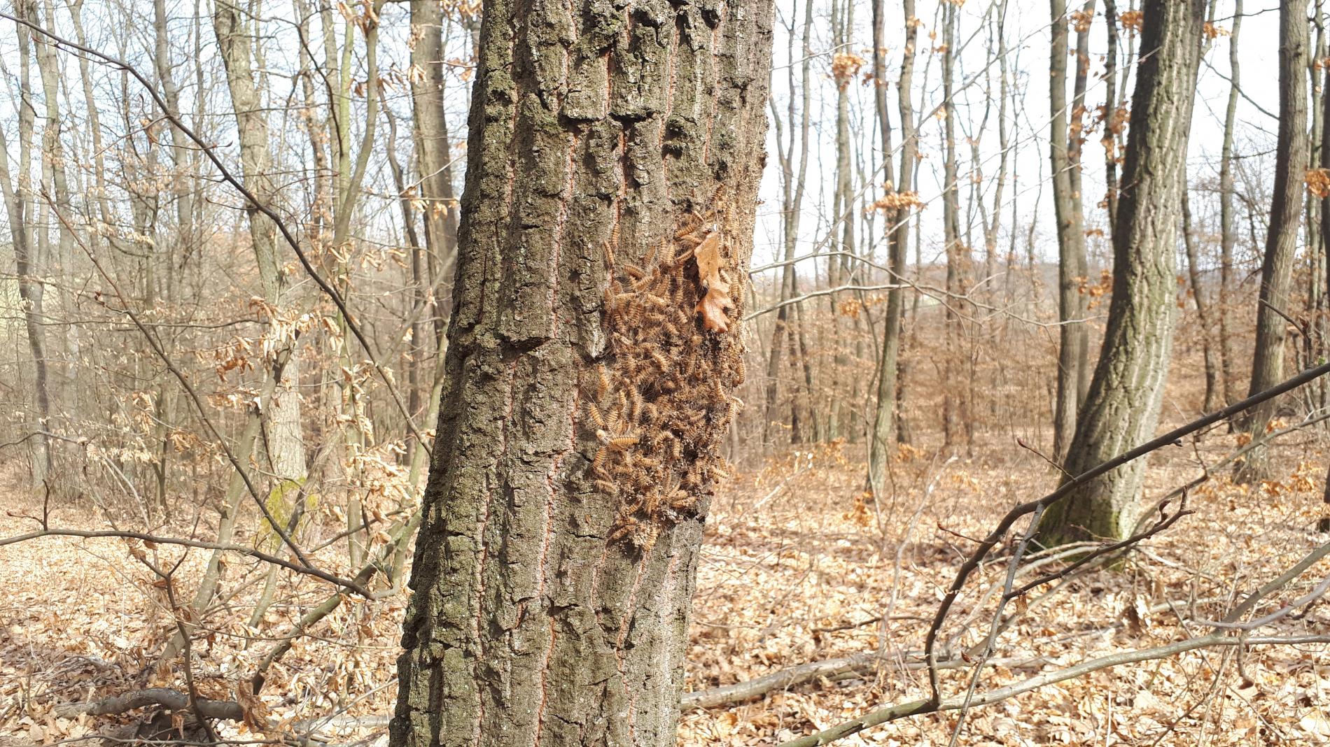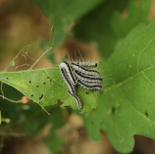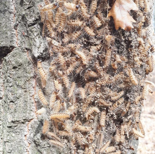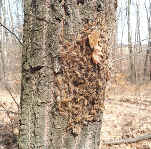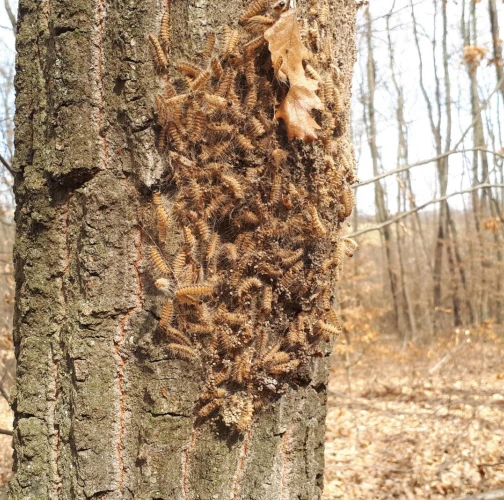 Húsenice žijú spoločne vo vakoch z pradiva umiestnených na kmeňoch stromov. Z nich vyliezajú za potravou, pričom sa pohybujú v radoch jedna za druhou. Dofoliácie, strata olistenia stromov. Pozor! Spôsobuje alergické reakice.