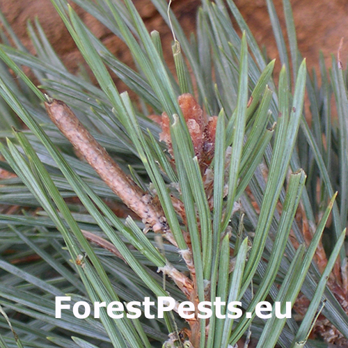 Larvy v procesiách hľdajú miesto na zakuklenie. Defoliácie ihlíc.
