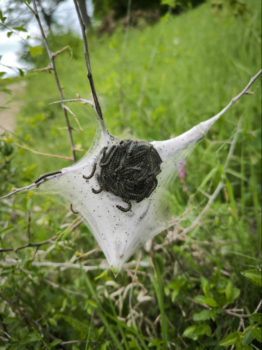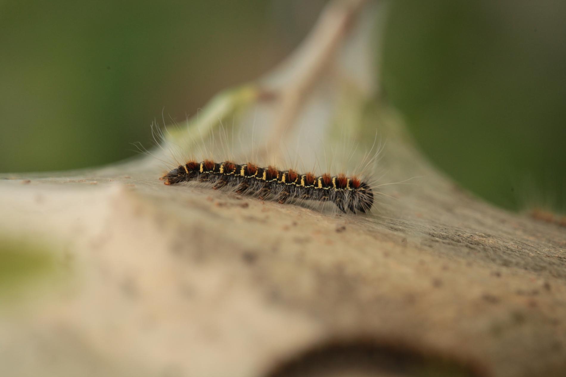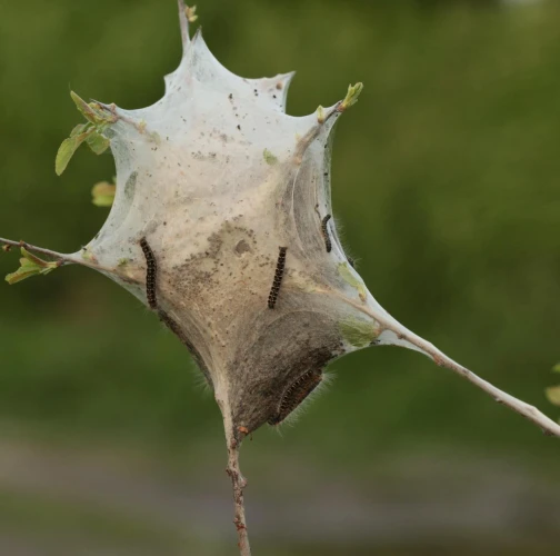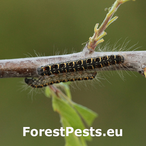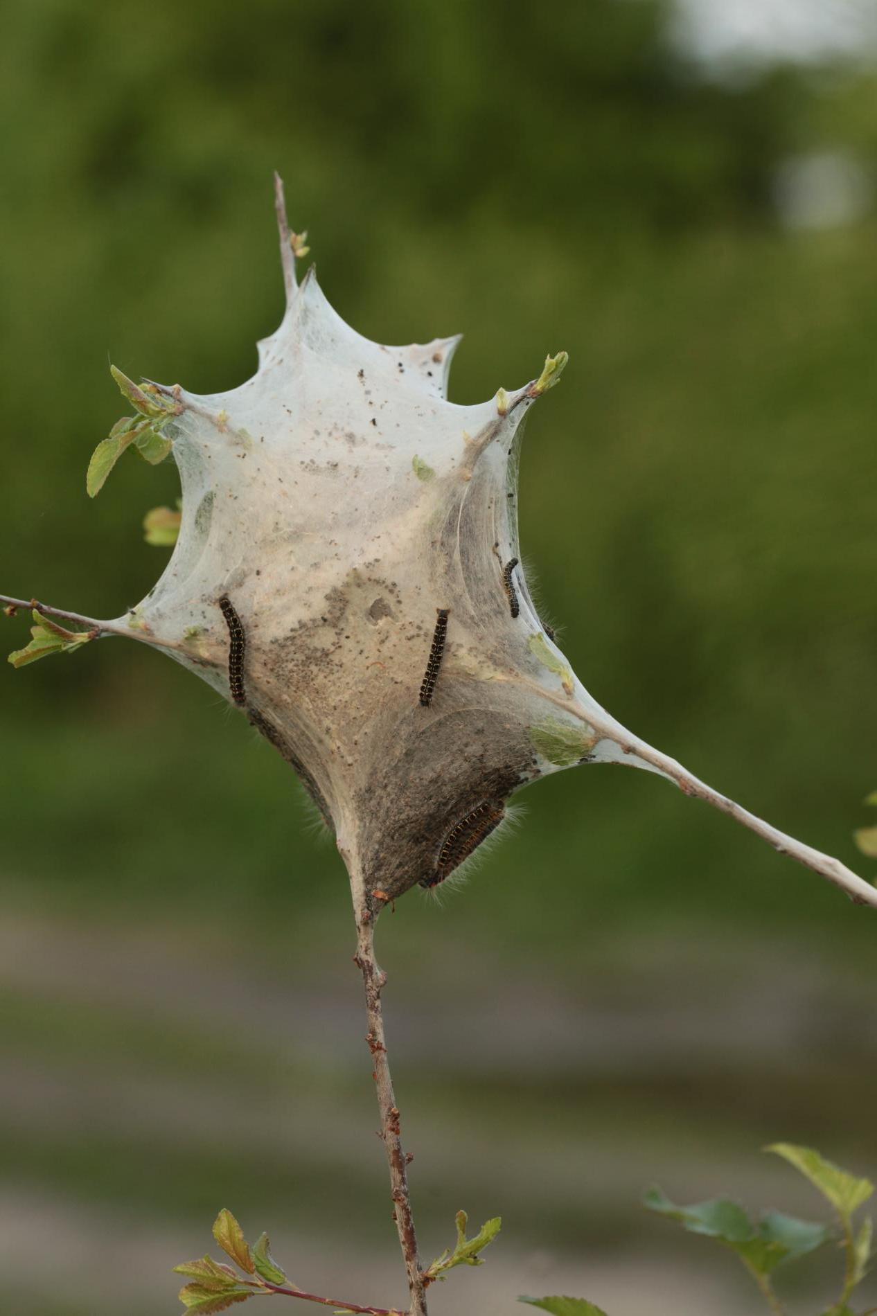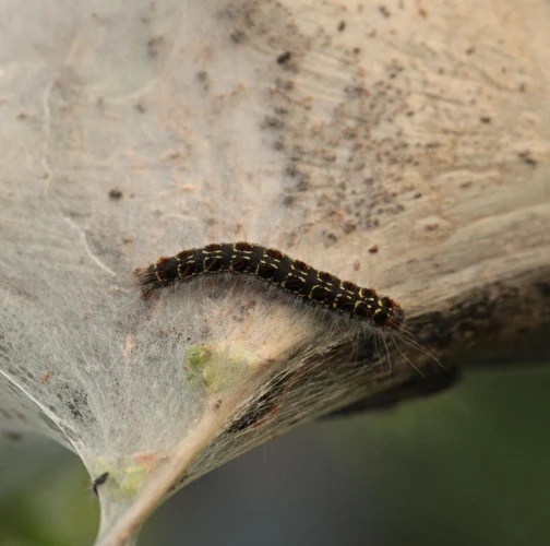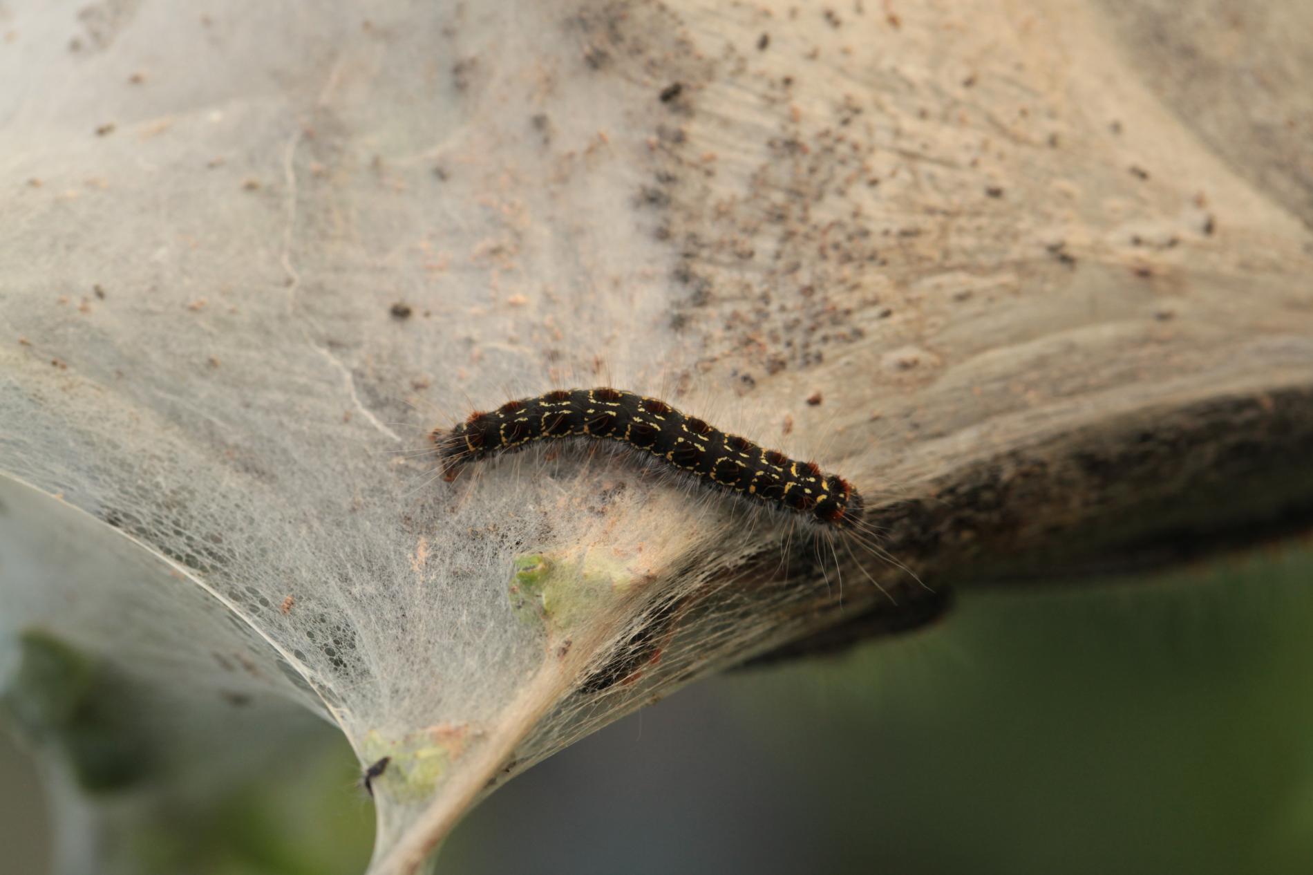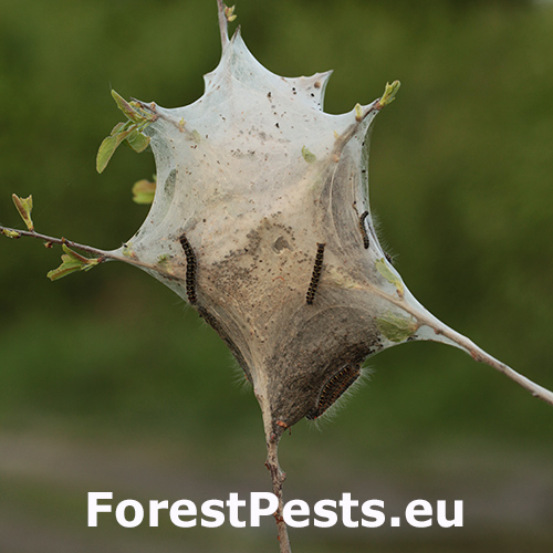 Hodvábne, pavučinové hniezdo na konároch. Defoliácia vetiev. Niekedy je aj časť koruny bez listov. Tmavé, chlpaté húsenice.
