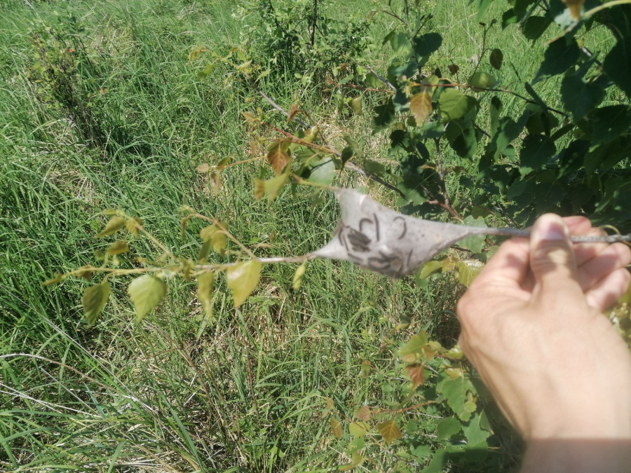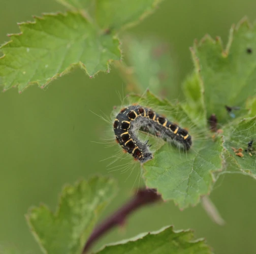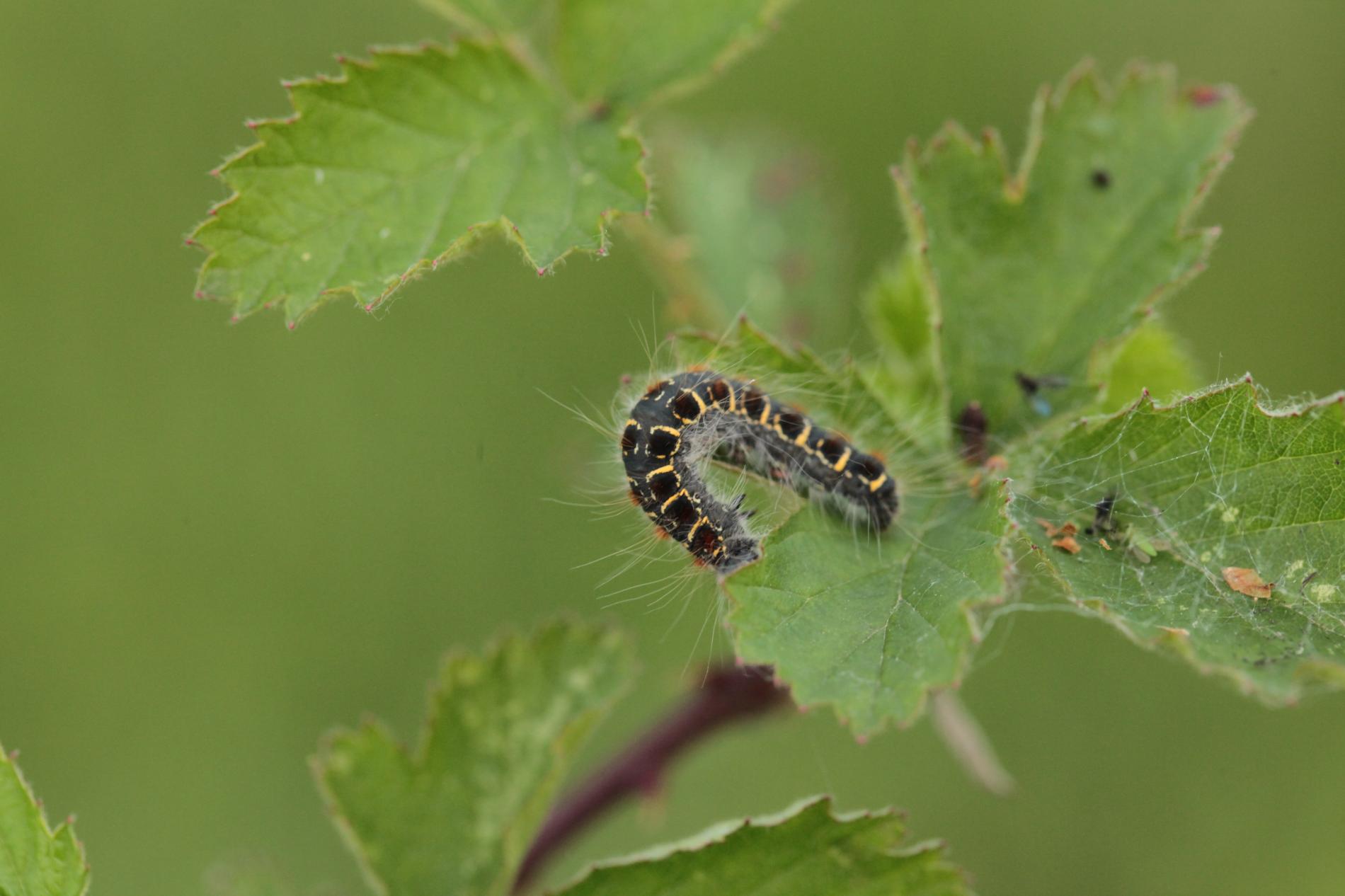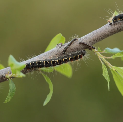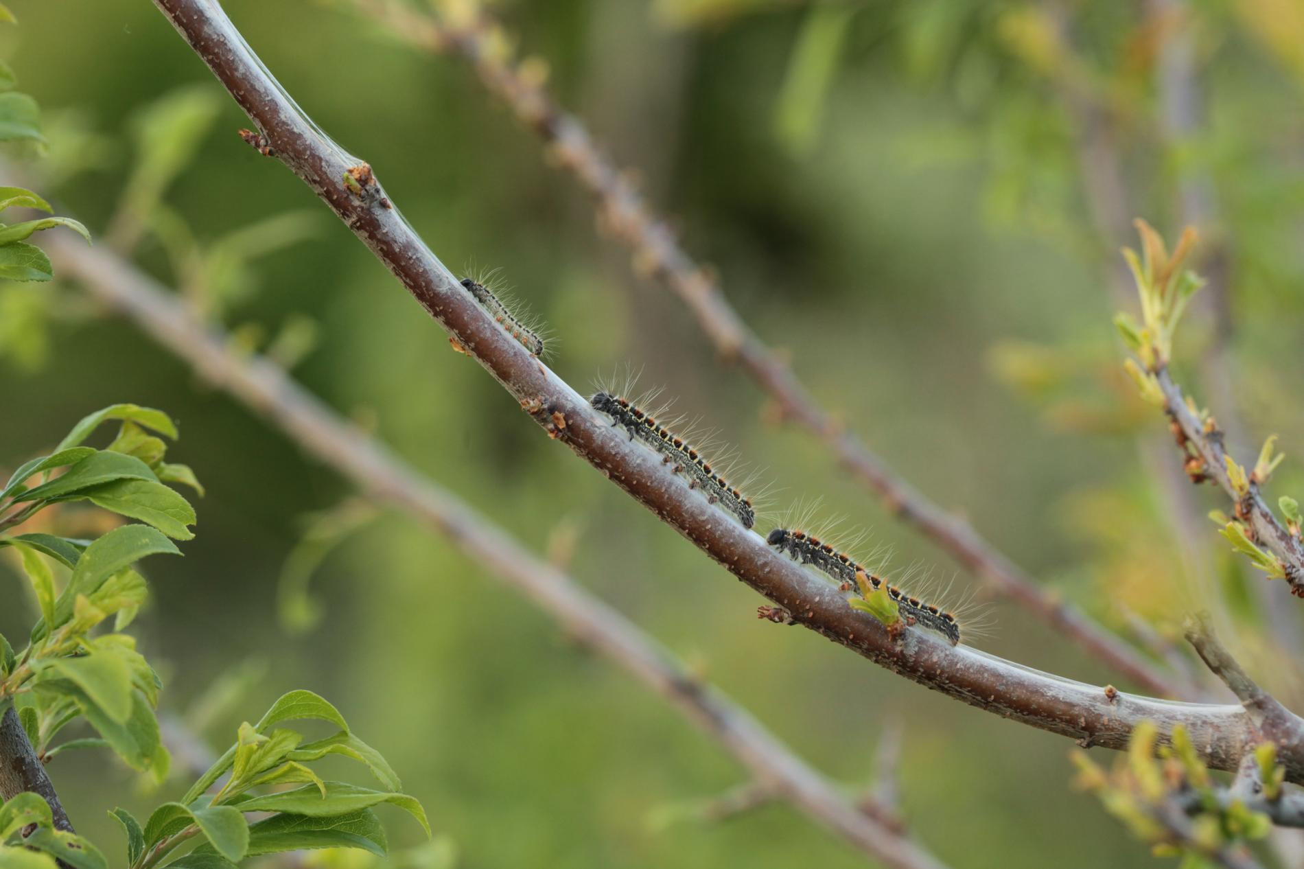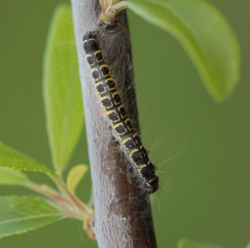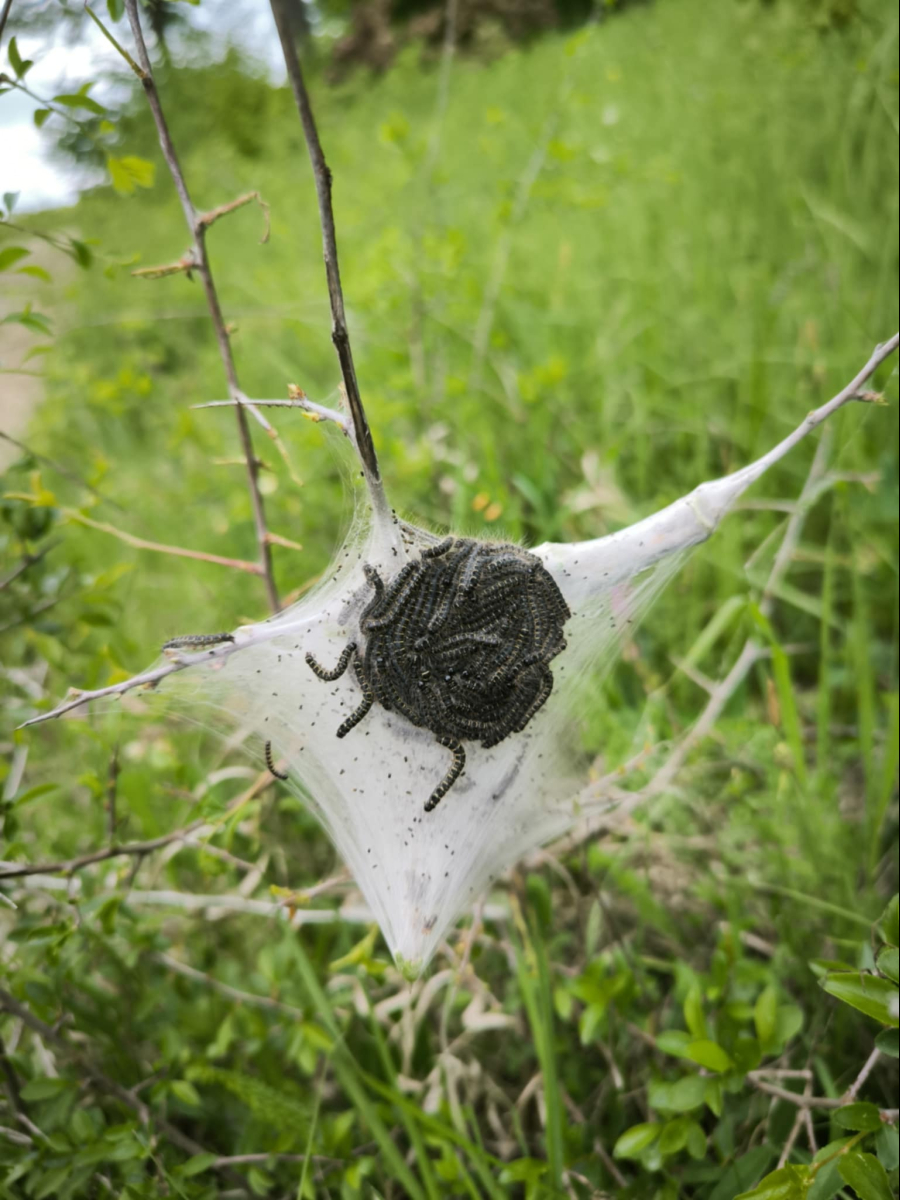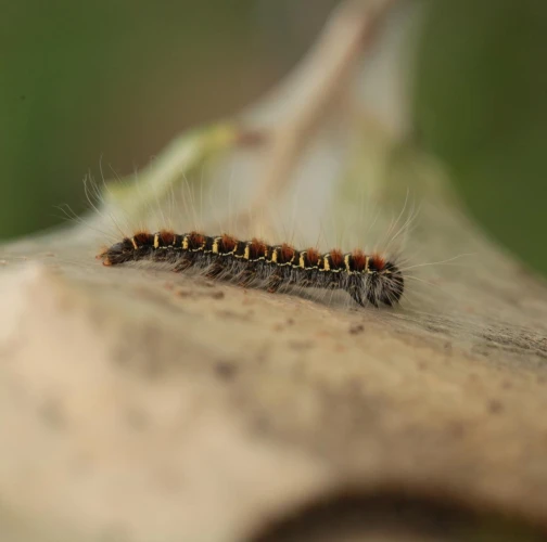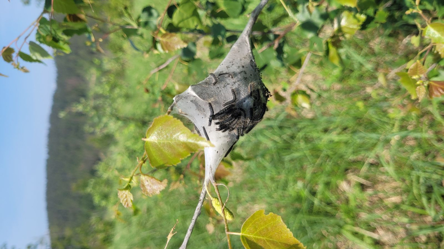 Hodvábne, pavučinové hniezdo na konároch. Defoliácia vetiev. Niekedy je aj časť koruny bez listov. Tmavé, chlpaté húsenice.