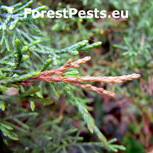 Známkami napadnutia sú zhnednuté a duté končeky výhonkov s prítomnými larvami v požerkoch. Otvory (výletové otvory) na výhonkoch. Na rozdiel od A. thuiella, A. trifasciata napáda prevažne borievky a preferuje teplejšie podmienky.
