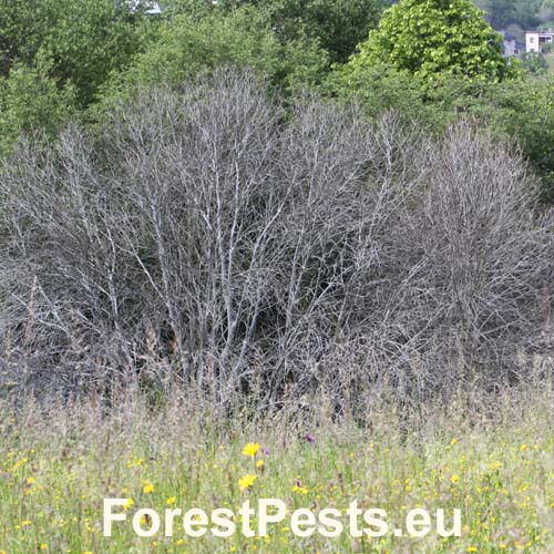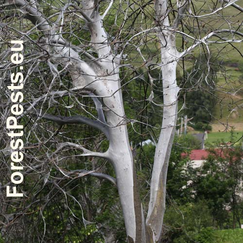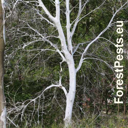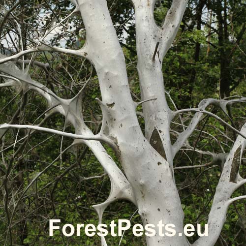 Biele povlaky na kmeňoch a vetvách čremchy. Pavučinové vlákna sú veľmi pevné a kompaktné.