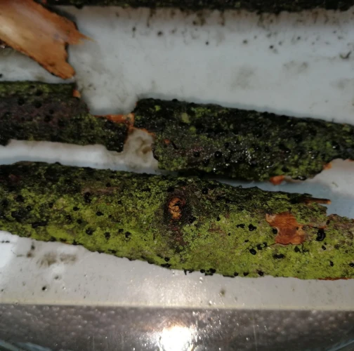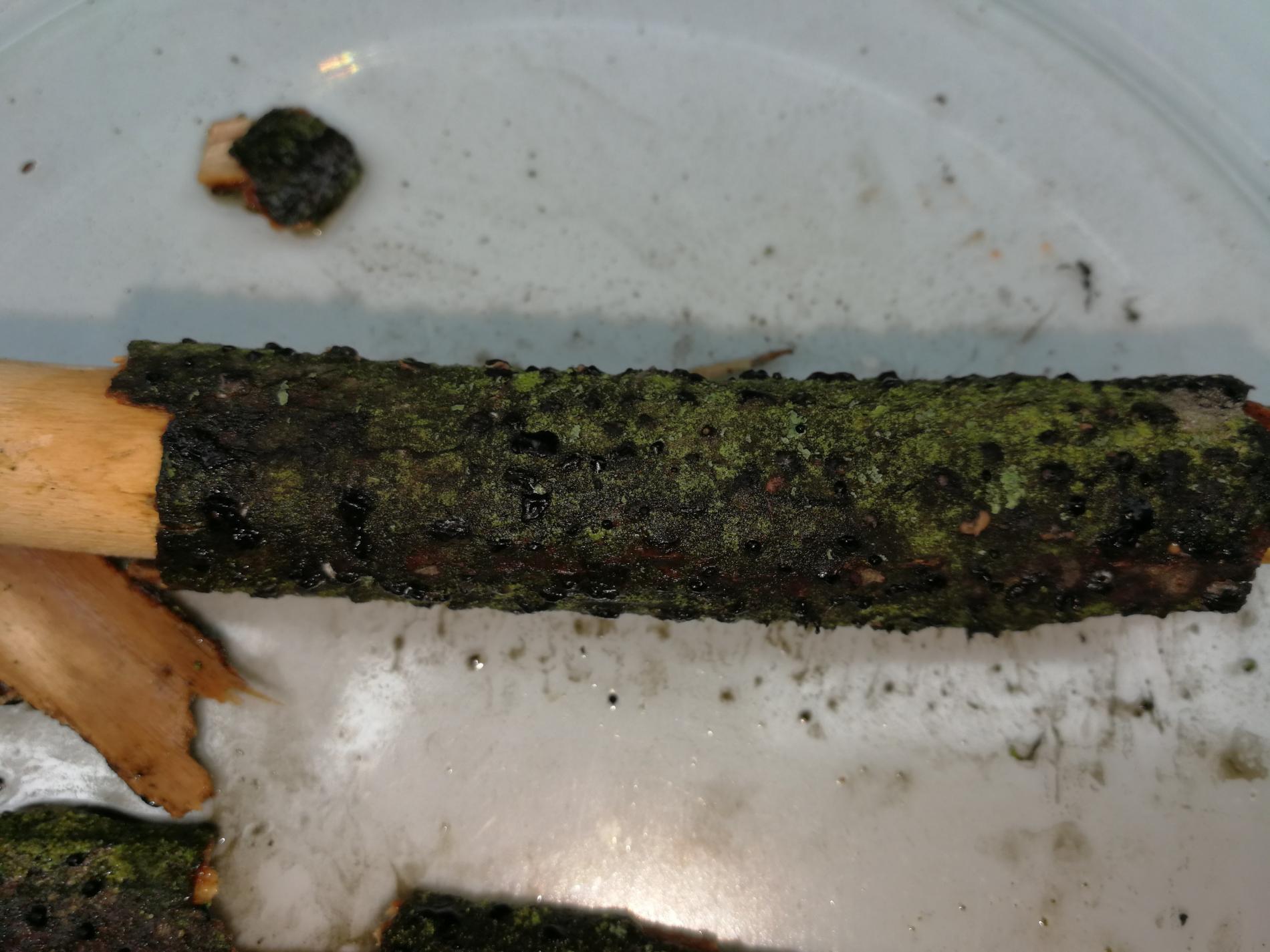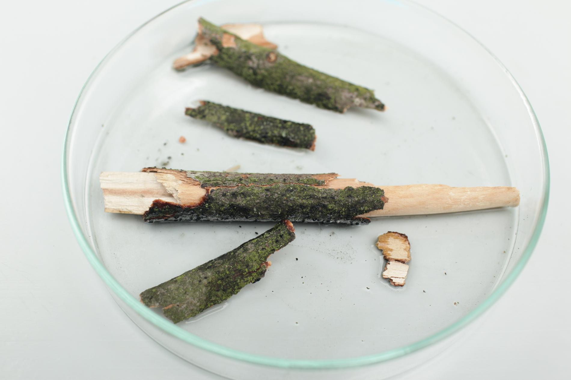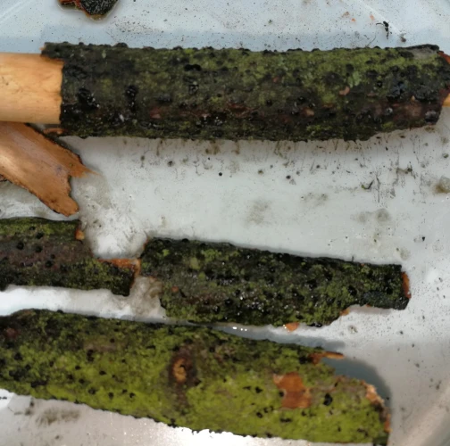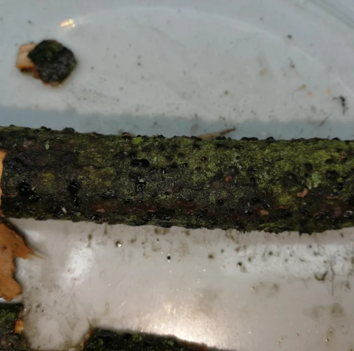 Čierne hrudkovité plodnice sa vytvárajú na povrchu kôry, podkôrne pletivá sú odumreté.
