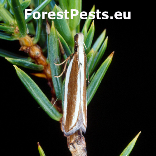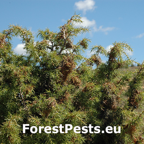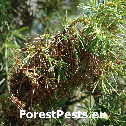 Medzi ihlicami a výhonkami sú jemné pavučinové siete. Ihlice v sieťach sú poškodené, čiastočne vyžraté alebo duté, často so zvyškami trusu.