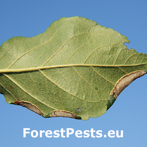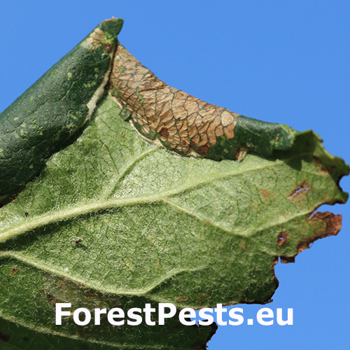 Mína na spodnej strane listu. Okraj listu je prehnutý, vo vnútri žije malá húsenica prípadne sa tam nachádza kukla. V prípade, že toto miesto už larva opustila, môže byť priestor pod záhybom prázdny.