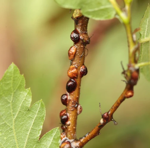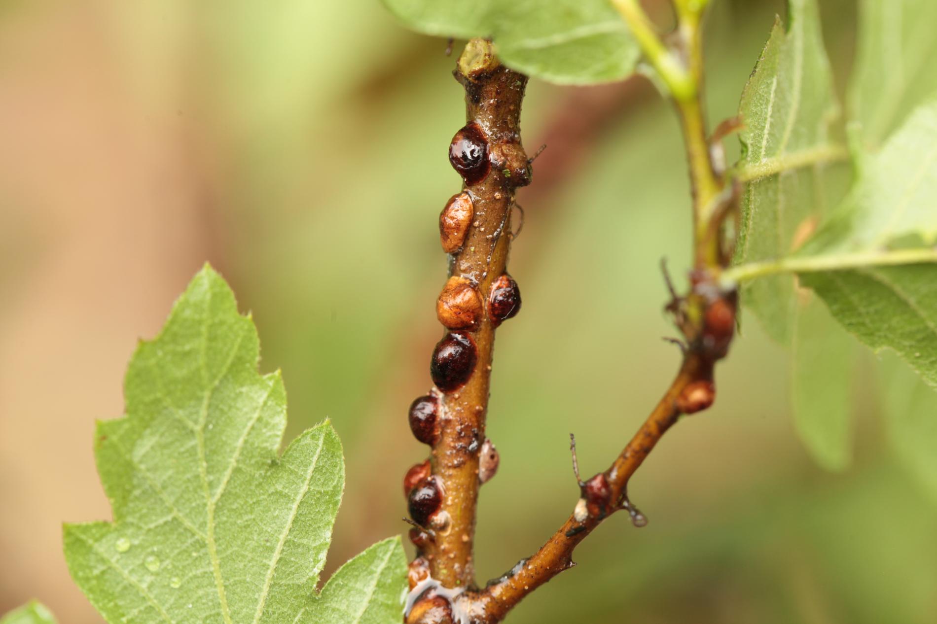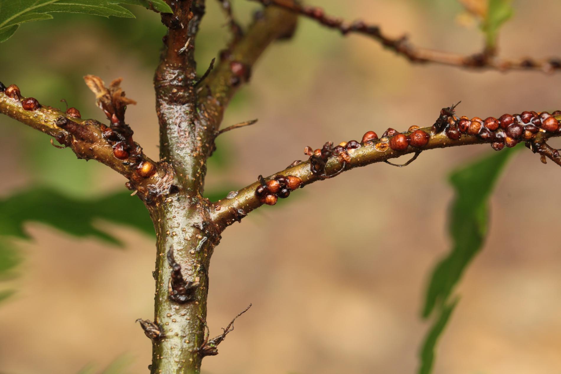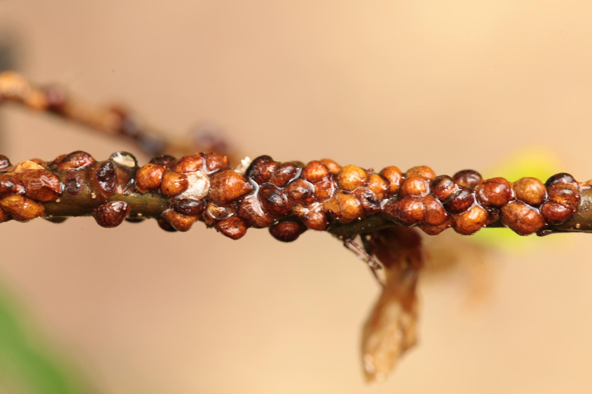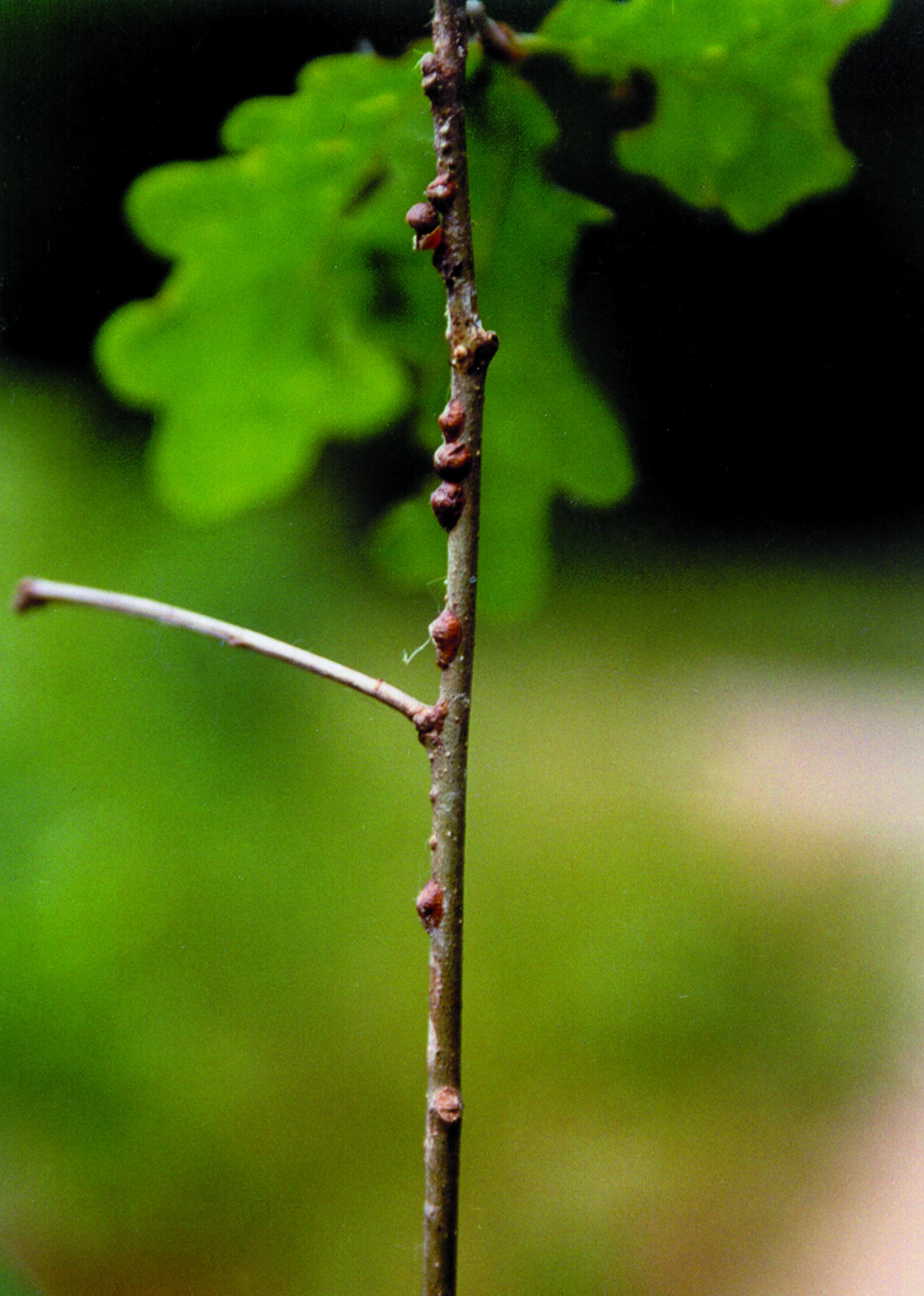 Hnedé, okrúhle, asi 3 – 4 mm veľké útvary na výhonkoch.