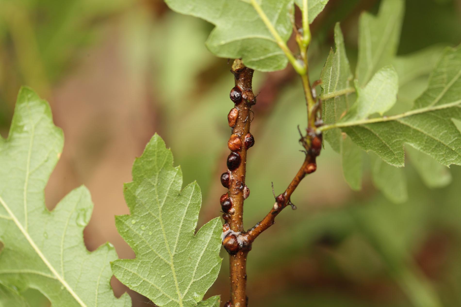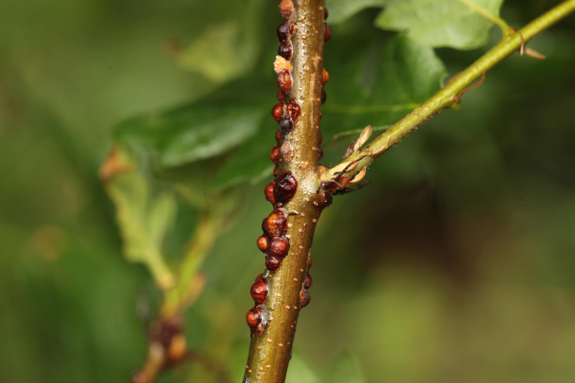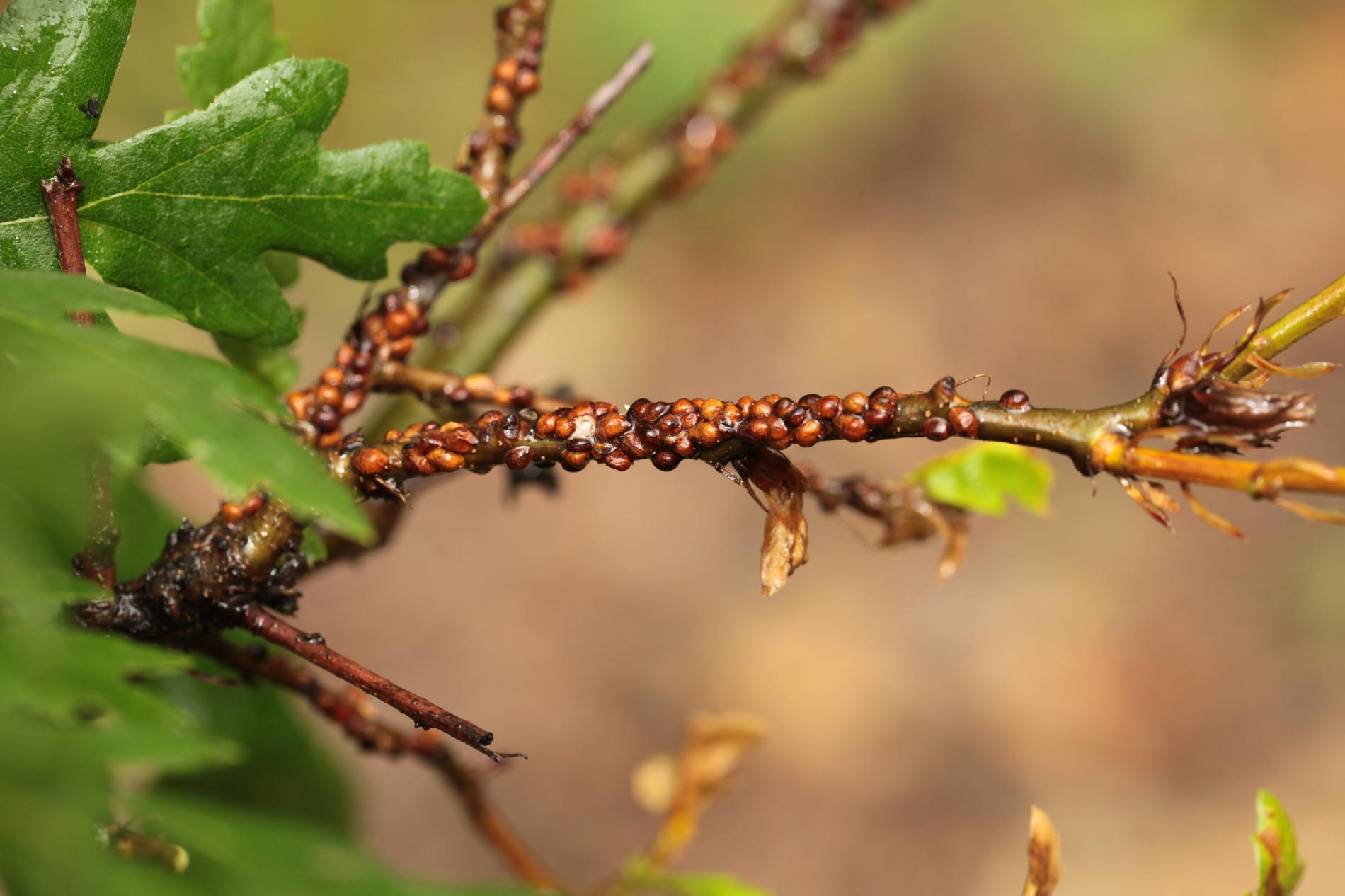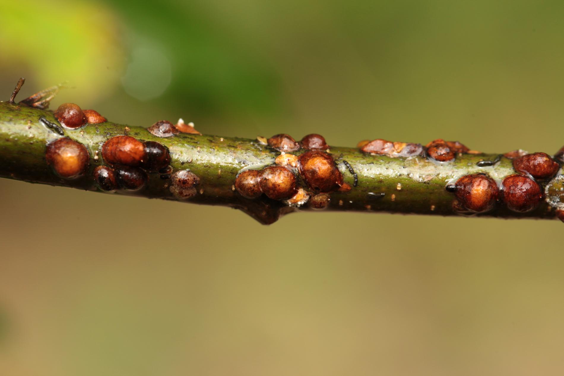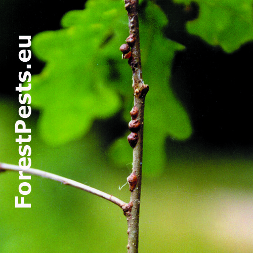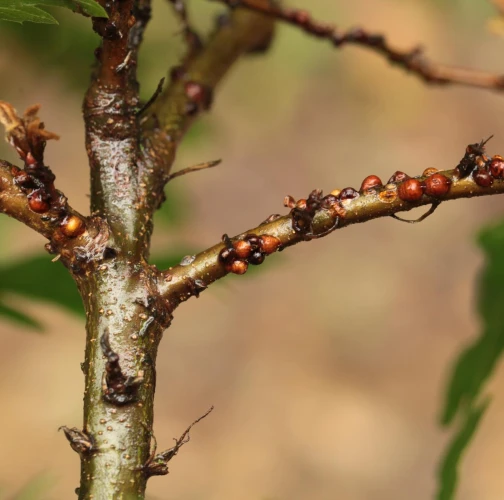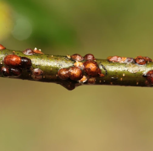 Hnedé, okrúhle, asi 3 – 4 mm veľké útvary na výhonkoch.