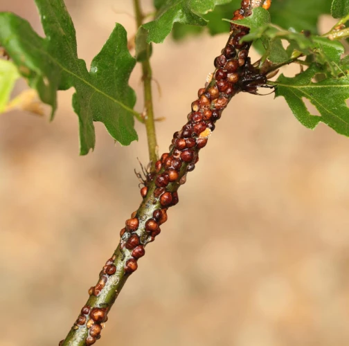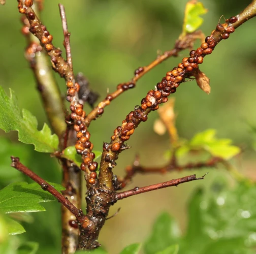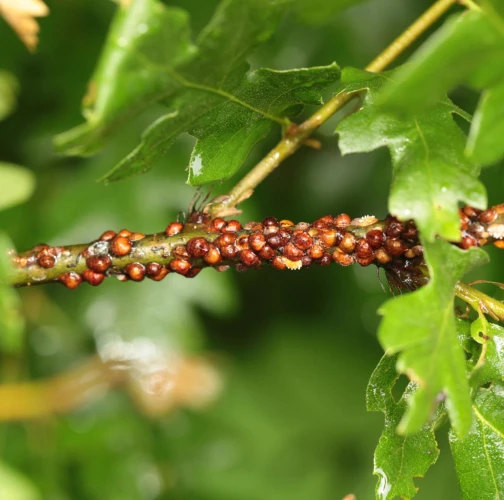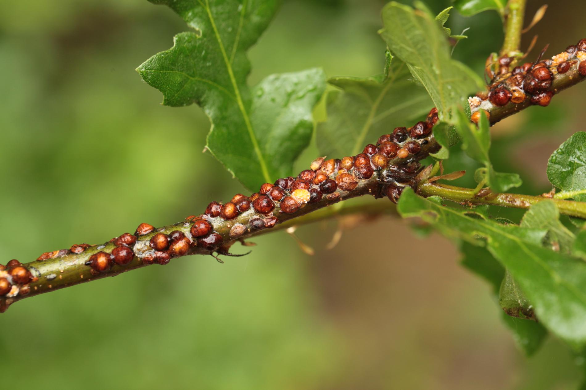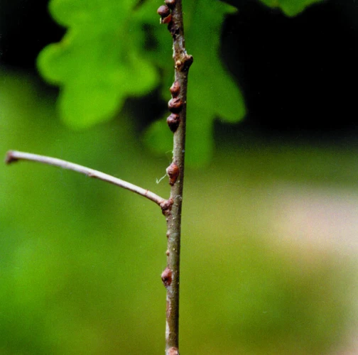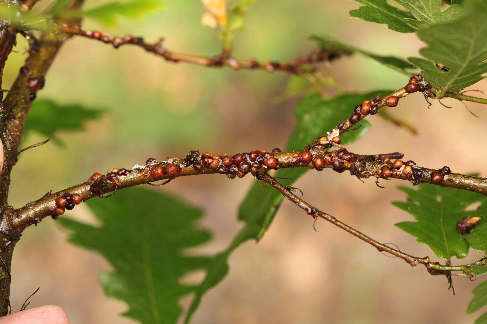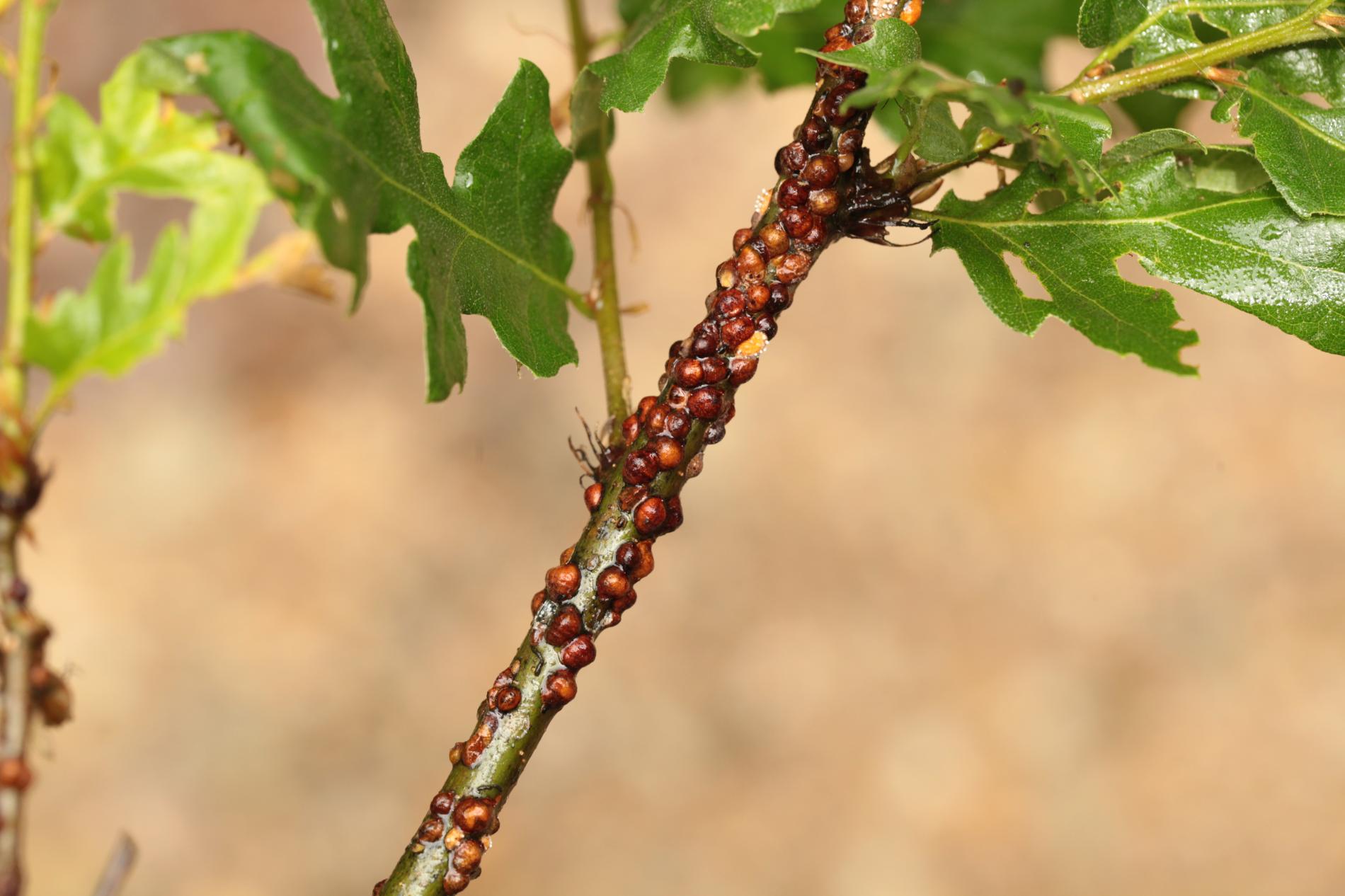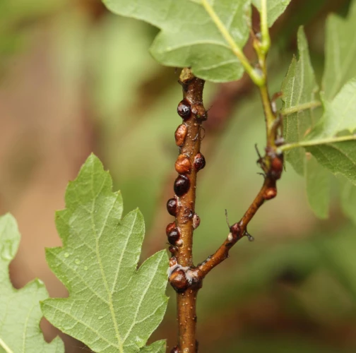 Hnedé, okrúhle, asi 3 – 4 mm veľké útvary na výhonkoch.