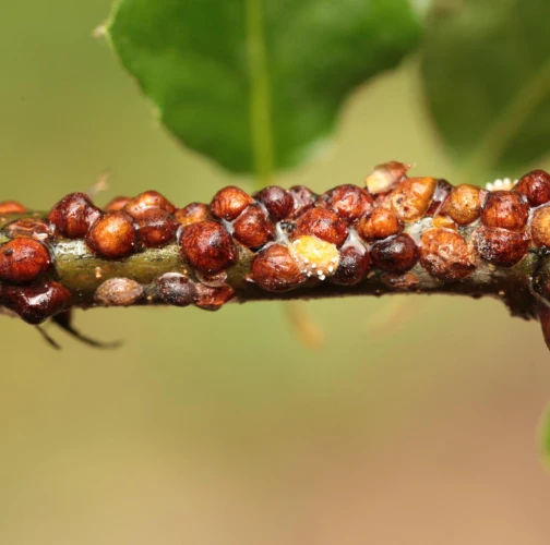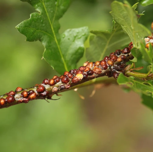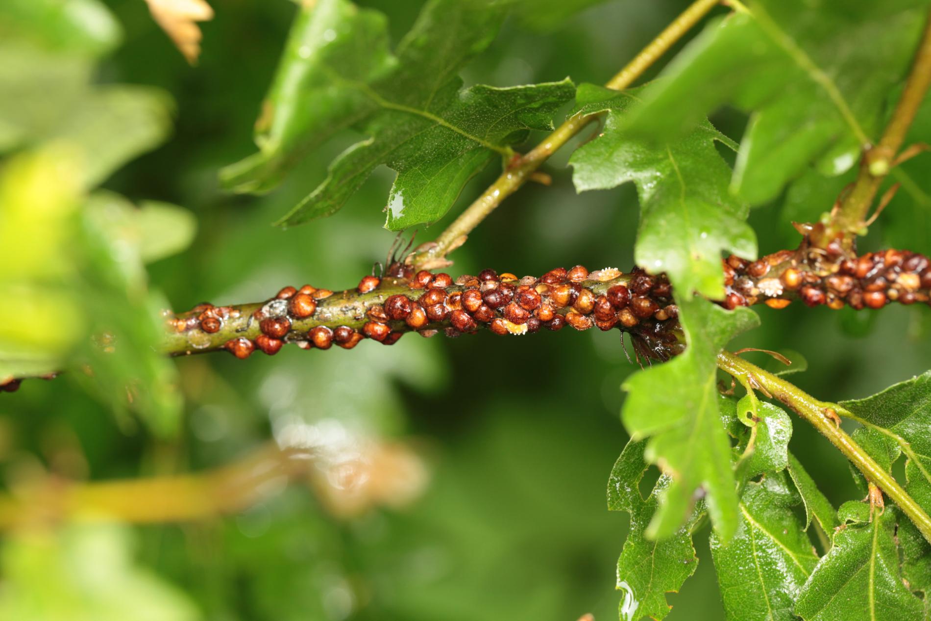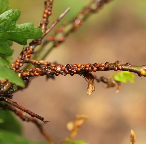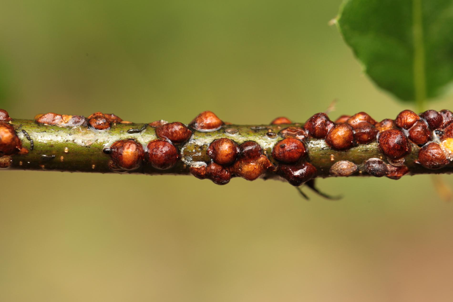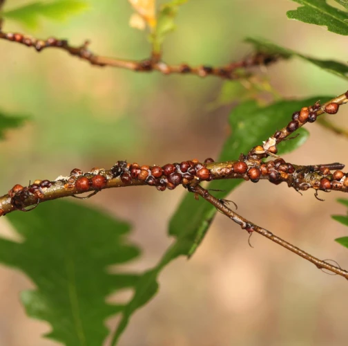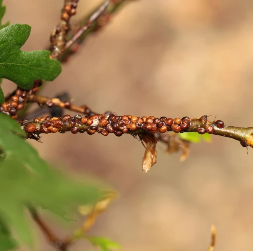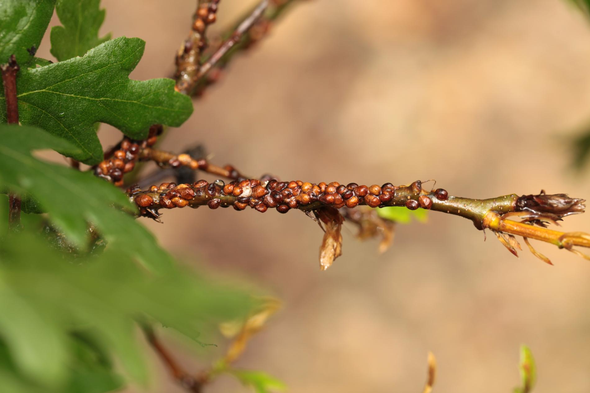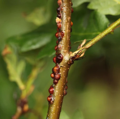 Hnedé, okrúhle, asi 3 – 4 mm veľké útvary na výhonkoch.