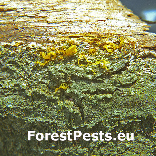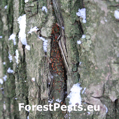 Infikovaná kôra praská, vznikajú charakteristické rakovinové rany.