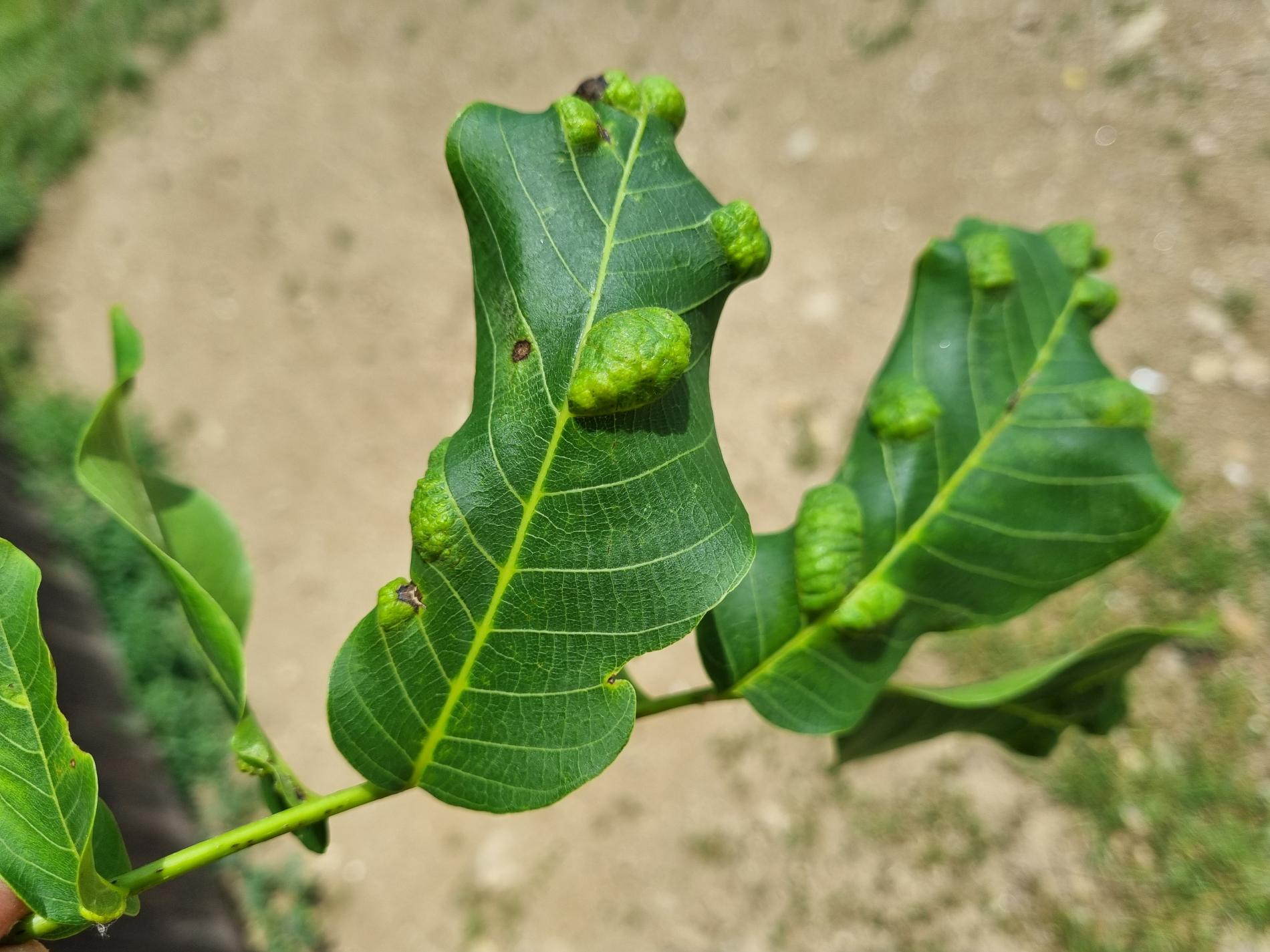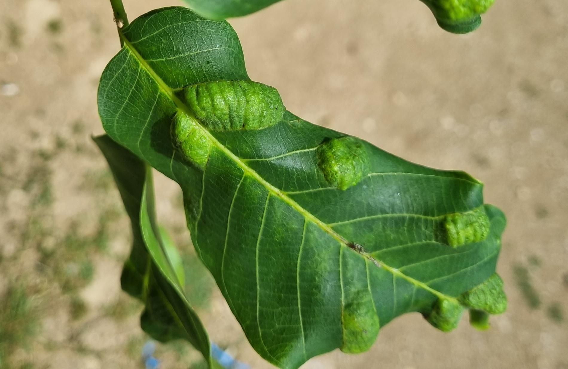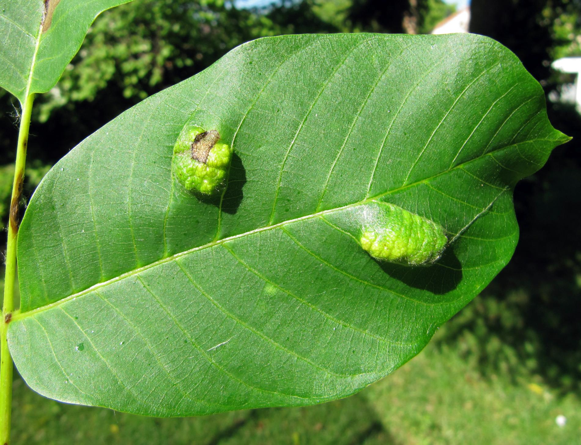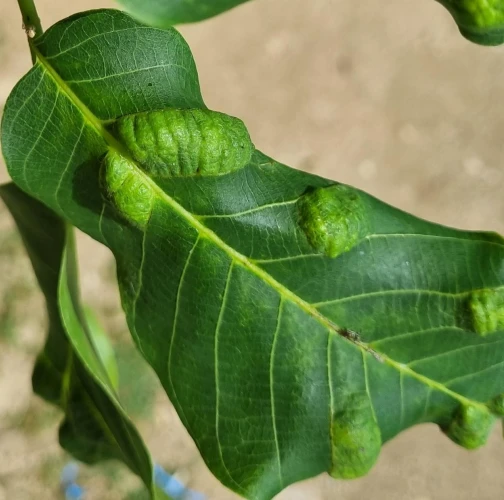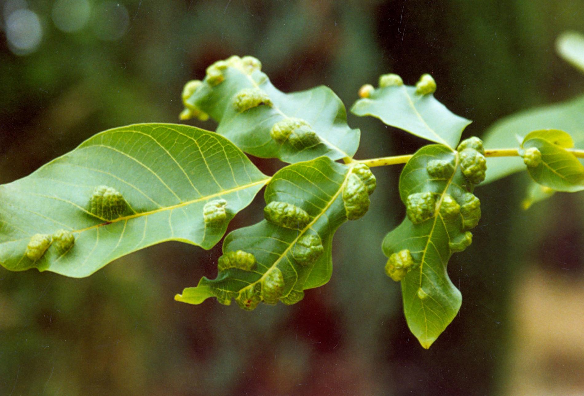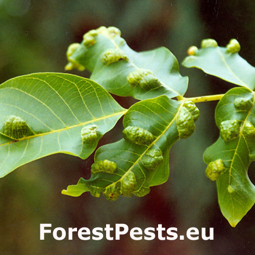 Zdureniny na listoch vytvárajúce svetlý hrboľ na vrchnej strane listu. Plstenný povlak na spodnej strane listu.