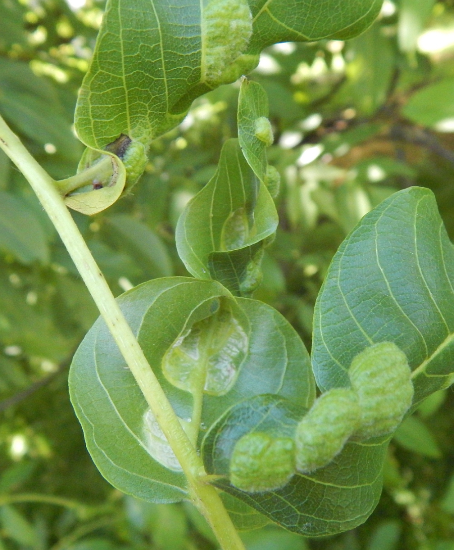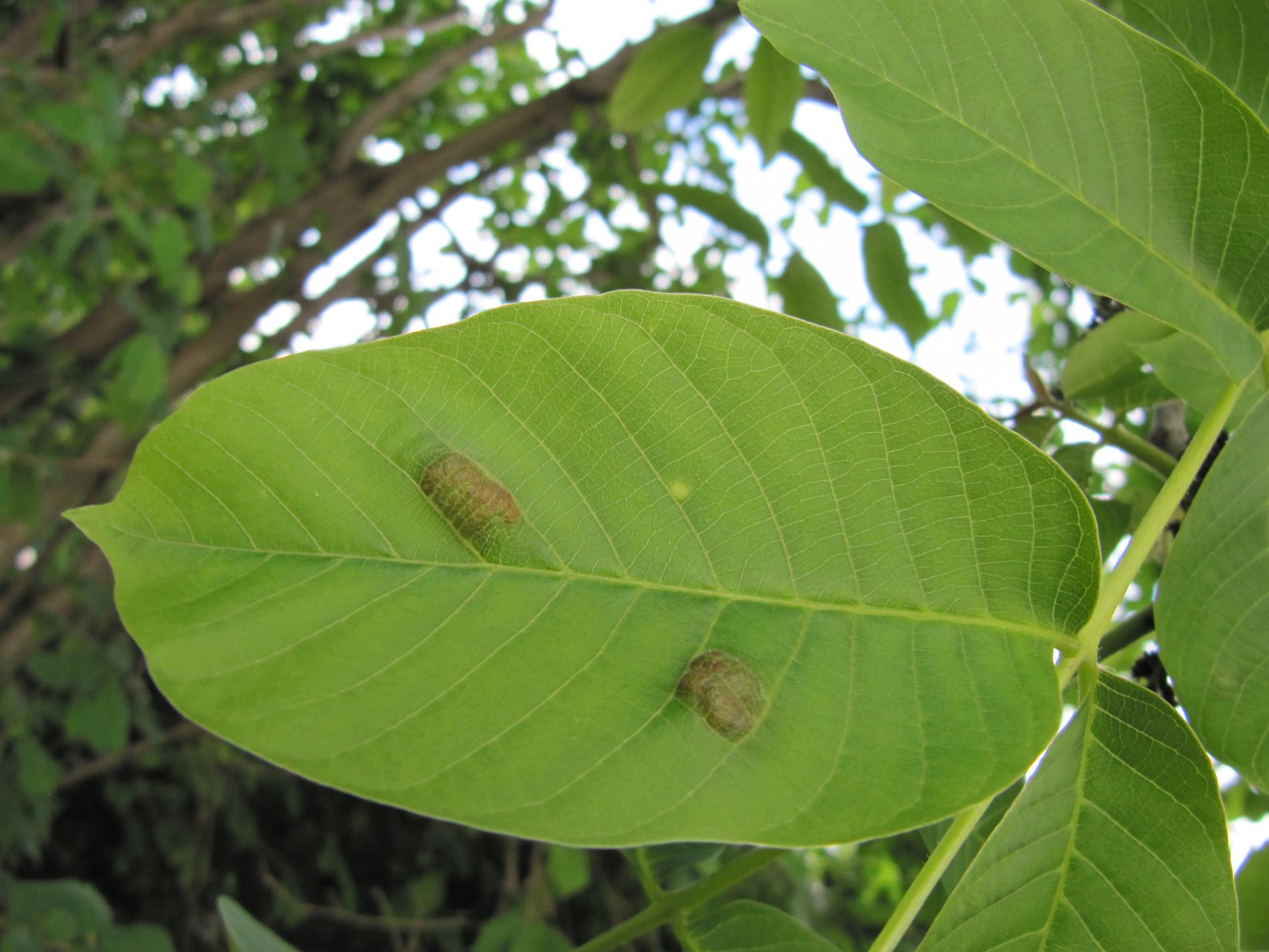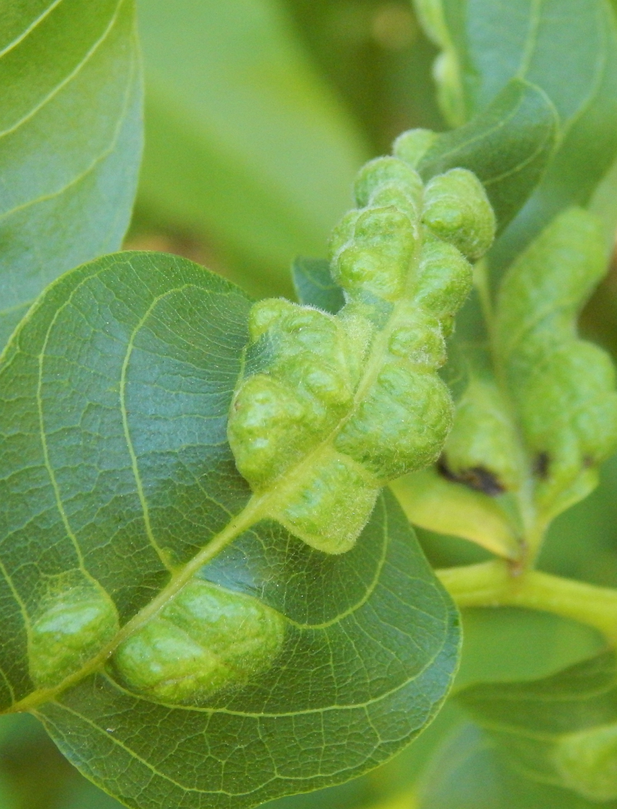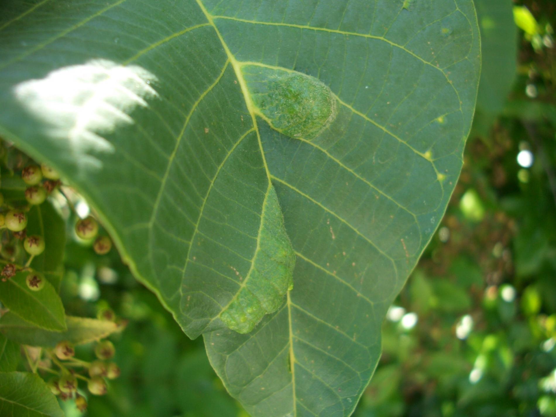 Zdureniny na listoch vytvárajúce svetlý hrboľ na vrchnej strane listu. Plstenný povlak na spodnej strane listu.