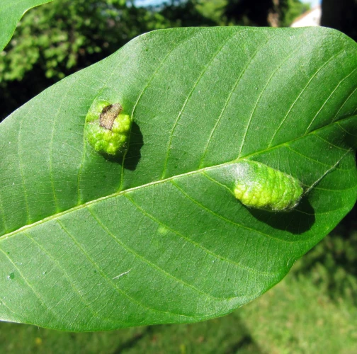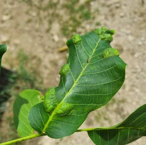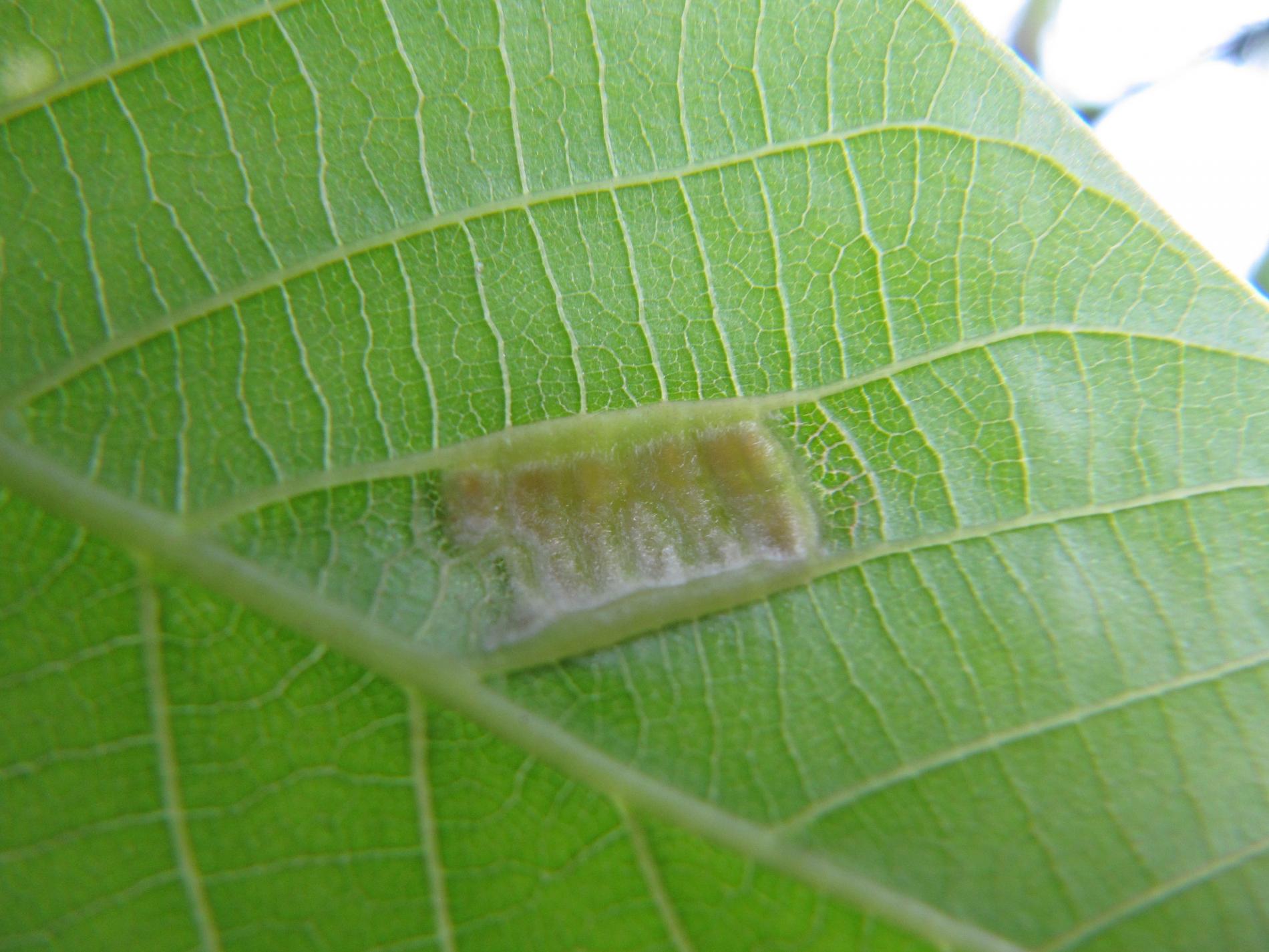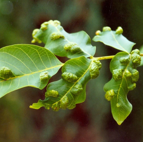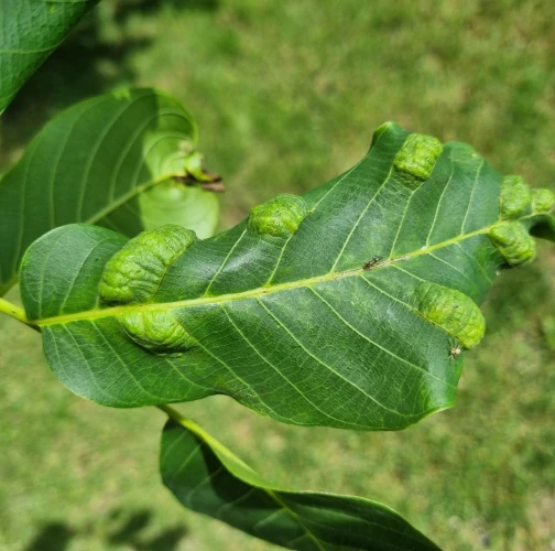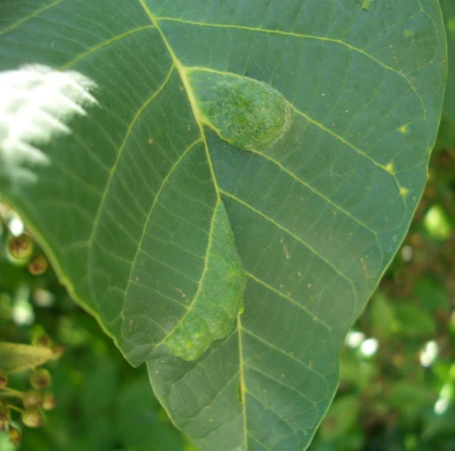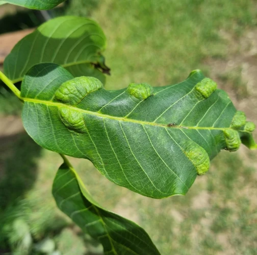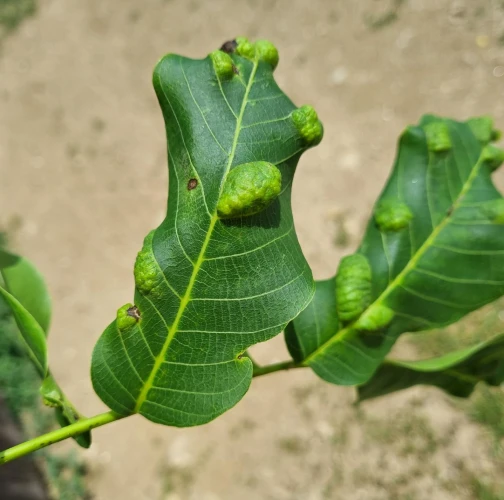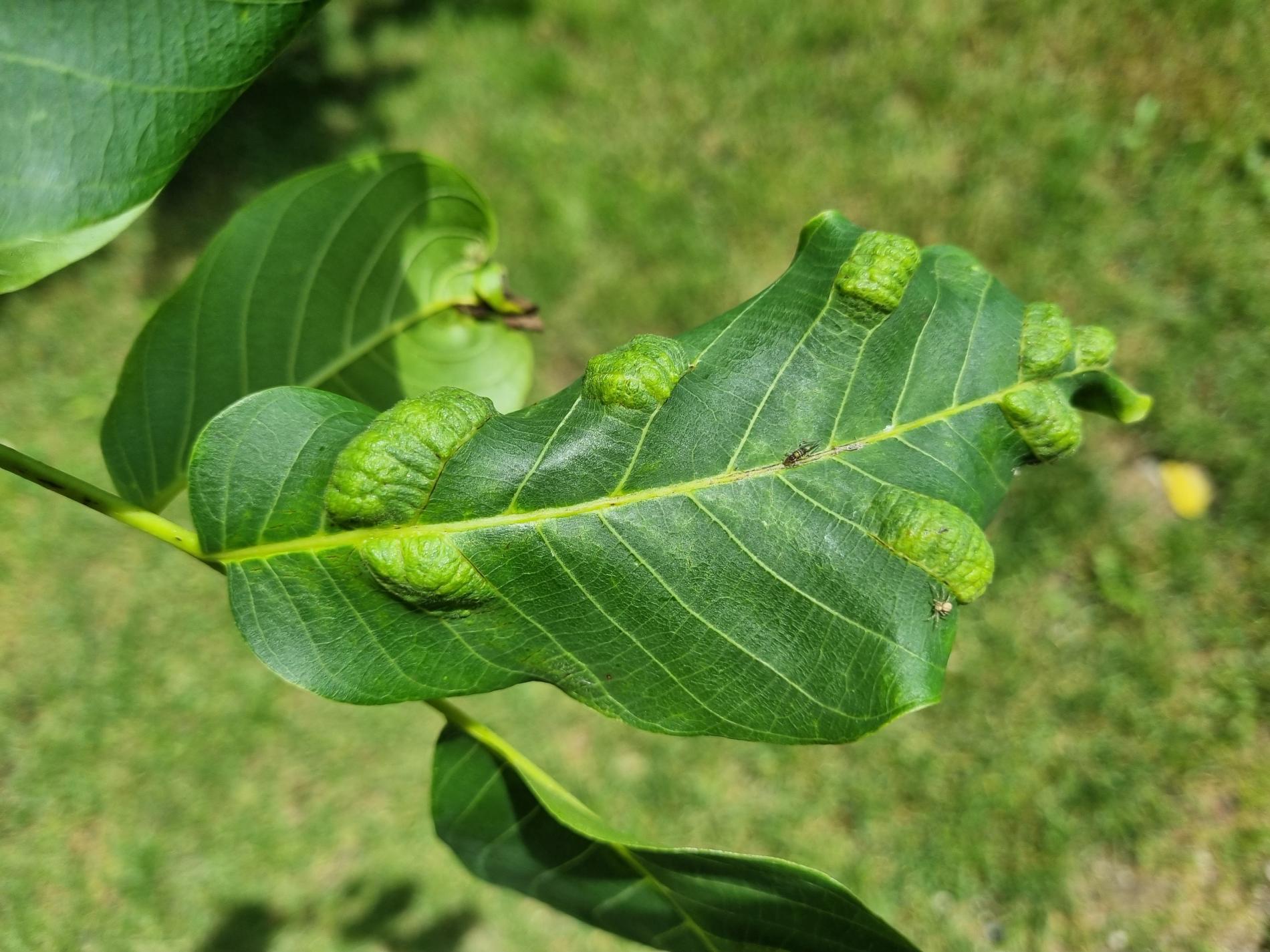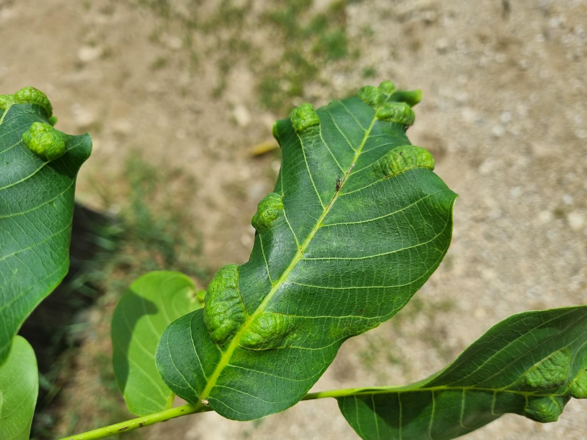 Zdureniny na listoch vytvárajúce svetlý hrboľ na vrchnej strane listu. Plstenný povlak na spodnej strane listu.