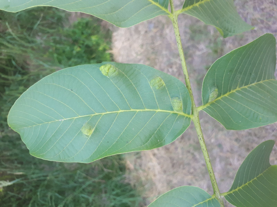 Aceria erinea je drobný roztoč veľký cca 0,08–0,2 mm. Prezimuje pri púčiku a na jar napáda rašiace listy. Výduť na vrchnej strane listu, rôzneho tvaru a veľkosti. Na spodnej strane výdute sa tvorí plstnatý povlak.