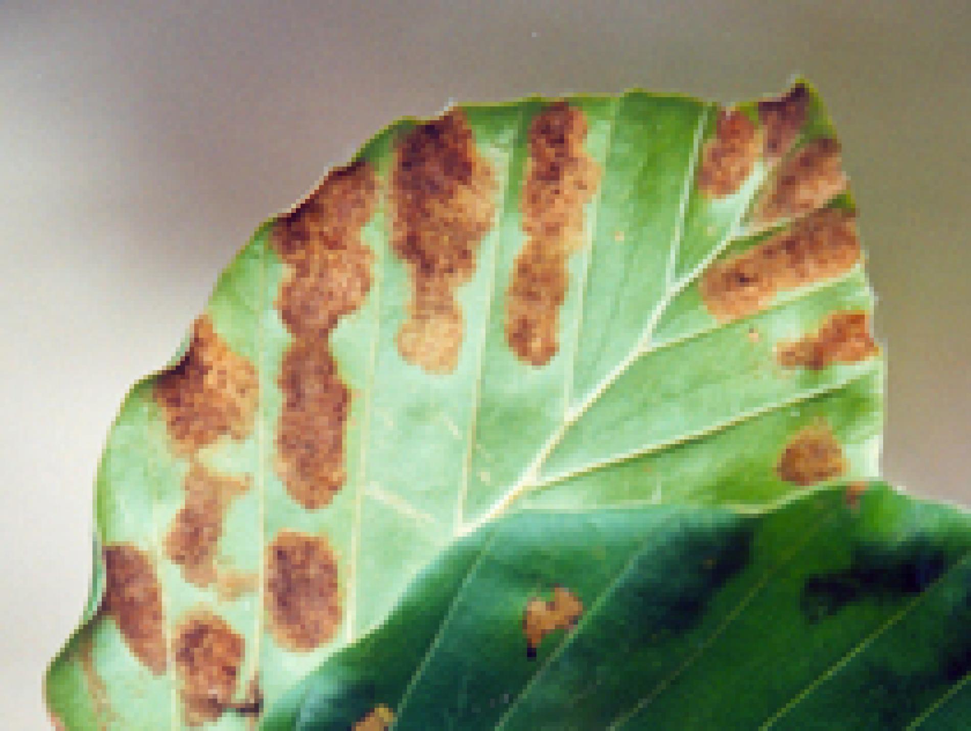 Hrdzavé povlaky na spodnej strane listu.