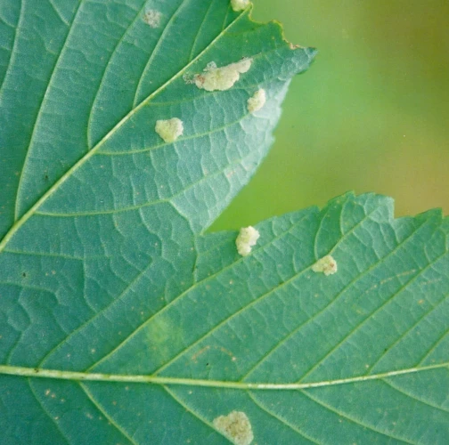 Na spodnej strane listu sa tvoria plôšky veľkosti do 1 cm, na ktorých sa vytvára plstený, ochlpený povlak. List je z vrchnej strany akoby pofŕkaný svetlozelenou farbou.