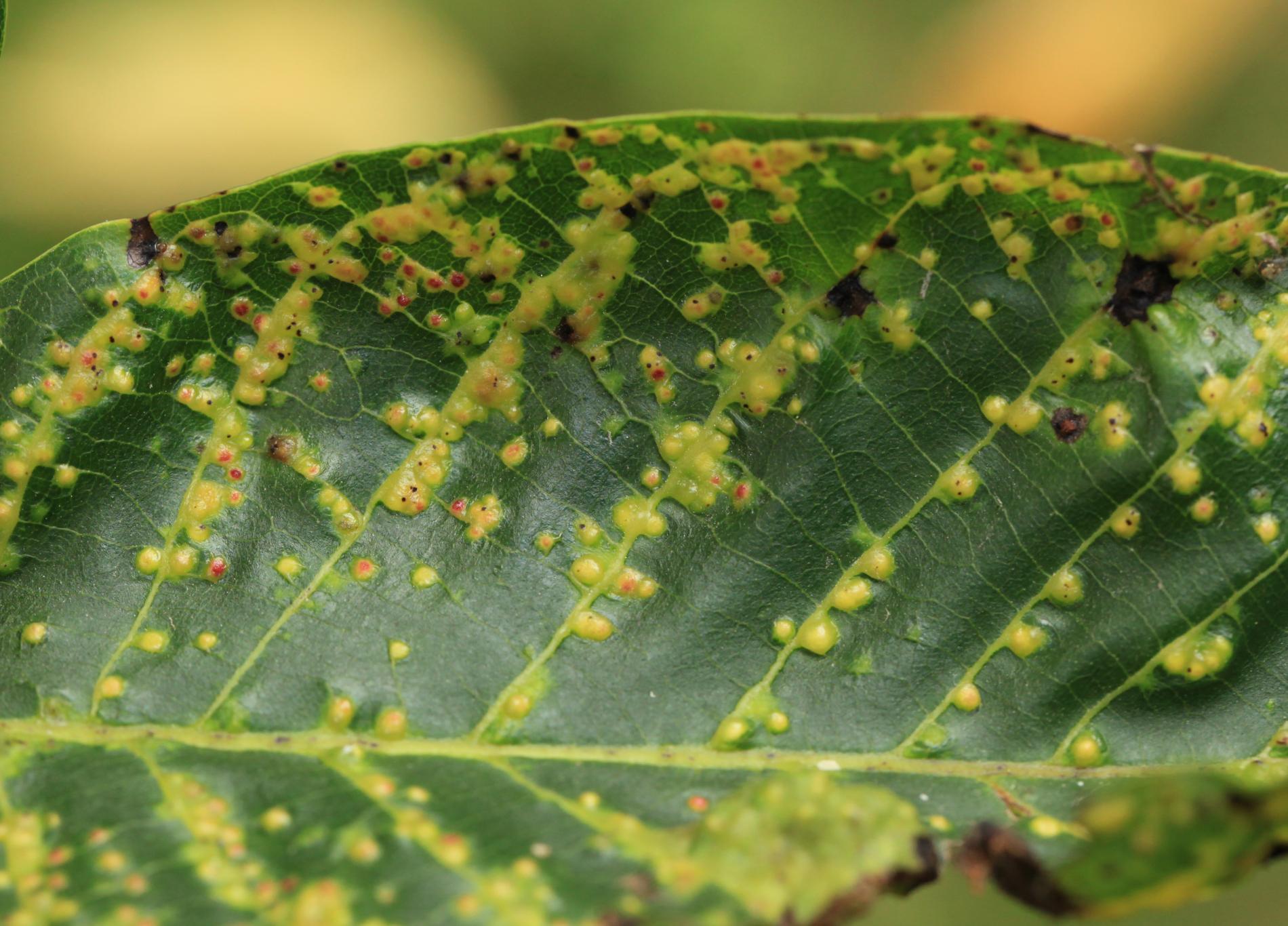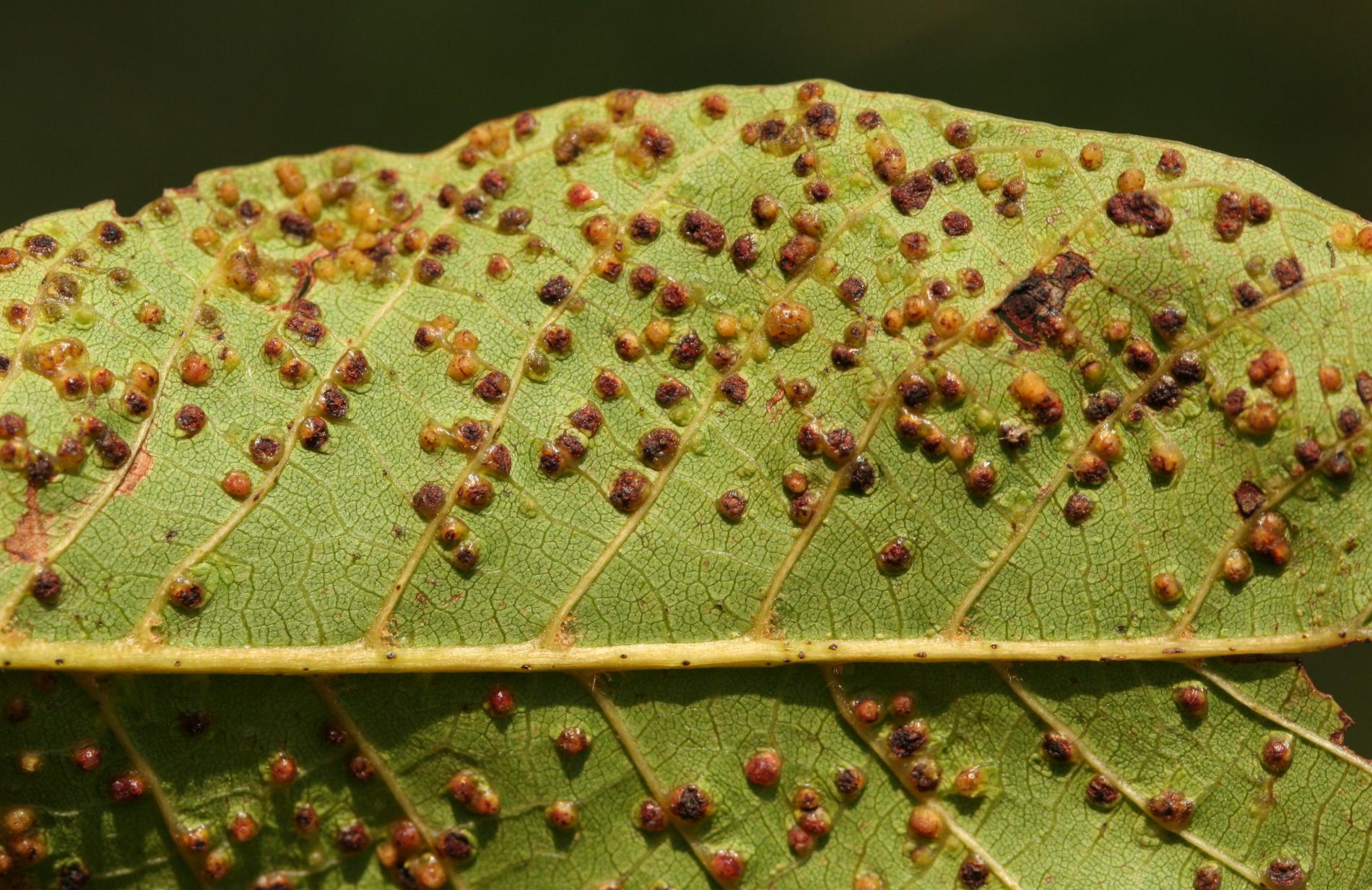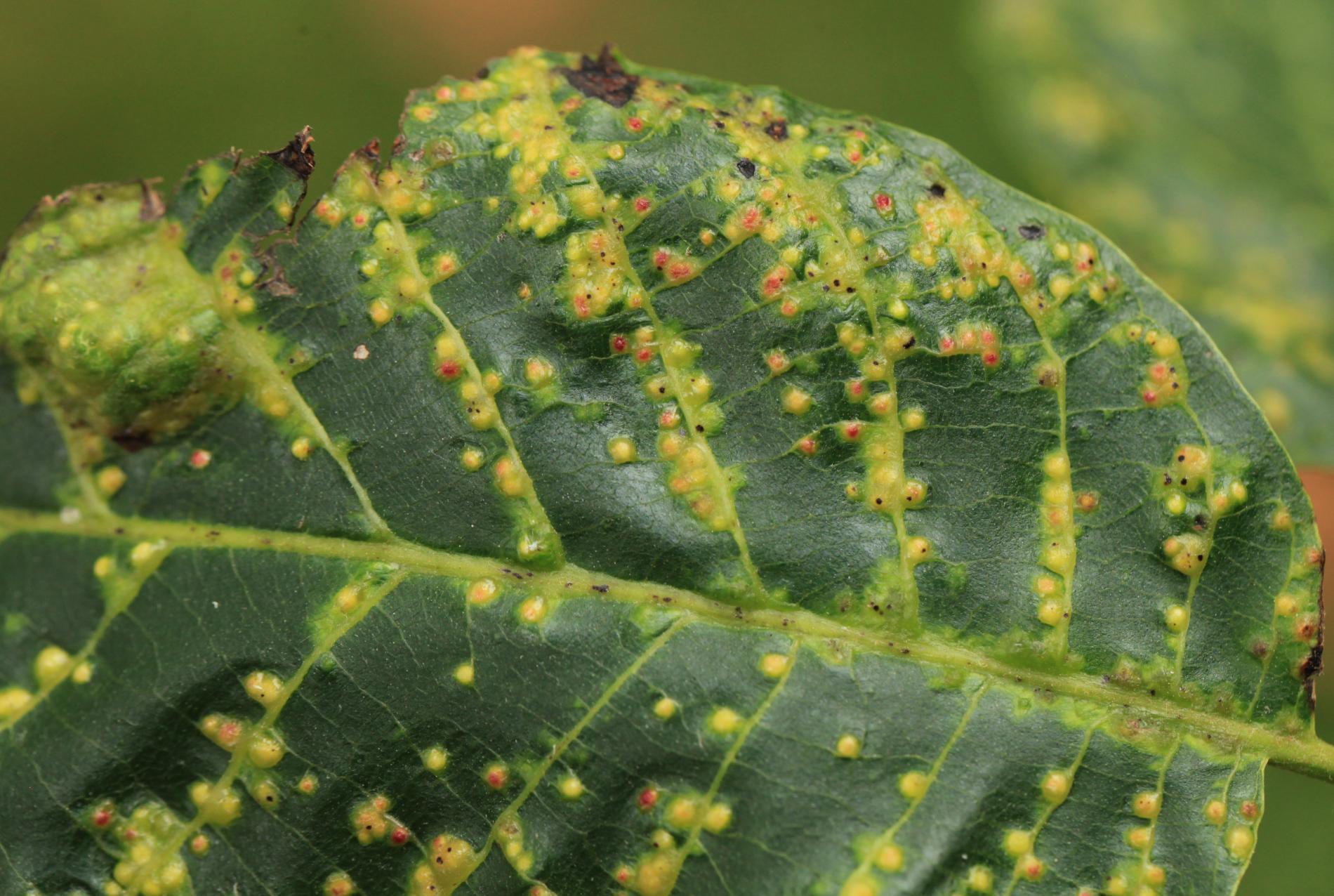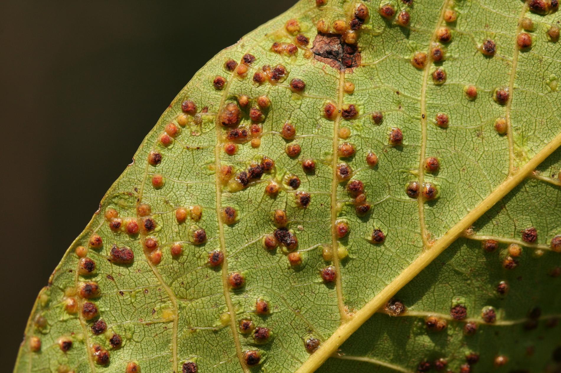 Okrúhle hrbolčeky/bradavičky veľkosti 1-2 milimetre na listoch. Viditeĺné dobre na obidvoch stranách. Najskôr žlto zelené, neskôr zeleno hnedé. V prípade vhodných podmienok veľmi hojne sa nachádzajúce na listoch. Častý v záhradách, parkoch a plantážach. Môže postihovať aj plody.