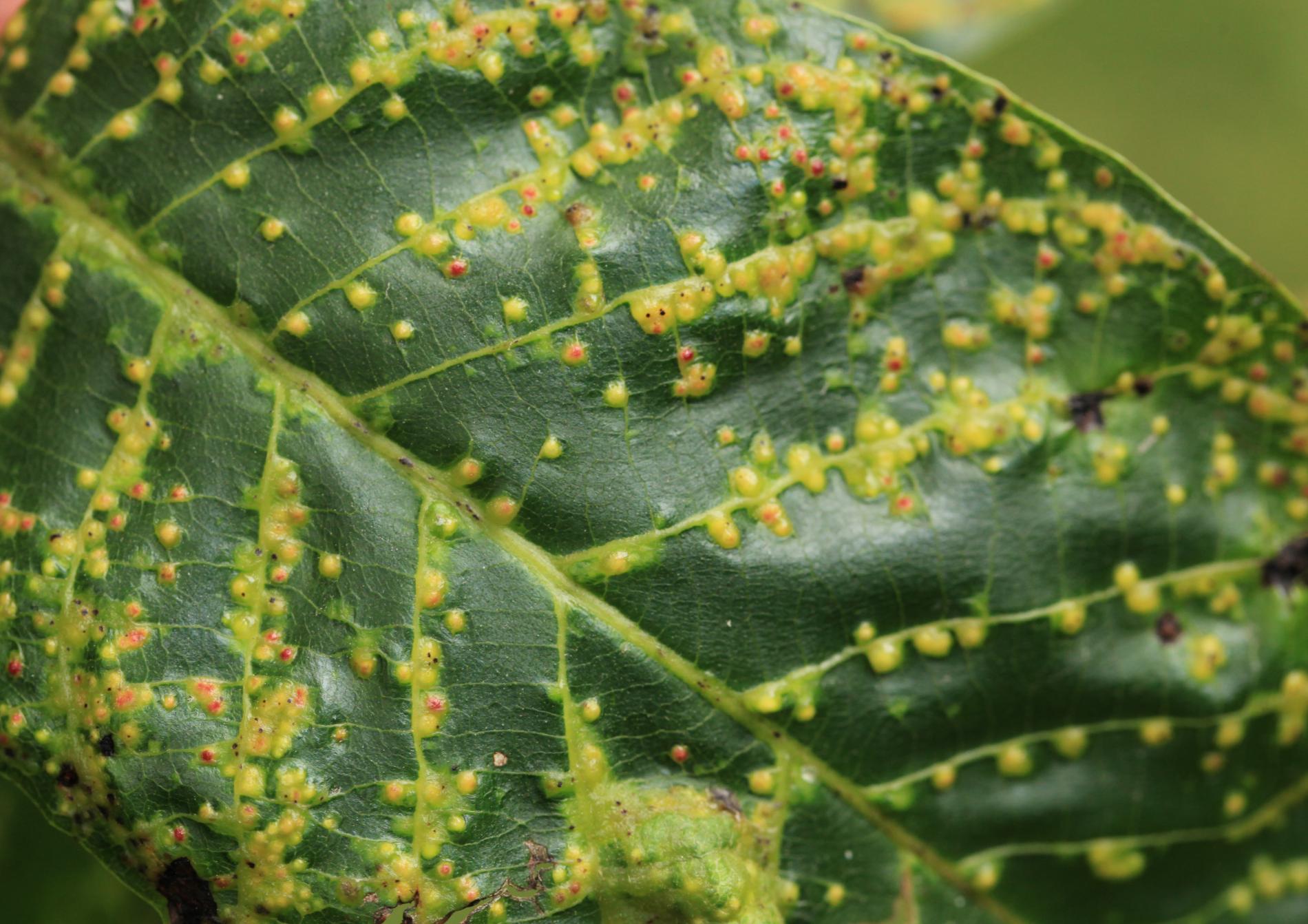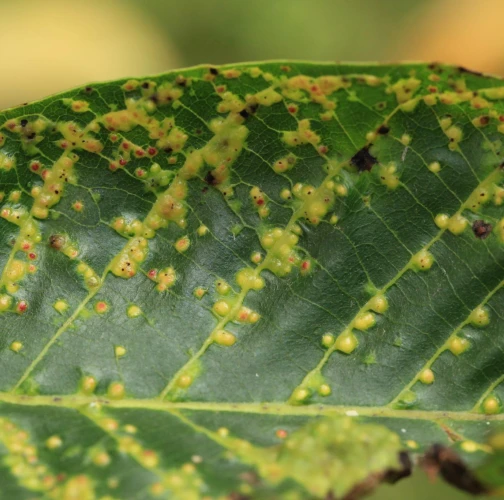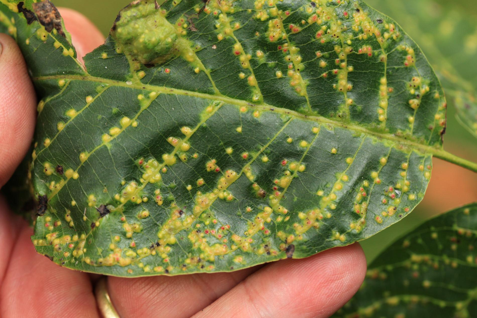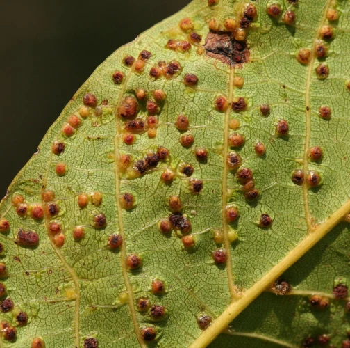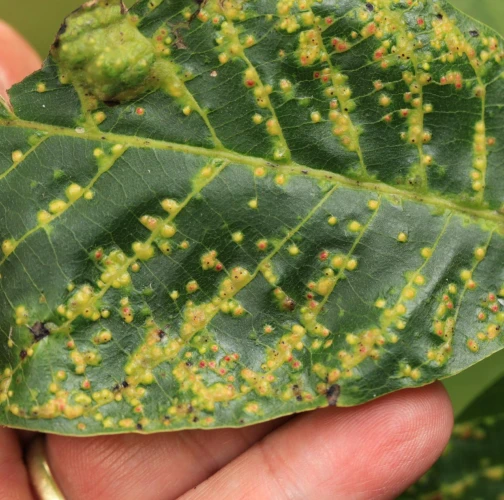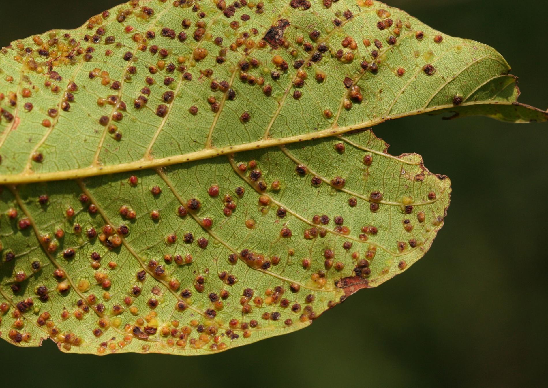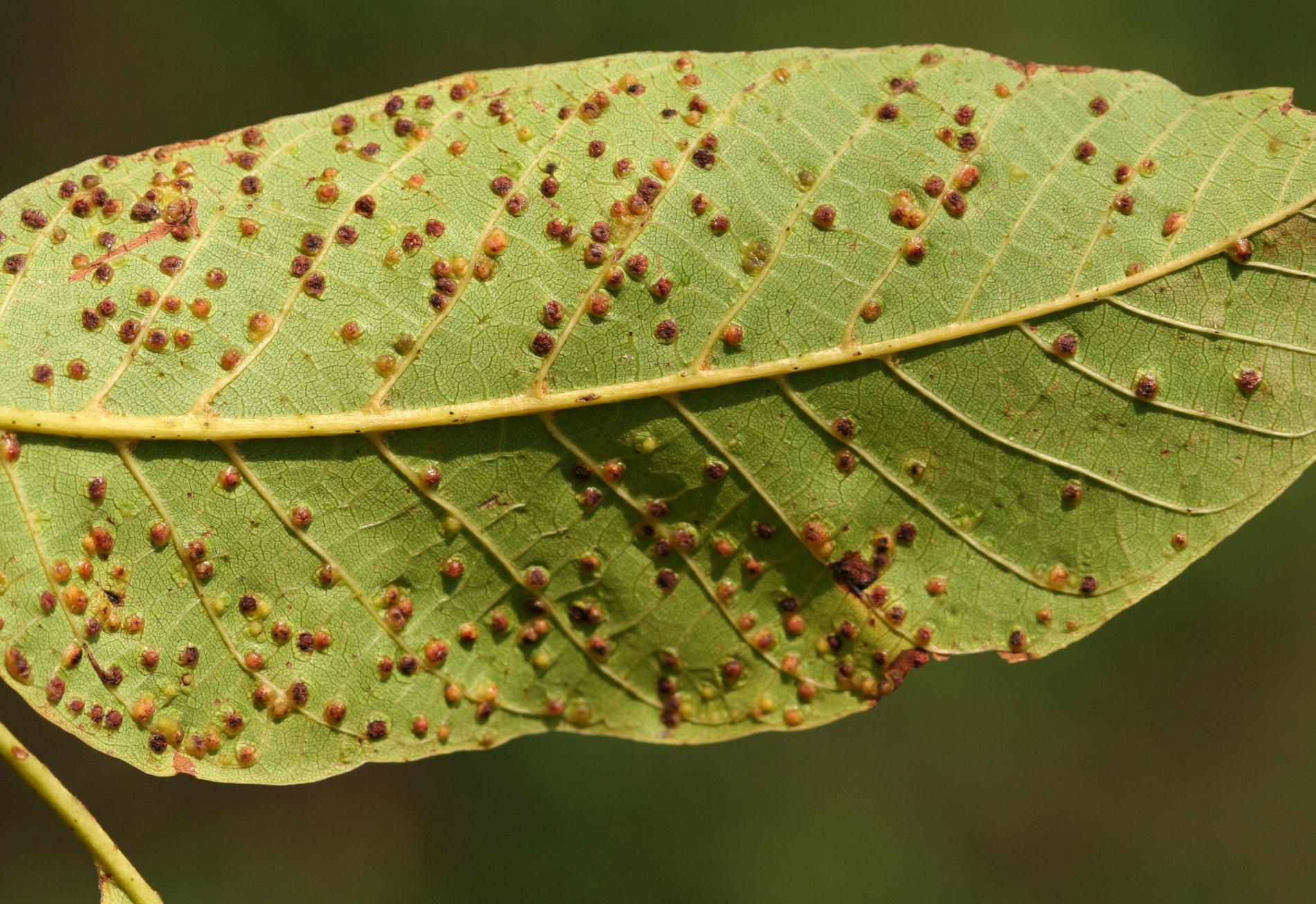 Okrúhle hrbolčeky/bradavičky veľkosti 1-2 milimetre na listoch. Viditeĺné dobre na obidvoch stranách. Najskôr žlto zelené, neskôr zeleno hnedé. V prípade vhodných podmienok veľmi hojne sa nachádzajúce na listoch. Častý v záhradách, parkoch a plantážach. Môže postihovať aj plody.