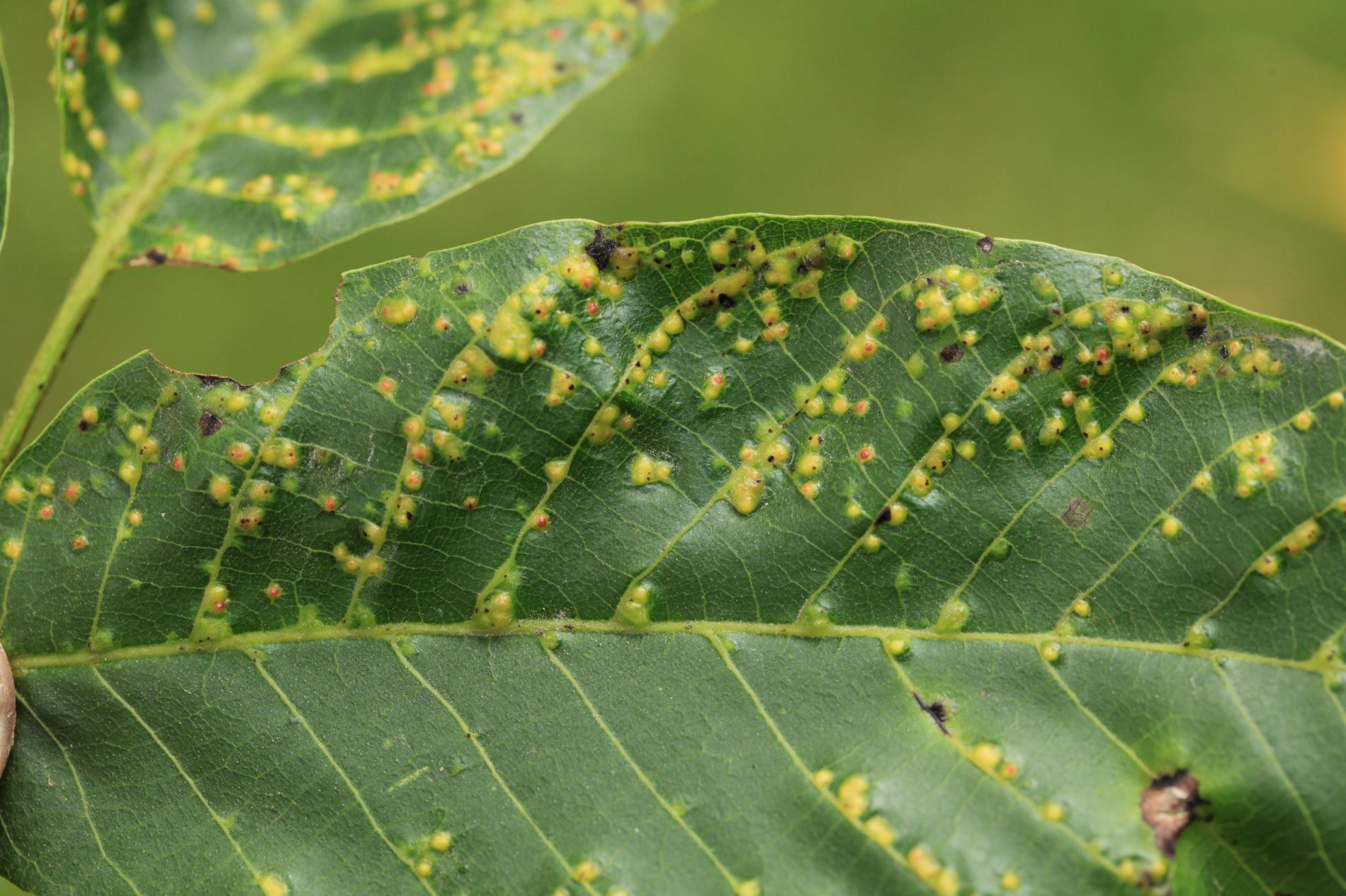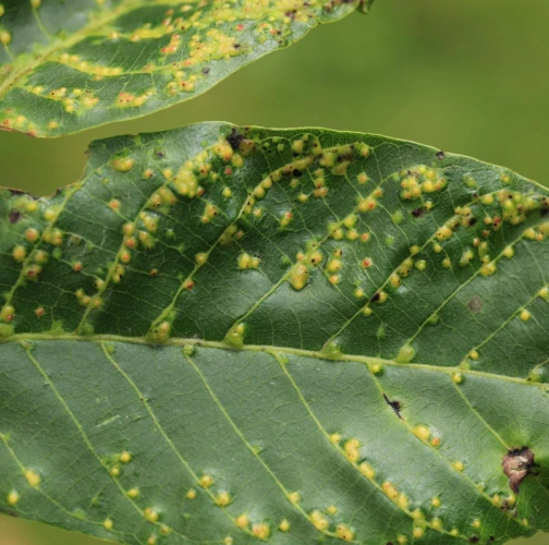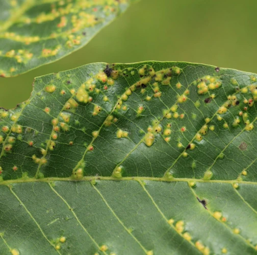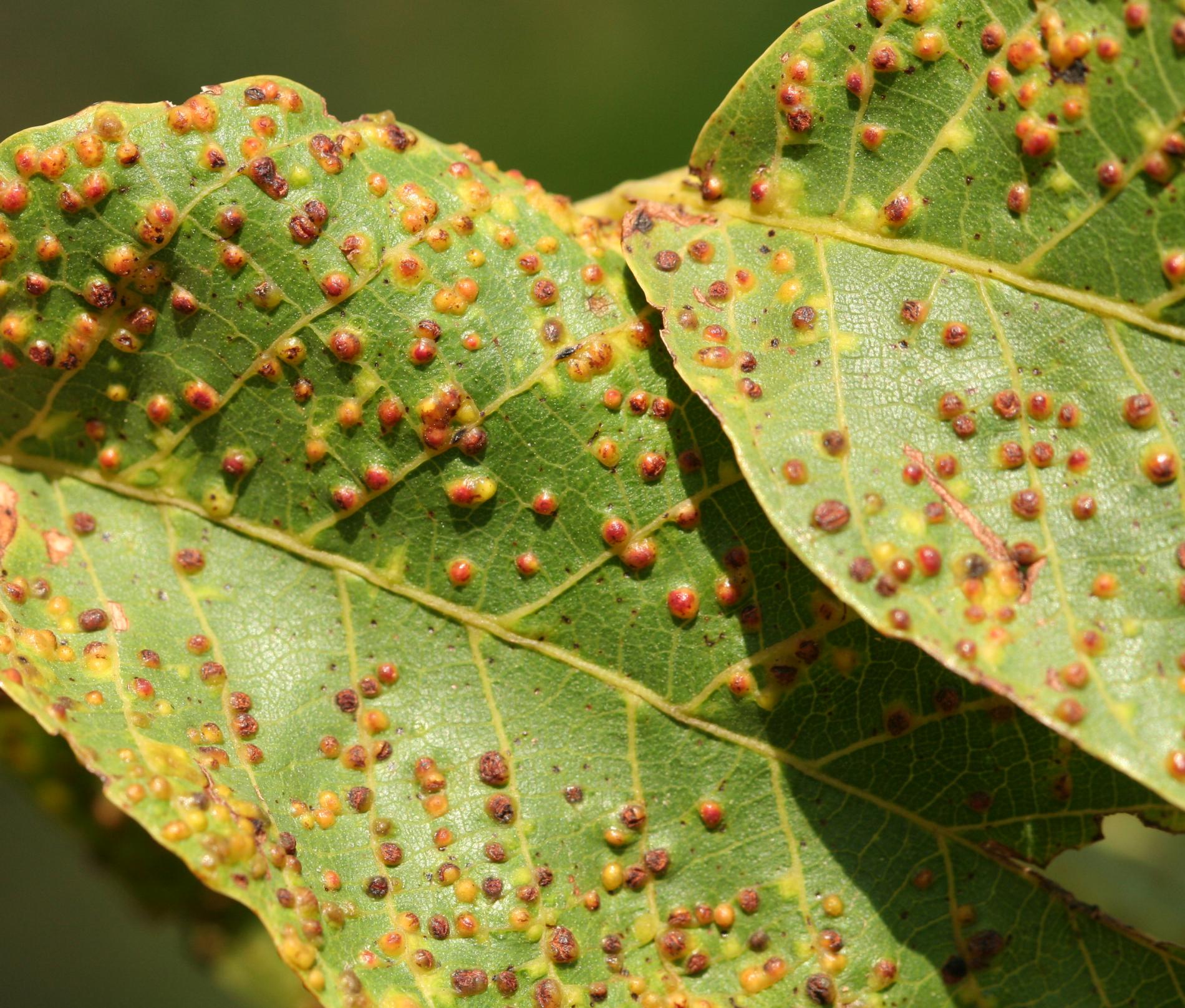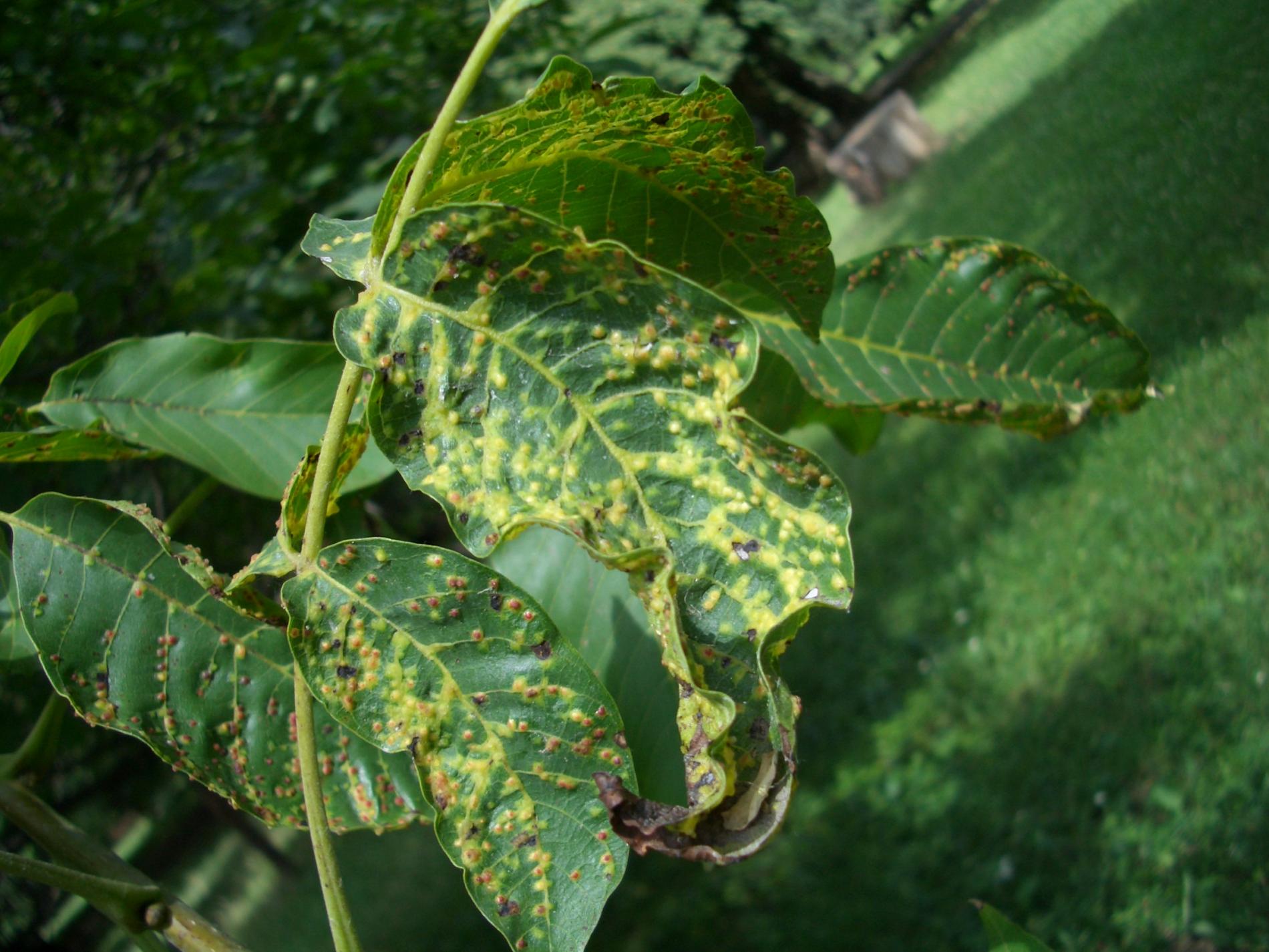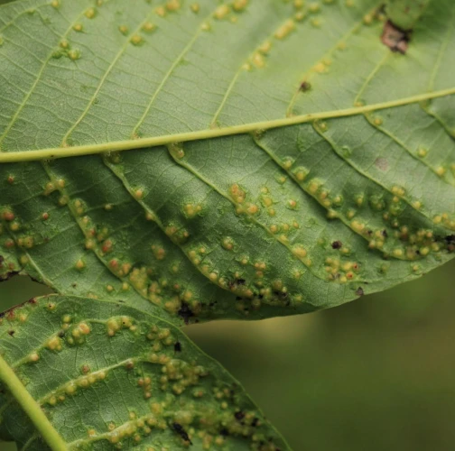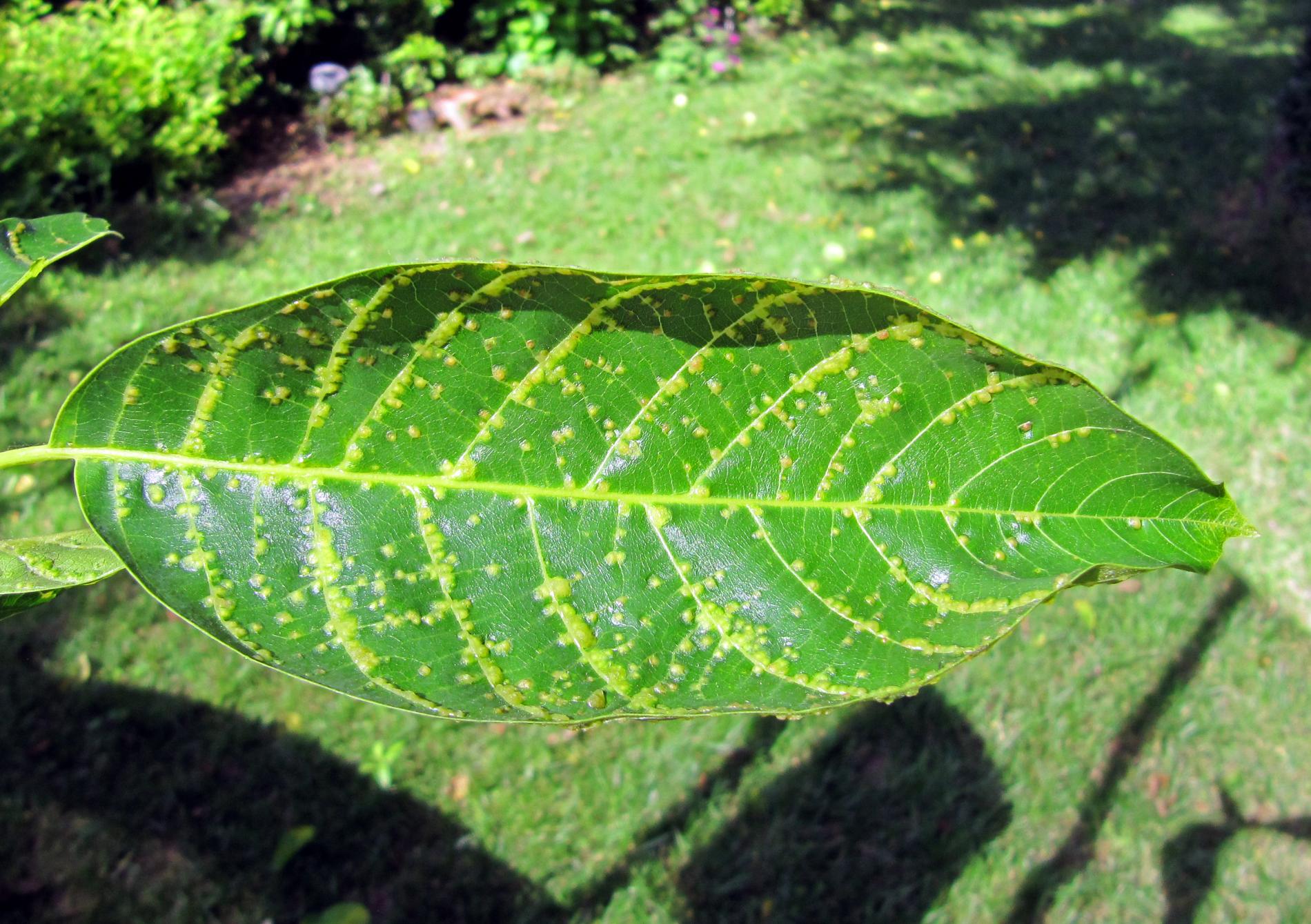 Okrúhle hrbolčeky/bradavičky veľkosti 1-2 milimetre na listoch. Viditeĺné dobre na obidvoch stranách. Najskôr žlto zelené, neskôr zeleno hnedé. V prípade vhodných podmienok veľmi hojne sa nachádzajúce na listoch. Častý v záhradách, parkoch a plantážach. Môže postihovať aj plody.