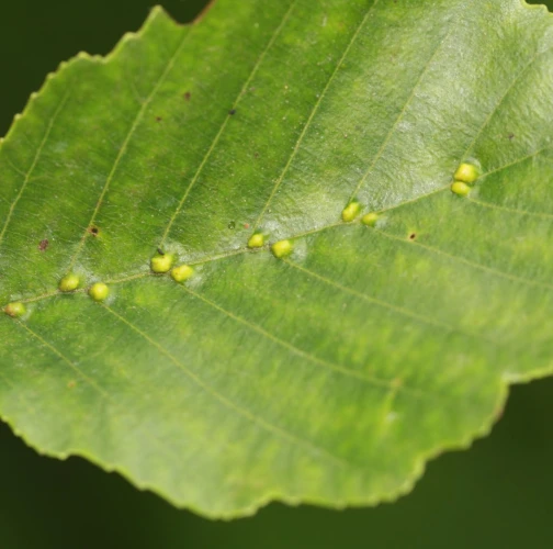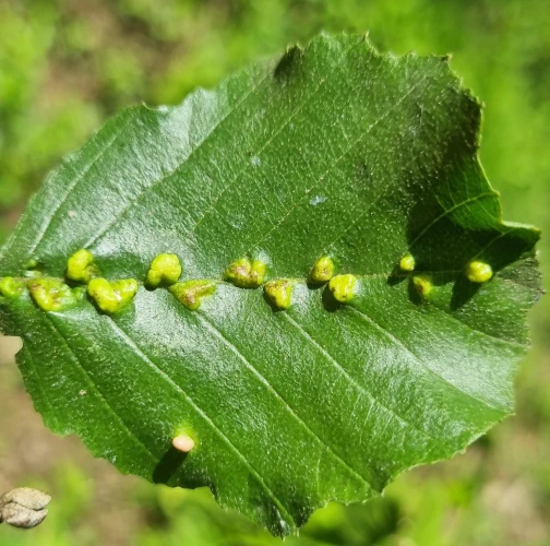 Drobné nádory (obyčajne dva vedľa sebe) na báze bočných žiliek.